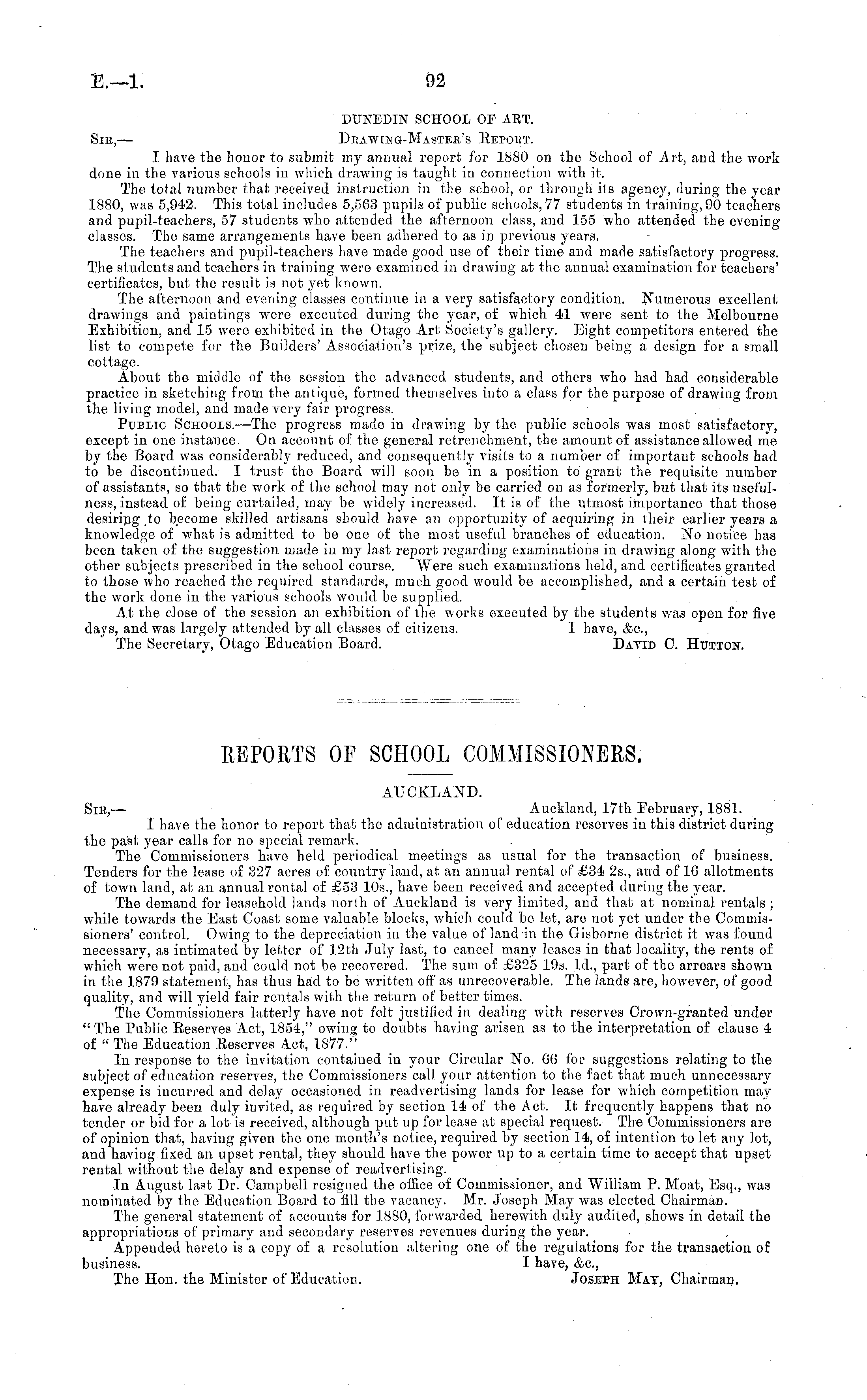 DUNEDIN SCHOOL OF ART. Sir, — Drawing-Master's Report. I have the honor to submit my annual report for 1880 on the School of Art, and the work done in the various schools in which drawing is taught in connection with it. The total number that received instruction in the school, or through its agencj', during the year 1880, was 5,942. This total includes 5,563 pupils of public schools, 77 students in training, 90 teachers and pupil-teachers, 57 students who attended the afternoon class, and 155 who attended the evening classes. The same arrangements have been adhered to as in previous years. The teachers and pupil-teachers have made good use of their time and made satisfactory progress. The students and teachers in training were examined in drawing at the annual examination for teachers' certificates, but the result is not yet known. The afternoon and evening classes continue in a very satisfactory condition. Numerous excellent drawings and paintings were executed during the year, of which 41 were sent to the Melbourne Exhibition, and 15 were exhibited in the Otago Art Society's gallery. Eight competitors entered the list to compete for the Builders' Association's prize, the subject chosen being a design for a small cottage. About the middle of the session the advanced students, and others who had had considerable practice in sketching from the antique, formed themselves into a class for the purpose of drawing from the living model, and made very fair progress. Public Schools. —The progress made in drawing by the public schools was most satisfactory, except in one instance. On account of the general retrenchment, the amount of assistance allowed me by the Board was considerably reduced, and consequently visits to a number of important schools had to be discontinued. I trust the Board will soon be in a position to grant the requisite number of assistants, so that the work of the school may not only be carried on as formerly, but that its usefulness, instead of being curtailed, may be widely increased. It is of the utmost importance that those desiring ,to become skilled artisans should have an opportunity of acquiring in their earlier years a knowledge of what is admitted to be one of the most useful branches of education. No notice has been taken of the suggestion made in my last report regarding examinations in drawing along with the other subjects prescribed in the school course. Were such examinations held, and certificates granted to those who reached the required standards, much good would be accomplished, and a certain test of the work done in the various schools would be supplied. At the close of the session an exhibition of the works executed by the students was open for five days, and was largely attended by all classes of citizens. I have, &c, The Secretary, Otago Education Board. David C. Hutton.