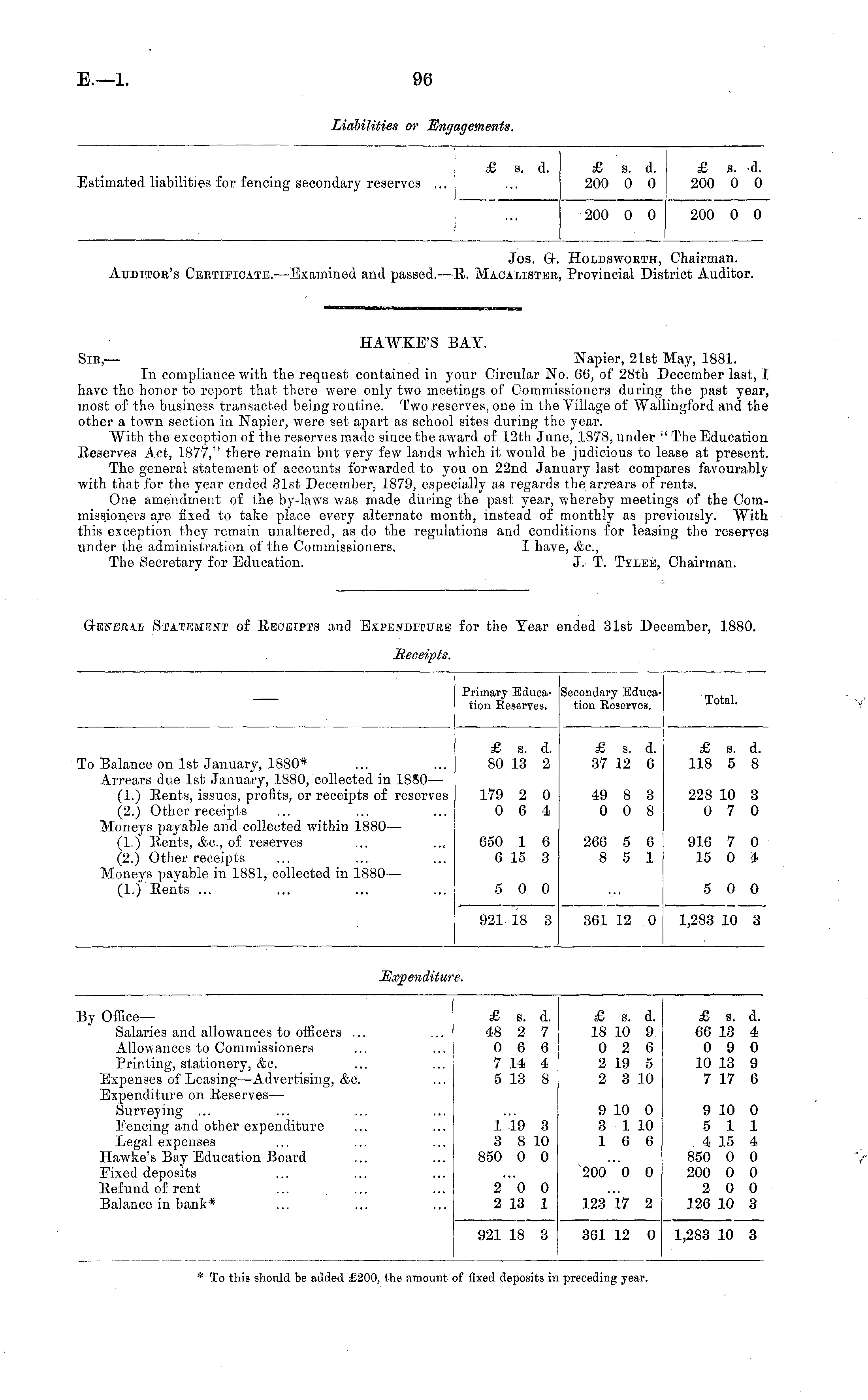 HAWKE'S BAY. Sir,— Napier, 21st May, 1881. In compliance with the request contained in your Circular No. 66, of 28th December last, I have the honor to report that there were only two meetings of Commissioners during the past year, most of the business transacted being routine. Two reserves, one in the Village of Wallingford and the other a town section in Napier, were set apart as school sites during the year. With the exception of the reserves made since the award of 12th June, 1878, under " The Education Reserves Act, 1877," there remain but very few lands which it would be judicious to lease at present. The general statement of accounts forwarded to you on 22nd January last compares favourably with that for the year ended 31st December, 1879, especially as regards the arrears of rents. One amendment of the by-laws was made during the past year, whereby meetings of the Commissioners are fixed to take place every alternate month, instead of monthly as previously. With this exception they remain unaltered, as do the regulations and conditions for leasing the reserves under the administration of the Commissioners. I have, &c, The Secretary for Education. J. T. Tylee, Chairman.
