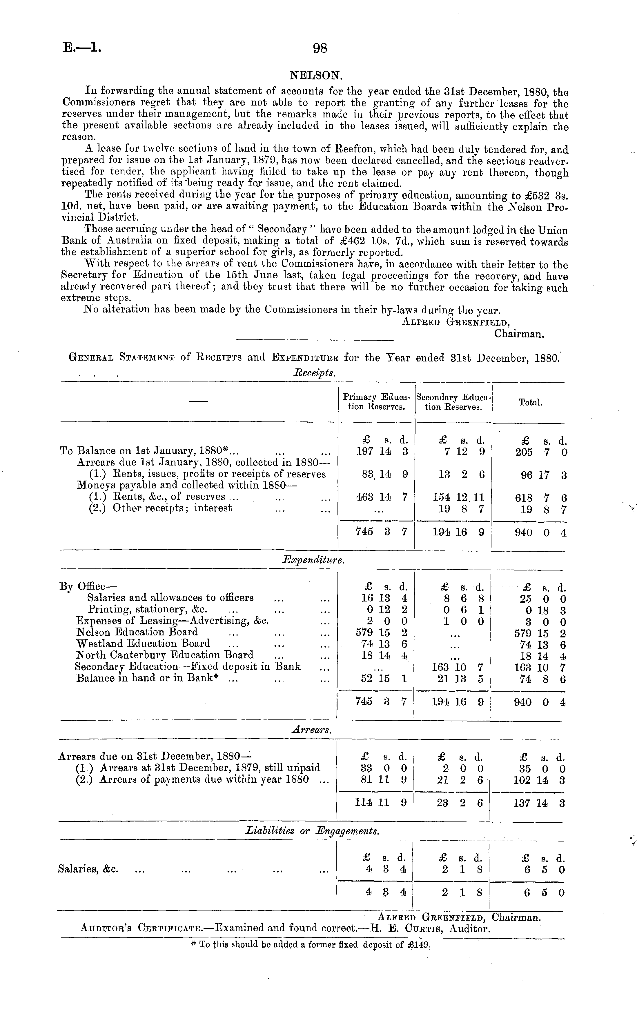 NELSON. In forwarding the annual statement of accounts for the year ended the 31st December, 1880, the Commissioners regret that they are not able to report the granting of any further leases for the reserves under their management, but the remarks made in their previous reports, to the effect that the present available sections are already included in the leases issued, will sufficiently explain the reason. A lease for twelve sections of land in the town of Reefton, which had been duly tendered for, and prepared for issue on the Ist January, 1879, has now been declared cancelled, and the sections readvertised for tender, the applicant having failed to take up the lease or pay any rent thereon, though repeatedly notified of its being ready for issue, and the rent claimed. The rents received during the year for the purposes of primary education, amounting to £532 3s. lOd. net, have been paid, or are awaiting payment, to the Education Boards within the Nelson Provincial District. Those accruing under the head of " Secondary " have been added to the amount lodged in the Union Bank of Australia on fixed deposit, making a total of £462 10s. 7d., which sum is reserved towards the establishment of a superior school for girls, as formerly reported. With respect to the arrears of rent the Commissioners have, in accordance with their letter to the Secretary for Education of the 15th June last, taken legal proceedings for the recovery, and have already recovered part thereof; and they trust that there will be no further occasion for taking such extreme steps. No alteration has been made by the Commissioners in their by-laws during the year. Alfeed Geeenfield, Chairman.