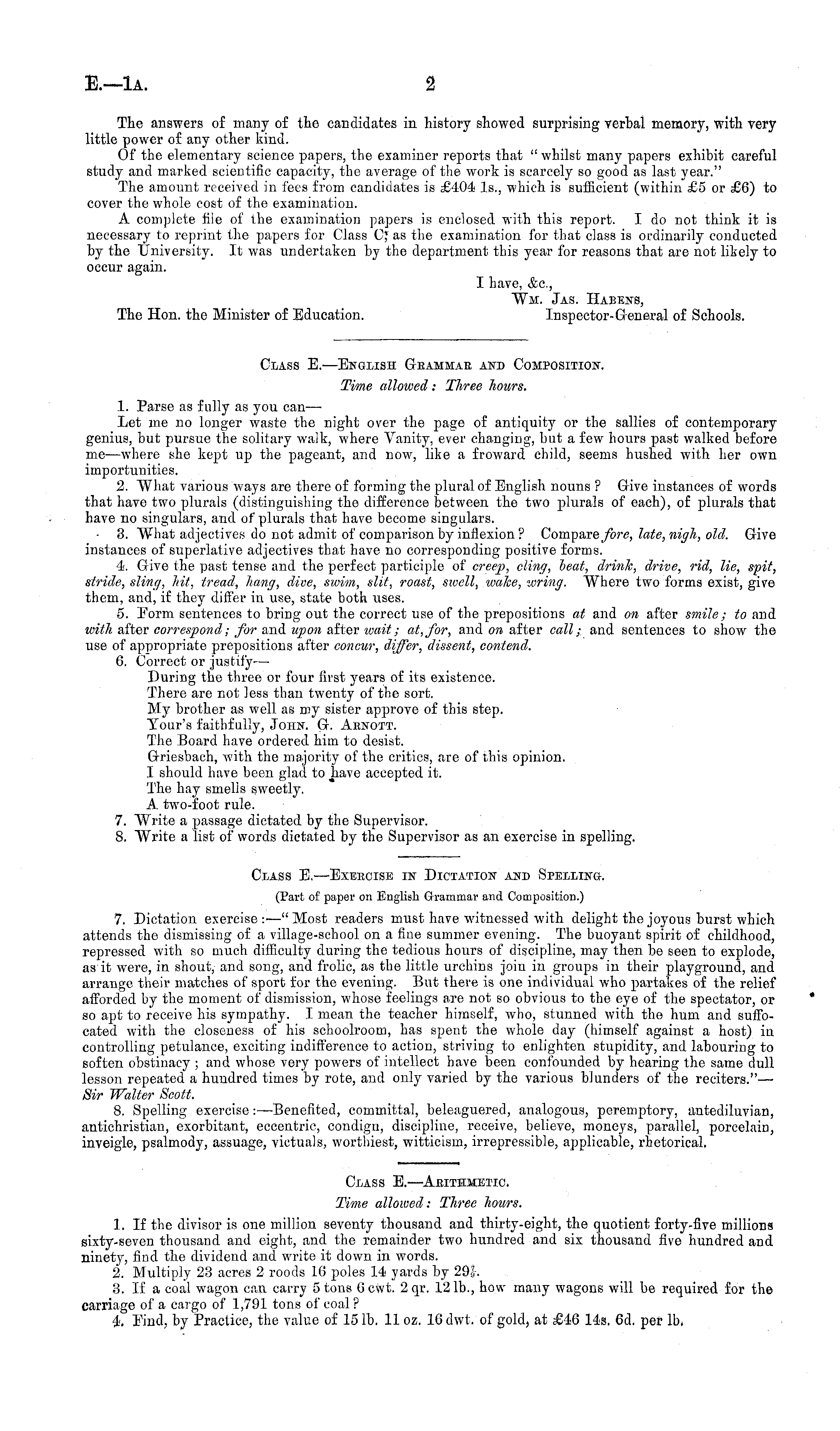 Class E. —Exeecise in Dictation and Spelling. (Part of paper on English Grammar and Composition.) 7. Dictation exercise:—"Most readers must have witnessed with delight the joyous burst which attends the dismissing of a village-school on a fine summer evening. The buoyant spirit of childhood, repressed with so much difficulty during the tedious hours of discipline, may then be seen to explode, as it were, in shout, and song, and frolic, as the little urchins join in groups in their playground, and arrange their matches of sport for the evening. But there is one individual who partakes of the relief afforded by the moment of dismission, whose feelings are not so obvious to the eye of the spectator, or so apt to receive his sympathy. I mean the teacher himself, who, stunned with the hum and suffocated with the closeness of his schoolroom, has spent the whole day (himself against a host) in controlling petulance, exciting indifference to action, striving to enlighten stupidity, and labouring to soften obstinacy ; and whose very powers of intellect have been confounded by hearing the same dull lesson repeated a hundred times by rote, and only varied by the various blunders of the reciters."— Sir Walter Scott. 8. Spelling exercise: —Benefited, committal, beleaguered, analogous, peremptory, antediluvian, antichristian, exorbitant, eccentric, condign, discipline, receive, believe, moneys, parallel, porcelain, inveigle, psalmody, assuage, victuals, worthiest, witticism, irrepressible, applicable, rhetorical.