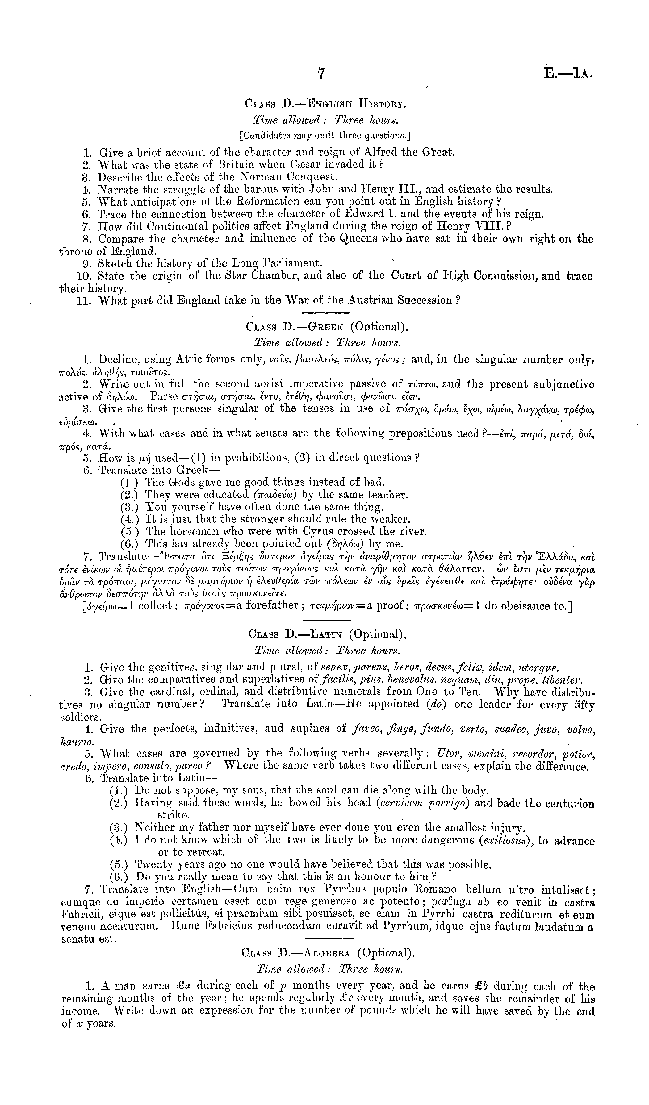 Class D. —Geeek (Optional). Time allowed: Three hours. 1. Decline, using Attic forms only, raw, /3acri\€vs, ttoXis, yeras; and, in the singular number only, ttoXus, u\-rj6ri<;, to.ovtos. 2. Write out in full the second aorist imperative passive of tuVtoj, and the present subjunctive active of Sfkoco. Parse crrrjcrai, crTr/crai, Ivto, irtdrj, <f>avovcri, rpaviocri, etev. 3. Give the first persons singular of the tenses in use of -n-daxco, bpdui, _x_o, alpico, Xay^avia, rpitjxi), eipio-Ktti. 4. With what cases and in what senses are the following prepositions used?— hrl, irapd, p,trd, Sid, Trpos, Kara. 5. How is pvr'i used —(1) in prohibitions, (2) in direct questions ? 6. Translate into Greek — (1.) The Gods gave me good things instead of bad. (2.) They were educated (TrcuSeom) by the same teacher. (3.) You yourself have often done the same thing. (4.) It is just that the stronger should rule the weaker. (5.) The horsemen who were with Cyrus crossed the river. (6.) This has already been pointed out (Srrp\6<a) by me. 7. Translate —"E7raTa ore Hep^JJS vrrrepov aye.pas ttjv dvapiß prjTov cnpaTiav r/XBtv im rrpi 'EXXaSa, kcu Tore iviKwv oi i'jp.(repoi wpoyovoi tov<s tovtcov irpoyovovi Kai Kara yrjv kcu. Kara. OdXarrav. 3>v icrn piv TtKpvr)pia. bpdv to rpcyrraia, piyicrTov Sk paprvpiov r; iXevOepla tu>v iroXvav iv ais vp.eis iyeveuße kcu. irpd(pTjT€- ovSeva yap avOpccnrov StcriroTyjv ciXKb. tous oeous TrpocrKvveiTe. [dyap-j—l collect; 7rpoyoyos=a forefather ; T£Kp.rjpiov=a. proof; 7T|Ooo-.-w--o=l do obeisance to.]