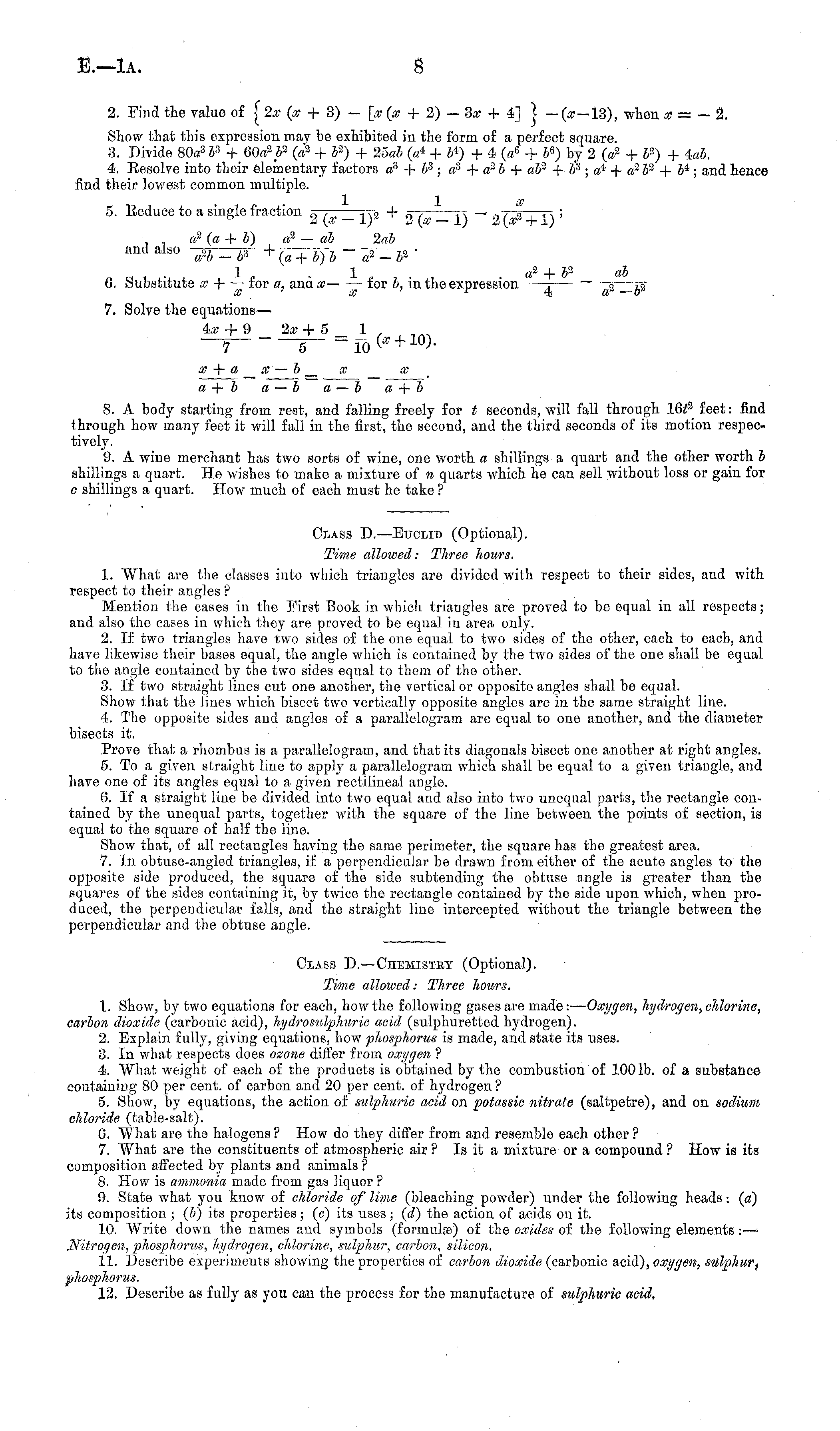 Class D.— Chemistey (Optional). Time allowed: Three hours. 1. Show, by two equations for each, how the following gases are made: — Oxygen, hydrogen, chlorine, carbon dioxide (carbonic acid), hydrosulphuric acid (sulphuretted hydrogen). 2. Explain fully, giving equations, how phosphorus is made, and state its uses. 3. In what respects does ozone differ from oxygen ? 4. What weight of each of the products is obtained by the combustion of 1001b. of a substance containing 80 per cent, of carbon and 20 per cent, of hydrogen ? 5. Show, by equations, the action of sulphuric acid on potassic nitrate (saltpetre), and on sodium chloride (table-salt). 6. What are the halogens ? How do they differ from and resemble each other ? 7. What are the constituents of atmospheric air ? Is it a mixture or a compound ? How is its composition affected by plants and animals ? 8. How is ammonia made from gas liquor ? 9. State what you know of chloride of lime (bleaching powder) under the following heads: (a) its composition ; (b) its properties ; (c) its uses; (d) the action of acids on it. 10. Write down the names and symbols (formulas) of the oxides of the following elements:—< Nitrogen, phosphorus, hydrogen, chlorine, sulphur, carbon, silicon. 11. Describe experiments showing the properties of carbon dioxide (carbonic acid), oxygen, sulphur ', phosphorus. 12. Describe as fully as you can the process for the manufacture of sulphuric acid.