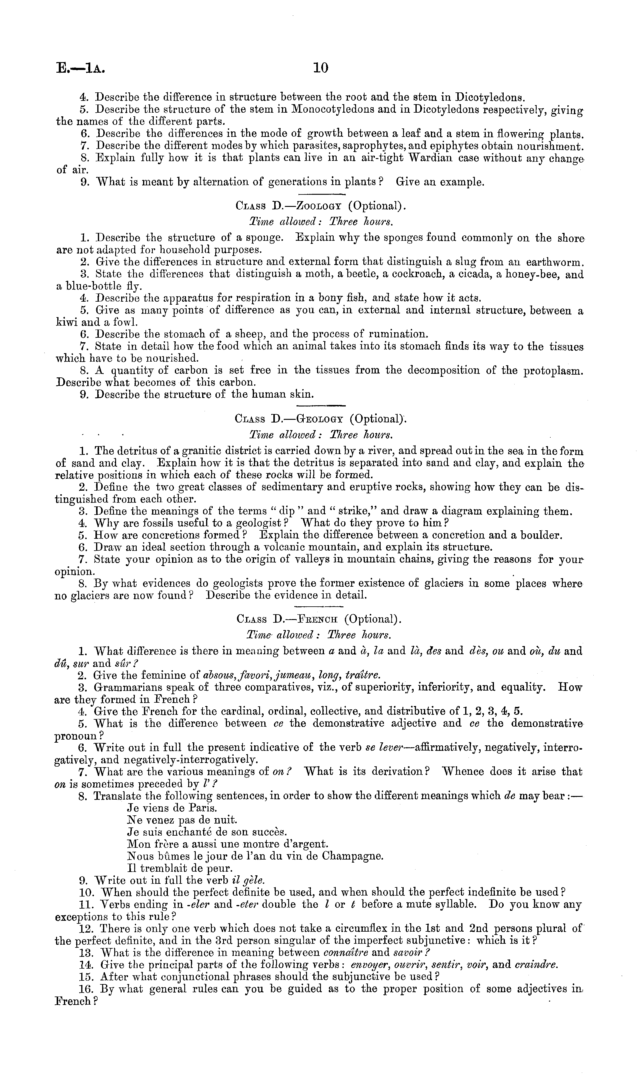 Class D.—Zoology (Optional). Time allowed: Three hours. 1. Describe the structure of a sponge. Explain why the sponges found commonly on the shore are not adapted for household purposes. 2. Give the differences in structure and external form that distinguish a slug from an earthworm. 3. State the differences that distinguish a moth, a beetle, a cockroach, a cicada, a honey-bee, and a blue-bottle fly. 4. Describe the apparatus for respiration in a bony fish, and state how it acts. 5. Give as many points of difference as you can, in external and internal structure, between a kiwi and a fowl. 6. Describe the stomach of a sheep, and the process of rumination. 7. State in detail how the food which an animal takes into its stomach finds its way to the tissues which have to be nourished. 8. A quantity of carbon is set free in the tissues from the decomposition of the protoplasm. Describe what becomes of this carbon. 9. Describe the structure of the human skin.