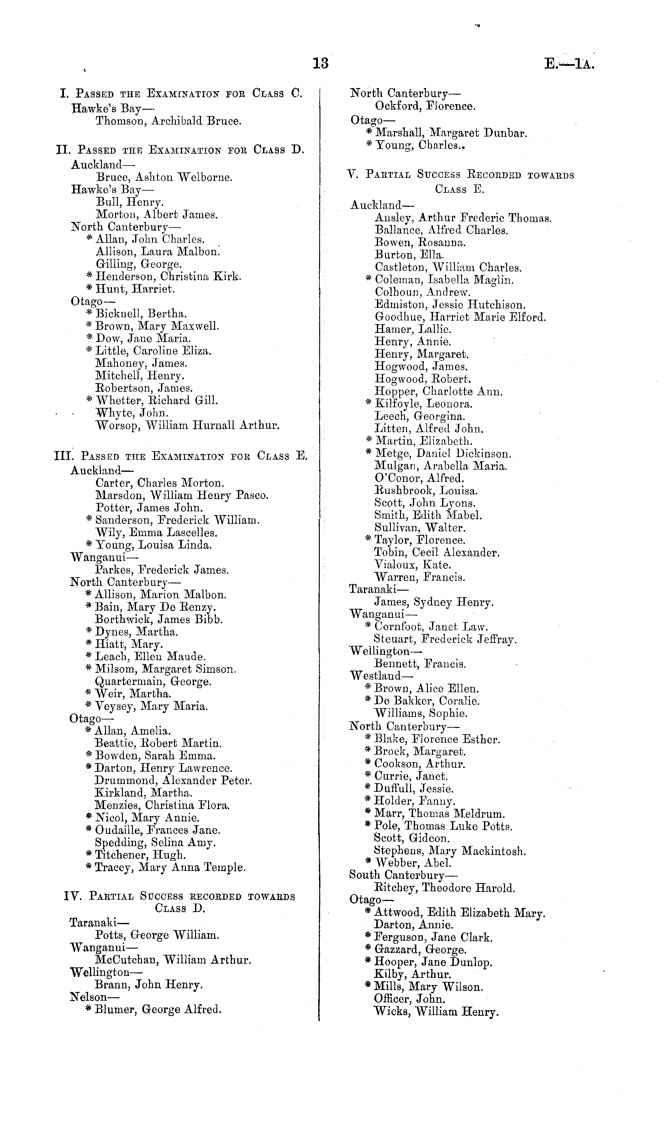 North Canterbury— Ockford, Florence. Otago — * Marshall, Margaret Dunbar. * Young, Charles.. V. Paetial Success Recoeded towaeds Class E. Auckland— Ansley, Arthur Frederic Thomas. Ballance, Alfred Charles. Bowen, Rosanna. Burton, Ella. Castleton, William Charles. * Coleman, Isabella Maglin. Colhoun, Andrew. Edmiston, Jessie Hutchison. Goodhue, Harriet Marie Elford. Hamer, Lallie. Henry, Annie. Henry, Margaret. Hogwood, James. Hogwood, Robert. Hopper, Charlotte Ann. * Kilfoyle, Leonora. Leech, Georgina. Litten, Alfred John. * Martin, Elizabeth. * Metgc, Daniel Dickinson. Mulgan, Arabella Maria. O'Conor, Alfred. Eushbrook, Louisa. Scott, John Lyons. Smith, Edith Mabel. Sullivan, Walter. * Taylor, Florence. Tobin, Cecil Alexander. Vialoux, Kate. Warren, Francis. Taranaki— James, Sydney Henry. Wanganui— * Cornfoot, Janet Law. Steuart, Frederick Jeffray. Wellington—■ Bennett, Francis. Westland—■ * Brown, Alice Ellen. * De Bakker, Coralie. Williams, Sophie. North Canterbury— * Blake, Florence Esther. * Brock, Margaret. * Cookson, Arthur. * Currie, Janet. * Duffull, Jessie. * Holder, Fanny. * Marr, Thomas Meldrum. * Pole, Thomas Luke Potts. Scott, Gideon. Stephens, Mary Mackintosh. * Webber, Abel. South Canterbury—• Ritchey, Theodore Harold. Otago— * Attwood, Edith Elizabeth Mary. Darton, Annie. * Ferguson, Jane Clark. * Gazzard, George. * Hooper, Jane Dunlop. Kilby, Arthur. * Mills, Mary Wilson. Officer, John. Wicks, William Henry.