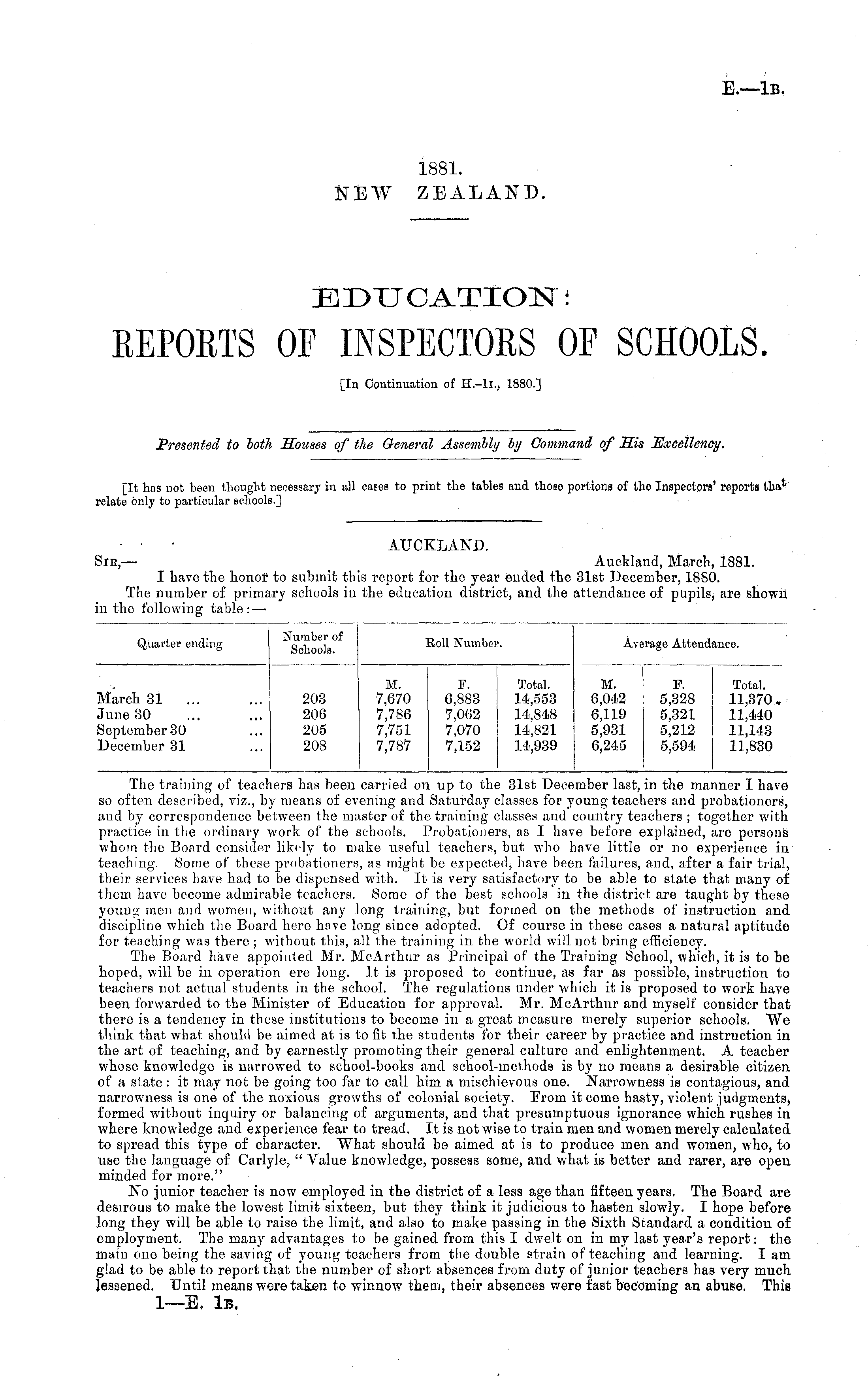 • • • AUCKLAND. Sic, — Auckland, March, 1881. I have the honor to submit this report for the year ended the 31st December, 1880. The number of primary schools in the education district, and the attendance of pupils, are shown in the following table:—