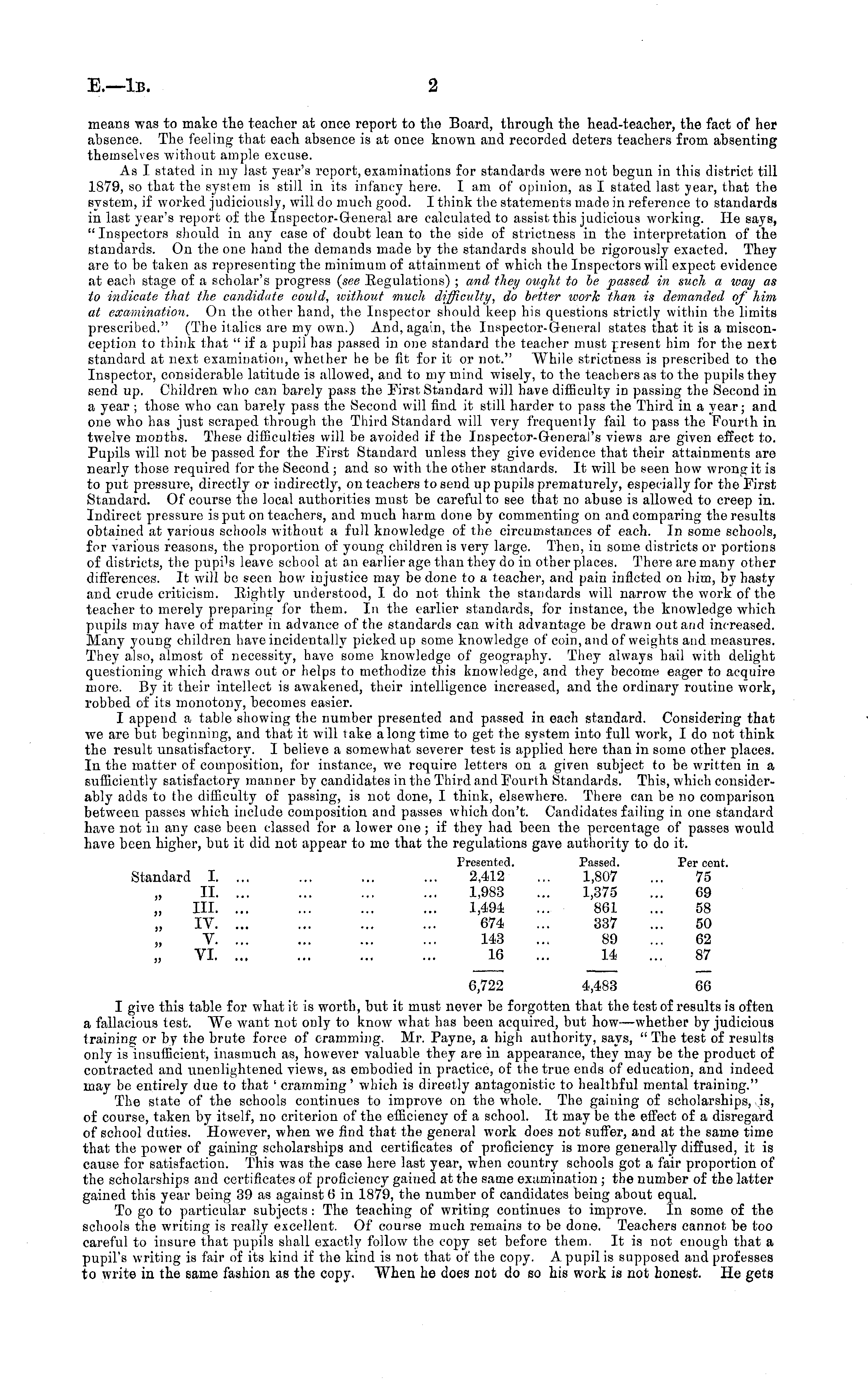 means was to make the teacher at once report to the Board, through the head-teacher, the fact of her absence. The feeling that each absence is at once known and recorded deters teachers from absenting themselves without ample excuse. As I stated in my last year's report, examinations for standards were not begun in this district till 1879, so that the system is still in its infancy here. I am of opinion, as I stated last year, that the system, if worked judiciously, will do much good. I think the statements made in reference to standards in last year's report of the Inspector-General are calculated to assist this judicious working. He says, " Inspectors should in any case of doubt lean to the side of strictness in the interpretation of the standards. On the one hand the demands made by the standards should be rigorously exacted. They are to be taken as representing the minimum of attainment of which the Inspectors will expect evidence at each stage of a scholar's progress (see Regulations) ; and they ought to be passed in such a way as to indicate that the candidate could, without much difficulty, do better work than is demanded of him at examination. On the other hand, the Inspector should keep his questions strictly within the limits prescribed." (The italics are my own.) And, again, the Inspector-General states that it is a misconception to think that " if a pupil has passed in one standard the teacher must present him for the next standard at next examination, whether he be fit for it or not." While strictness is prescribed to the Inspector, considerable latitude is allowed, and to my mind wisely, to the teachers as to the pupils they send up. Children who can barely pass the First Standard will have difficulty in passing the Second in a year ; those who can barely pass the Second will find it still harder to pass the Third in a year; and one who has just scraped through the Third Standard will very frequently fail to pass the Fourth in twelve months. These difficulties will be avoided if the Inspector-General's views are given effect to. Pupils will not be passed for the First Standard unless they give evidence that their attainments are nearly those required for the Second ; and so with the other standards. It will be seen how wrong it is to put pressure, directly or indirectly, on teachers to send up pupils prematurely, especially for the First Standard. Of course the local authorities must be careful to see that no abuse is allowed to creep in. Indirect pressure is put on teachers, and much harm done by commenting on and comparing the results obtained at various schools without a full knowledge of the circumstances of each. In some schools, for various reasons, the proportion of young children is very large. Then, in some districts or portions of districts, the pupils leave school at an earlier age than they do in other places. There are many other differences. It will be seen how injustice may be done to a teacher, and pain inflcted on him, by hasty and crude criticism. Rightly understood, I do not think the standards will narrow the work of the teacher to merely preparing for them. In the earlier standards, for instance, the knowledge which pupils may have of matter in advance of the standards can with advantage be drawn out and increased. Many young children have incidentally picked up some knowledge of coin, and of weights and measures. They also, almost of necessity, have some knowledge of geography. They always hail with delight questioning which draws out or helps to methodize this knowledge, and they become eager to acquire more. By it their intellect is awakened, their intelligence increased, and the ordinary routine work, robbed of its monotony, becomes easier. I append a table showing the number presented and passed in each standard. Considering that we are but beginning, and that it will take along time to get the system into full work, I do not think the result unsatisfactory. I believe a somewhat severer test is applied here than in some other places. In the matter of composition, for instance, we require letters on a given subject to be written in a sufficiently satisfactory manner by candidates in the Third and Fourth Standards. This, which considerably adds to the difficulty of passing, is not done, I think, elsewhere. There can be no comparison between passes which include composition and passes which don't. Candidates failing in one standard have not in any case been classed for a lower one; if they had been the percentage of passes would have been higher, but it did not appear to mo that the regulations gave authority to do it. Presented. Passed. Per cent. Standard I. ... ... ... ... 2,412 ... 1,807 ... 75 „ 11. ... ... ... ... 1,983 ... 1,375 ... 69 „ 111. ... ... ... ... 1,494 ... 861 ... 58 „ IV. ... ... ... ... 674 ... 337 ... 50 „ V. ... ... ... ... 143 ... 89 ... 62 VI 16 ... 14 ... 87 6,722 4,483 66 I give this table for what it is worth, but it must never be forgotten that the test of results is often a fallacious test. We want not only to know what has been acquired, but how —whether by judicious training or by the brute force of cramming. Mr. Payne, a high authority, says, " The test of results only is insufficient, inasmuch as, however valuable they are in appearance, they may be the product of contracted and unenlightened views, as embodied in practice, of the true ends of education, and indeed may be entirely due to that ' cramming' which is directly antagonistic to healthful mental training." The state of the schools continues to improve on the whole. The gaining of scholarships, is, of course, taken by itself, no criterion of the efficiency of a school. It may be the effect of a disregard of school duties. However, when we find that the general work does not suffer, and at the same time that the power of gaining scholarships and certificates of proficiency is more generally diffused, it is cause for satisfaction. This was the case here