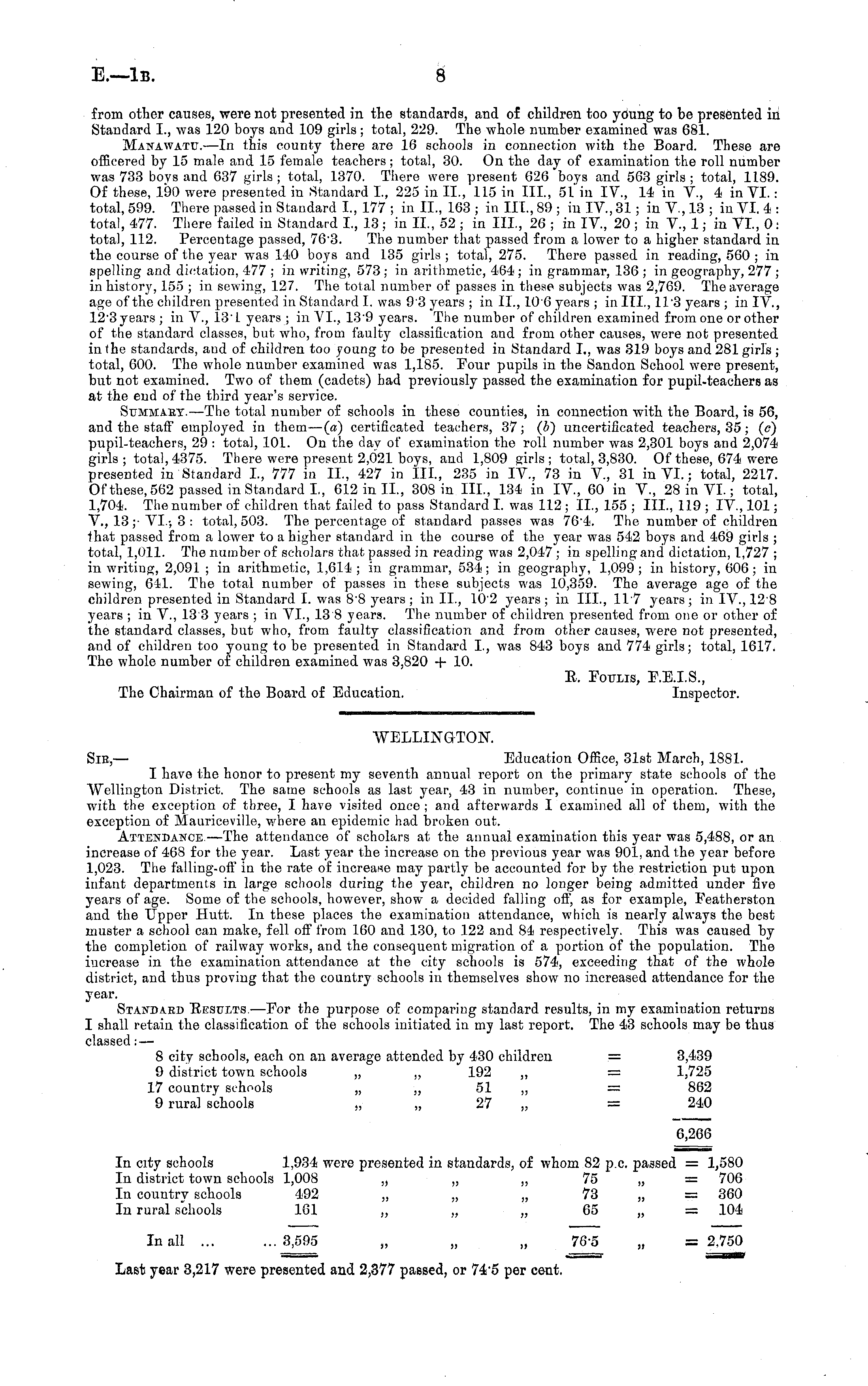 "WELLINGTON. Sib,— Education Office, 31st March, 1881. I have the honor to present my seventh annual report on the primary state schools of the Wellington District. The same schools as last year, 43 in number, continue in operation. These, with the exception of three, I have visited once ; and afterwards I examined all of them, with the exception of Mauriceville, where an epidemic had broken out. Attendance. —The attendance of scholars at the annual examination this year was 5,488, or an increase of 468 for the year. Last year the increase on the previous year was 901, and the year before 1,023. The falling-off in the rate of increase may partly be accounted for by the restriction put upon infant departments in large schools during the year, children no longer being admitted under five years of age. Some of the schools, however, show a decided falling oft', as for example, Featherston and the Upper Hutt. In these places the examination attendance, which is nearly always the best muster a school can make, fell off from 160 and 130, to 122 and 84 respectively. This was caused by the completion of railway works, and the consequent migration of a portion of the population. The iucrease in the examination attendance at the city schools is 574, exceeding that of the whole district, and thus proving that the country schools in themselves show no increased attendance for the year. Standard Results. —For the purpose of comparing standard results, in my examination returns I shall retain the classification of the schools initiated iv my last report. The 43 schools may be thus classed: — 8 city schools, each on an average attended by 430 children = 3,439 9 district town schools „ „ 192 „ = 1,725 17 country schools „ „ 51 „ = 862 9 rural schools „ „ 27 „ = 240 6,266 In city schools 1,934 were presented in standards, of whom 82 p.c. passed = 1,580 In district town schools 1,008 „ „ „ 75 „ = 706 In country schools 492 „ „ „ 73 „ = 360 In rural schools 161 „ „ „ 65 „ = 104 In all ... ...3,595 „ „ „ 765 „ =2.750 Last year 3,217 were presented and 2,377 passed, or 745 per cent.
