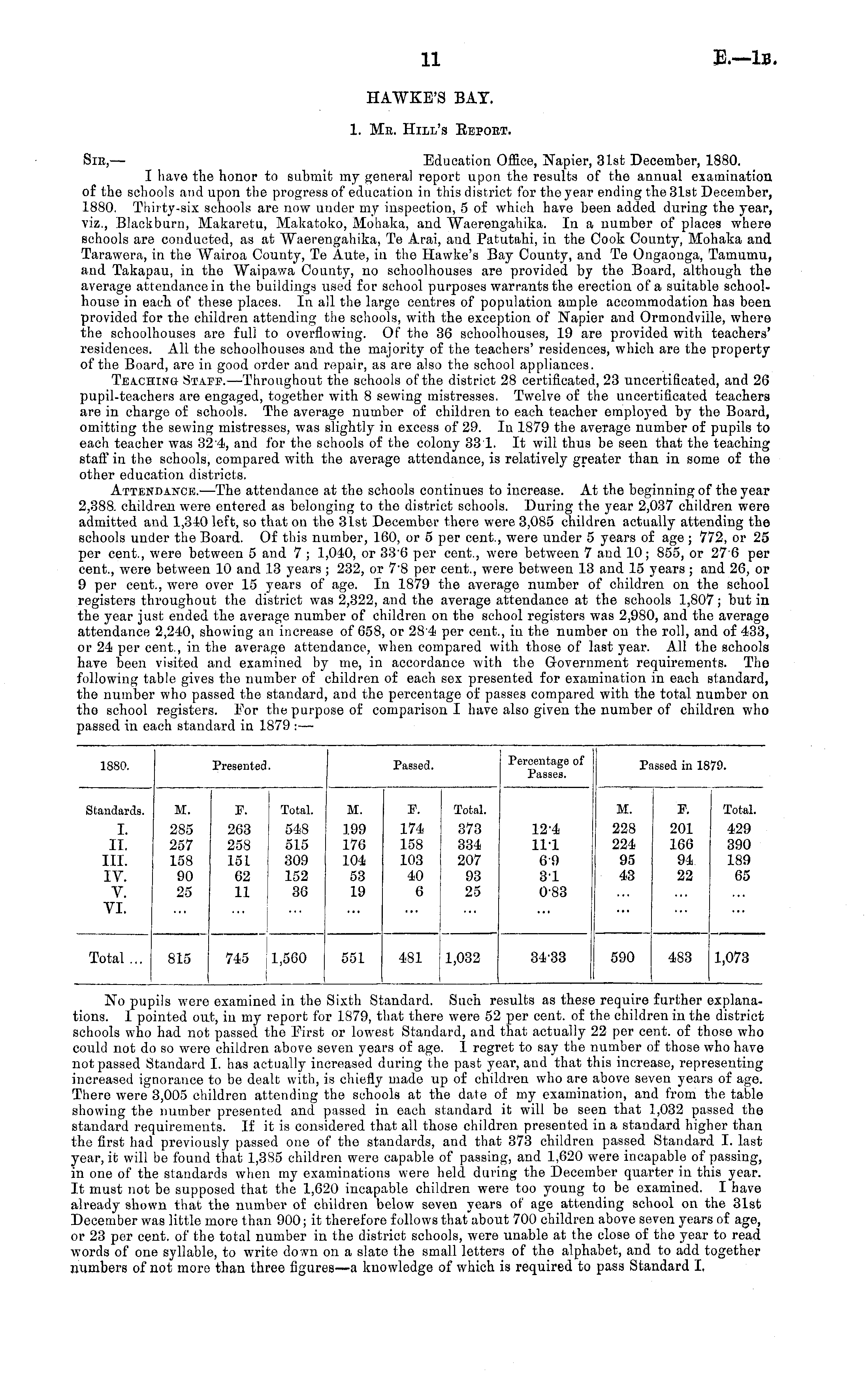HAWKE'S BAY. 1. Mb. Hill's Eepoet. Sib, — Education Office, Napier, 31st December, 1880. I have the honor to submit my general report upon the results of the annual examination of the schools and upon the progress of education in this district for the year ending the 31st December, 1880. Thirty-six schools are now under my inspection, sof which have been added during the year, viz., Blackburn, Makaretu, Makatoko, Mohaka, and Waerengahika. In a number of places where schools are conducted, as at "Waerengahika, Te Arai, and Patutahi, in the Cook County, Mohaka and Tarawera, in the Wairoa County, Te Aute, in the Hawke's Bay County, and Te Ongaonga, Tamumu, and Takapau, in the Waipawa County, no schoolbouses are provided by the Board, although the average attendance in the buildings used for school purposes warrants the erection of a suitable schoolhouse in each of these places. In all the large centres of population ample accommodation has been provided for the children attending the schools, with the exception of Napier and Ortnondviile, where the schoolhouses are full to overflowing. Of the 36 schoolhouses, 19 are provided with teachers' residences. All the schoolhouses and the majority of the teachers' residences, which are the property of the Board, are in good order and repair, as are also the school appliances. Teaching- Staff. —Throughout the schools of the district 28 certificated, 23 uncertificated, and 26 pupil-teachers are engaged, together with 8 sewing mistresses. Twelve of the uncertificated teachers are in charge of schools. The average number of children to each teacher employed by the Board, omitting the sewing mistresses, was slightly in excess of 29. In 1879 the average number of pupils to each teacher was 32 4, and for the schools of the colony 33 1. It will thus be seen that the teaching staff in the schools, compared with the average attendance, is relatively greater than in some of the other education districts. Attendance. —The attendance at the schools continues to increase. At the beginning of the year 2,388. children were entered as belonging to the district schools. During the year 2,037 children were admitted and 1,340 left, so that on the 31st December there were 3,085 children actually attending the schools under the Board. Of this number, 160, or 5 per cent., were under 5 years of age ; 772, or 25 per cent., were between 5 and 7 ; 1,040, or 336 per cent., were between 7 and 10; 855, or 276 per cent., were between 10 and 13 years ; 232, or 7'B per cent., were between 13 and 15 years; and 26, or 9 per cent., were over 15 years of age. In 1879 the average number of children on the school registers throughout the district was 2,322, and the average attendance at the schools 1,807; but in the year just ended the average number of children on the school registers was 2,980, and the average attendance 2,240, showing an increase of 658, or 284 per cent., in the number on the roll, and of 433, or 24 per cent., in the average attendance, when compared with those of last year. All the schools have been visited and examined by me, in accordance with the Government requirements. The following table gives the number of children of each sex presented for examination in each standard, the number who passed the standard, and the percentage of passes compared with the total number on the school registers. For the purpose of comparison I have also given the number of children who passed in each standard in 1879 : —