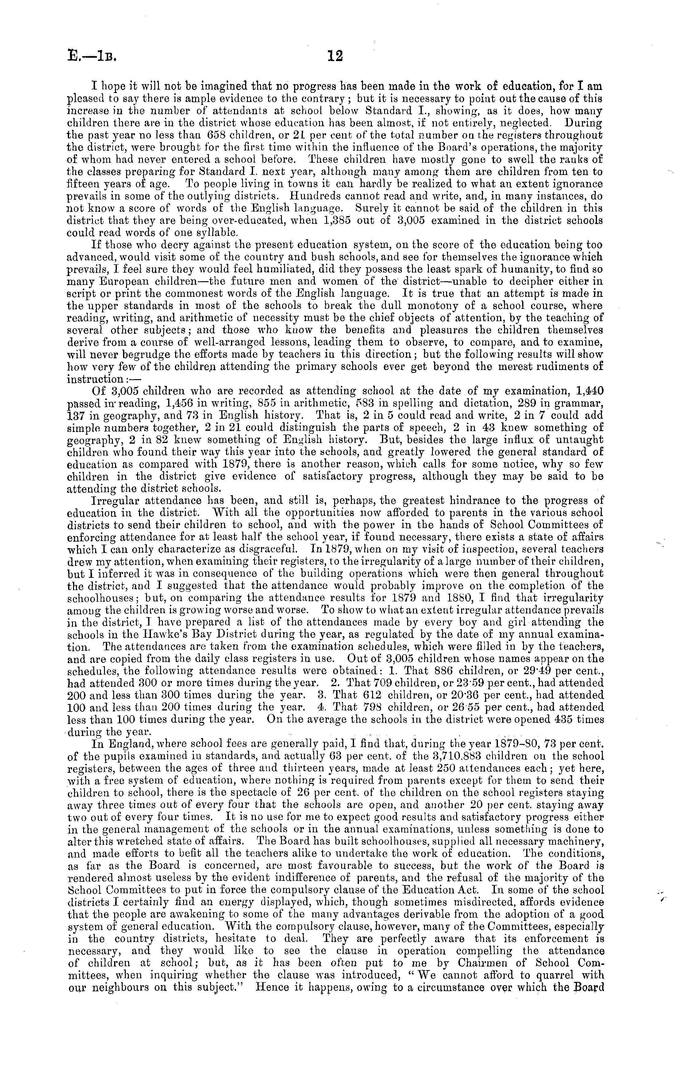 I hope it will not be imagined that no progress has been made in the work of education, for I am pleased to say there is ample evidence to the contrary ; but it is necessary to point out the cause of this increase in the number of attendants at school below Standard 1., showing, as it does, how many children there are in the district whose education has been almost, if not entirely, neglected. During the past year no less than 658 children, or 21 per cent of the total number on the registers throughout the district, were brought for the first time within the influence of the Board's operations, the majority of whom had never entered a school before. These children have mostly gone to swell the rauks of the classes preparing for Standard I. next year, although many among them are children from ten to fifteen years of age. To people living in towns it can hardly be realized to what an extent ignorance prevails in some of the outlying districts. Hundreds cannot read and write, and, in many instances, do not know a score of words of the English language. Surely it cannot be said of the children in this district that they are being over-educated, when 1,385 out of 3,005 examined in the district schools could read words of one syllable. If those who decry against the present education system, on the score of the education being too advanced, would visit some of the country and bush schools, and see for themselves the ignorance which prevails, I feel sure they would feel humiliated, did they possess the least spark of humanity, to find so many European children —the future men and women of the district —unable to decipher either in script or print the commonest words of the English language. It is true that an attempt is made in the upper standards in most of the schools to break the dull monotony of a school course, where reading, writing, and arithmetic of necessity must be the chief objects of attention, by the teaching of several other subjects; and those who know the benefits and pleasures the children themselves derive from a course of well-arranged lessons, leading them to observe, to compare, and to examine, will never begrudge the efforts made by teachers ia this direction; but the following results will show how very few of the children attending the primary schools ever get beyond the merest rudiments of instruction: — Of 3,005 children who are recorded as attending school at the date of my examination, 1,440 passed in" reading, 1,456 in writing, 855 in arithmetic, 583 in spelling and dictation, 289 in grammar, 137 in geography, and 73 in English history. That is, 2in 5 could read and write, 2in 7 could add simple numbers together, 2 in 21 could distinguish the parts of speech, 2 in 43 knew something of geography, 2 in 82 knew something of English history. But, besides the large influx of untaught children who found their way this year into the schools, and greatly lowered the general standard of education as compared with 1879, there is another reason, which calls for some notice, why so few children in the district give evidence of satisfactory progress, although they may be said to be attending the district schools. Irregular attendance has been, and still is, perhaps, the greatest hindrance to the progress of education in the district. With all the opportunities now afforded to parents in the various school districts to send their children to school, and with the power in the hands of School Committees of enforcing attendance for at least half the school year, if found necessary, there exists a state of affairs which I can only characterize as disgraceful. In 1879, when on my visit of inspection, several teachers drew my attention, when examining their registers, to the irregularity of a large number of their children, but I inferred it was in consequence of the building operations which were then general throughout the district, and I suggested that the attendance would probably improve on the completion of the schoolhouses; but, on comparing the attendance results for 1879 and 1880, I find that irregularity among the children is growing worse and worse. To show to what an extent irregular attendance prevails in the district, I have prepared a list of the attendances made by every boy and girl attending the schools in the Hawke's Bay District during the year, as regulated by the date of my annual examination. The attendances are taken from the examination schedules, which were filled in by the teachers, and are copied from the daily class registers in use. Out of 3,005 children whose names appear on the schedules, the following attendance results were obtained: 1. That 886 children, or 2949 per cent., had attended 300 or more times during the year. 2. That 709 children, or 2359 per cent., had attended 200 and less than 300 times during the year. 3. That 61.2 children, or 2036 per cent., had attended 100 and less than 200 times during the year. 4. That 798 children, or 26 55 per cent., had attended less than 100 times during the year. On the average the schools in the district were opened 435 times during the year. In England, where school fees are generally paid, I find that, during the year 1879-80, 73 per cent, of the pupils examined in standards, and actually 63 per cent, of the 3,710.883 children on the school registers, between the ages of three and thirteen years, made at least 250 attendances each; yet here, with a free system of education, where nothing is required from parents except for them to send their children to school, there is the spectacle of 26 per cent, of the children on the school registers staying away three times out of every four that the schools are open, and another 20 per cent, staying away two out of every four times. It is no use for me to expect good results and satisfactory progress either in the general management of the schools or in the annual examinations, unless something is done to alter this wretched state of affairs. The Board has bu