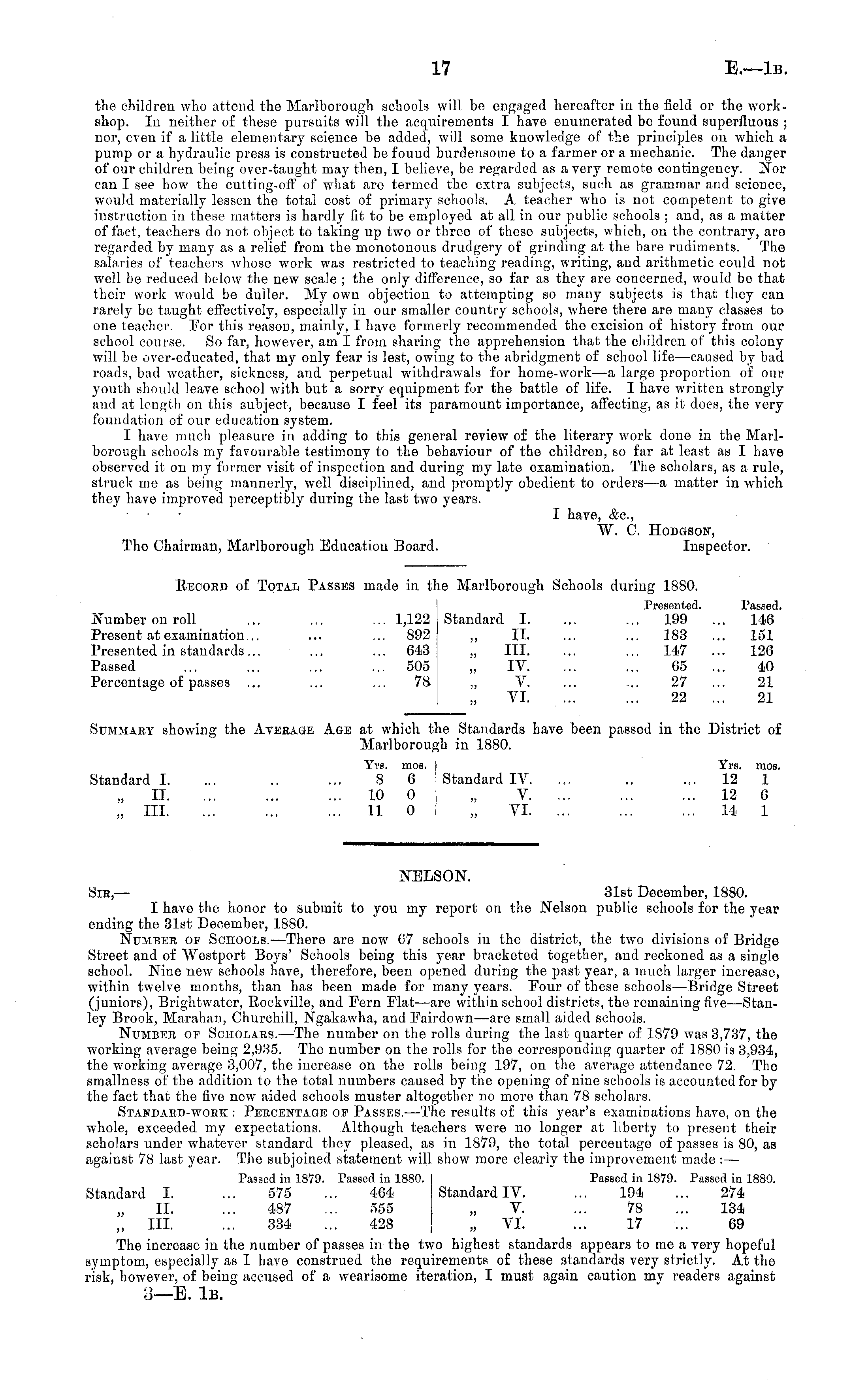 NELSON. Sib,— 31st December, 1880. I have the honor to submit to you my report on the Nelson public schools for the year ending the 31st December, 1880. Number of Schools.—There are now 07 schools in the district, the two divisions of Bridge Street and of Westport Boys' Schools being this year bracketed together, and reckoned as a single school. Nine new schools have, therefore, been opened during the past year, a much larger increase, within twelve months, than has been made for many years. Four of these schools—Bridge Street (juniors), Brightwater, Bockville, and Fern Mat —are within school districts, the remaining five—Stanley Brook, Marahan, Churchill, Ngakawha, and Fairdown —are small aided schools. Number of Scholars. —The number on the rolls during the last quarter of 1879 was 3,737, the working average being 2,935. The number on the rolls for the corresponding quarter of 1880 is 3,934, the working average 3,007, the increase on the rolls being 197, on the average attendance 72. The smallness of the addition to the total numbers caused by the opening of nine schools is accounted for by the fact that the five new aided schools muster altogether no more than 78 scholars. Stakdard-work : Percentage op Passes. —The results of this year's examinations have, on the whole, exceeded my expectations. Although teachers were no longer at liberty to present their scholars under whatever standard they pleased, as in 1879, the total percentage of passes is 80, as against 78 last year. The subjoined statement will show more clearly the improvement made :— Passed in 1879. Passed in 1880. Passed in 1879. Passed in 1880. Standard I. ... 575 ... 464 Standardly. ... 194 ... 274 11. ... 487 ... 555 „ V. ... 78 ... 134 „ 111. ... 334 ... 428 „ VI. ... 17 ... 69 The increase in the number of passes in the two highest standards appears to me a very hopeful symptom, especially as I have construed the requirements of these standards very strictly. At the risk, however, of being accused of a wearisome iteration, I must again caution my readers against 3—E. Ib.
