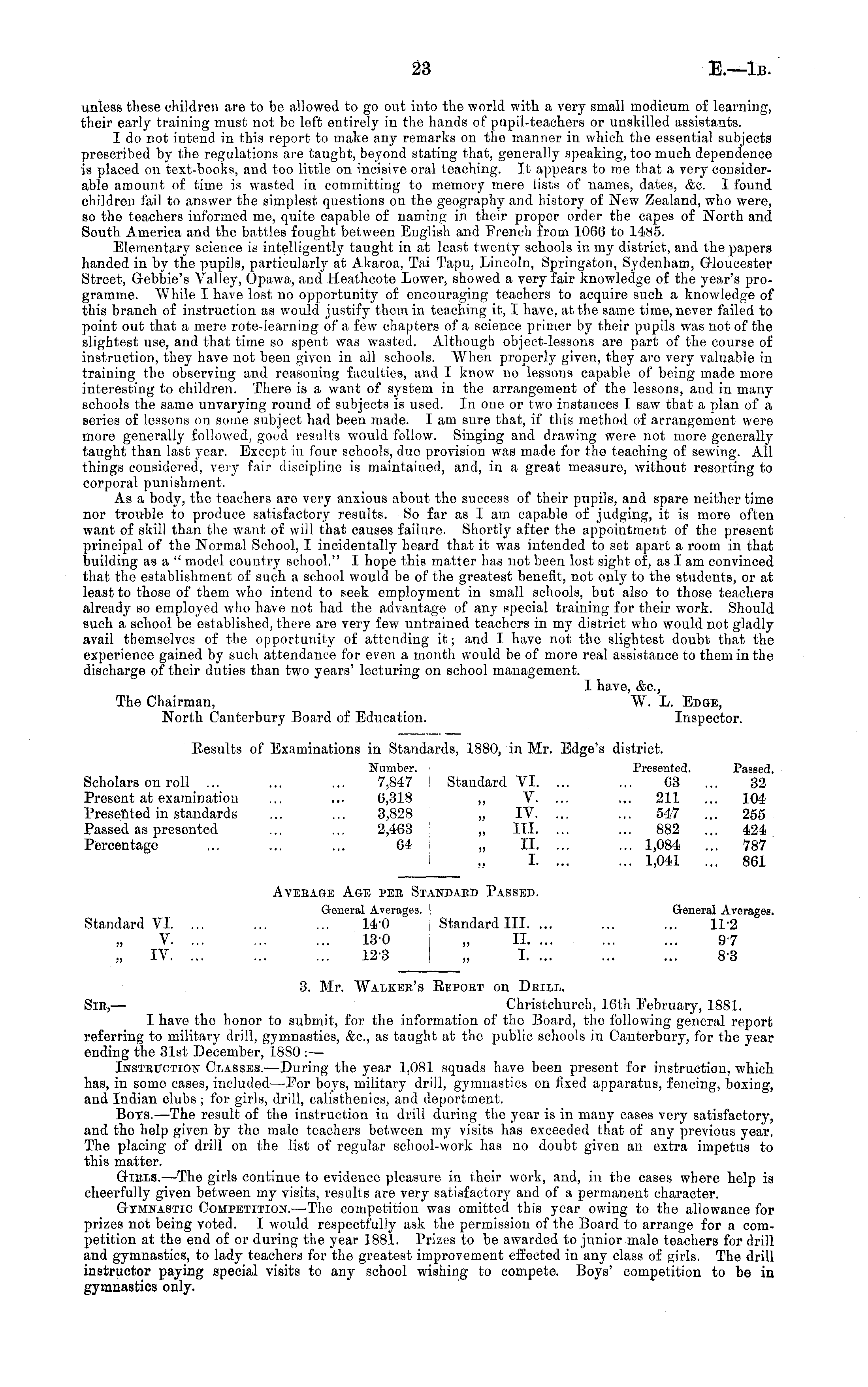 unless these children are to be allowed to go out into the world with a very small modicum of learning, their early training must not be left entirely in the hands of pupil-teachers or unskilled assistants. I do not intend in this report to make any remarks on the manner in which the essential subjects prescribed by the regulations are taught, beyond stating that, generally speaking, too much dependence is placed on text-books, and too little on incisive oral teaching. It appears to me that a very considerable amount of time is wasted in committing to memory mere lists of names, dates, &c. I found children fail to answer the simplest questions on the geography and history of New Zealand, who were, so the teachers informed me, quite capable of naming in their proper order the capes of North and South America and the battles fought between English and French from 1066 to 1485. Elementary science is intelligently taught in at least twenty schools in my district, and the papers handed in by the pupils, particularly at Akaroa, Tai Tapu, Lincoln, Springston, Sydenham, Gloucester Street, Gebbie's Valley, Opawa, and Heathcote Lower, showed a very fair knowledge of the year's programme. While I have lost no opportunity of encouraging teachers to acquire such a knowledge of this branch of instruction as would justify them in teaching it, I have, at the same time, never failed to point out that a mere rote-learning of a few chapters of a science primer by their pupils was not of the slightest use, and that time so spent was wasted. Although object-lessons are part of the course of instruction, they have not been given in all schools. When properly given, they are very valuable in training the observing and reasoning faculties, and I know no lessons capable of being made more interesting to children. There is a want of system in the arrangement of the lessons, and in many schools the same unvarying round of subjects is used. In one or two instances I saw that a plan of a series of lessons on some subject had been made. lam sure that, if this method of arrangement were more generally followed, good results would follow. Singing and drawing were not more generally taught than last year. Except in four schools, due provision was made for the teaching of sewing. All things considered, very fair discipline is maintained, and, in a great measure, without resorting to corporal punishment. As a body, the teachers are very anxious about the success of their pupils, and spare neither time nor trou-ble to produce satisfactory results. So far as I am capable of judging, it is more often want of skill than the want of will that causes failure. Shortly after the appointment of the present principal of the Normal School, I incidentally heard that it was intended to set apart a room in that building as a " model country school." I hope this matter has not been lost sight of, as lam convinced that the establishment of such a school would be of the greatest benefit, not only to the students, or at least to those of them who intend to seek employment in small schools, but also to those teachers already so employed who have not had the advantage of any special training for their work. Should such a school be established, there are very few untrained teachers in my district who would not gladly avail themselves of the opportunity of attending it; and I have not the slightest doubt that the experience gained by such attendance for even a month would be of more real assistance to them in the discharge of their duties than two years' lecturing on school management. 1 have, &c, The Chairman, W. L. Edge, North Canterbury Board of Education. Inspector.