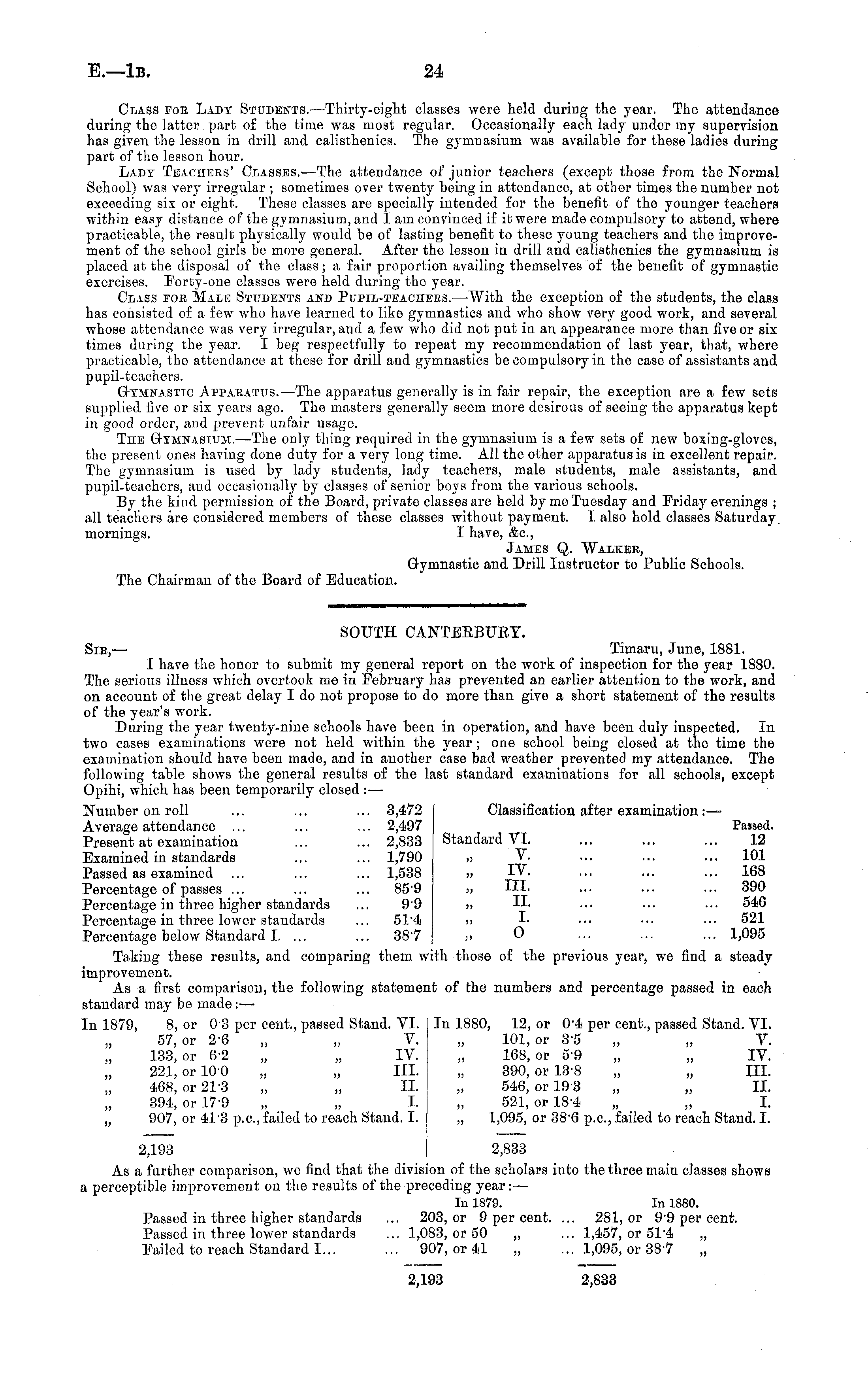SOUTH CANTEEBUET. Sib, — Timaru, June, 1881. I have the honor to submit my general report on the work of inspection for the year 1880. The serious illness which overtook me in February has prevented an earlier attention to the work, and on account of the great delay I do not propose to do more than give a short statement of the results of the year's work. During the year twenty-nine schools have been in operation, and have been duly inspected. In two cases examinations were not held within the year; one school being closed at the time the examination should have been made, and in another case bad weather prevented my attendance. The following table shows the general results of the last standard examinations for all schools, except Opihi, which has been temporarily closed : — Number on roll ... ... ... 3,472 Classification after examination: — Average attendance ... ... ... 2,497 Passed. Present at examination ... ... 2,833 Standard VI. ... ... ... 12 Examined in standards ... ... 1,790 » V. ... ... ... 101 Passed as examined ... ... ... 1,538 » IV. ... ... ... 168 Percentage of passes ... ... ... 85-9 » HI- ■•• •■• ••■ 390 Percentage in three higher standards ... 99 » H- ••■ ■•• ••• 546 Percentage in three lower standards ... 51"4 >> I- ••• ••■ ■•• 521 Percentage below Standard I. ... ... 387 » O ... ... ... 1,095 Taking these results, and comparing them with those of the previous year, we find a steady improvement. As a first comparison, the following statement of the numbers and percentage passed in each standard may be made: — In 1879, 8, or 03 per cent, passed Stand. VI. In 1880, 12, or o'4 per cent., passed Stand. VI. „ 57, or 2-6 „ „ V. „ 101, or 35 „ „ V. 133, or 62 „ „ IV. „ 168, or 59 „ „ IV. „ 221, or 100 „ „ 111. „ 390, or 13-8 „ „ 111. „ 468, or 21-3 „ „ 11. „ 546, or 193 „ „ 11. „ 394, or 179 „ „ I. „ 521, or 184 „ „ I. „ 907, or 41-3 p.c, failed to reach Stand. I. „ 1,095, or 386 p.c, failed to reach Stand. I. 2,193 2,833 As a further comparison, we find that the division of the scholars into the three main classes shows a perceptible improvement on the results of the preceding year:— In 1879. In 1880. Passed in three higher standards ... 203, or 9 per cent. ... 281, or 99 per cent. Passed in three lower standards ... 1,083, or 50 „ ... 1,457, or 514 „ Failed to reach Standard 1... ... 907, or 41 „ ... 1,095, or 387 „ 2,193 2,833