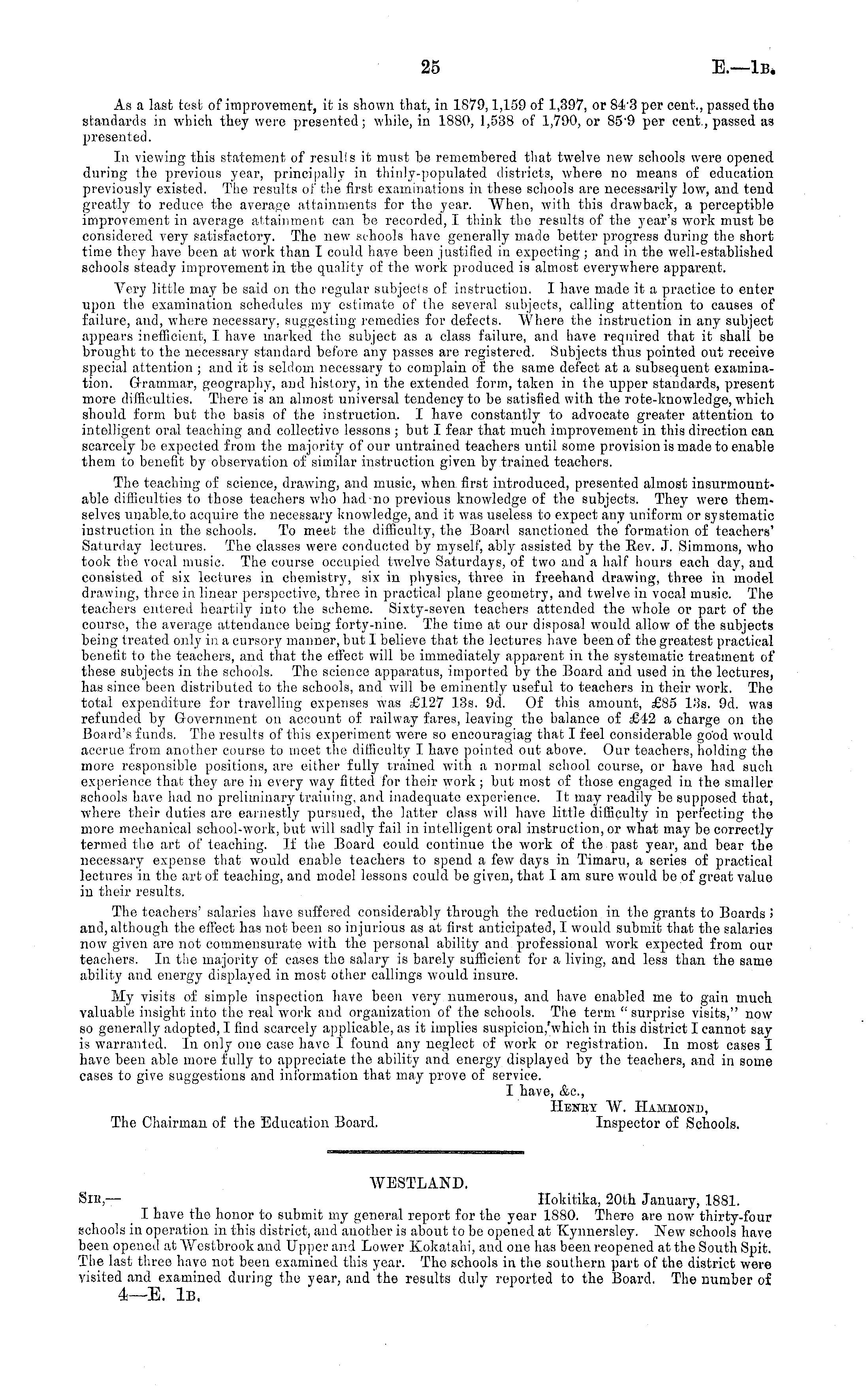 WESTLAND, Stßj— Hokitika, 20th January, 1881. I have the honor to submit my general report for the year 1880. There are now thirty-four schools in operation in this district, and another is about to be opened at Kynnersley. New schools have been opened at Westbrook and Upper and Lower Kokatahi, and one has been reopened at the South Spit. The last three have not been examined this year. The schools in the southern part of the district were visited and examined during the year, and the results duly reported to the Board. The number of 4—E. Ib.