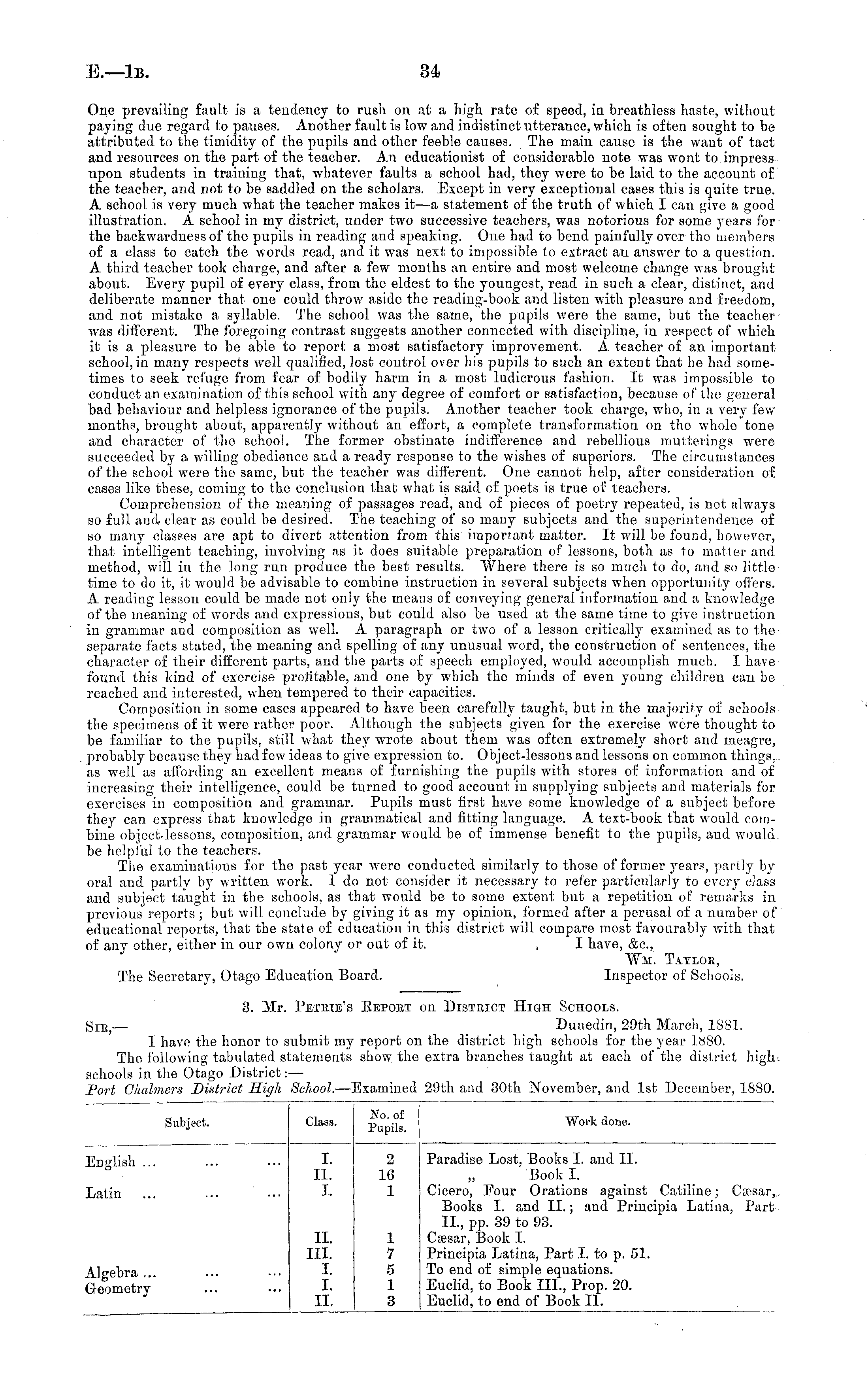 3. Mr. Pethie's Bepoet on District High Schools. Sib,— Dunedin, 29th March, 1881. I have the honor to submit my report on the district high schools for the year 1880. The following tabulated statements show the extra branches taught at each of the district high schools in the Otago District: —• Port Chalmers District High School. —Examined 29th and 30th November, and 1st December, 1880.