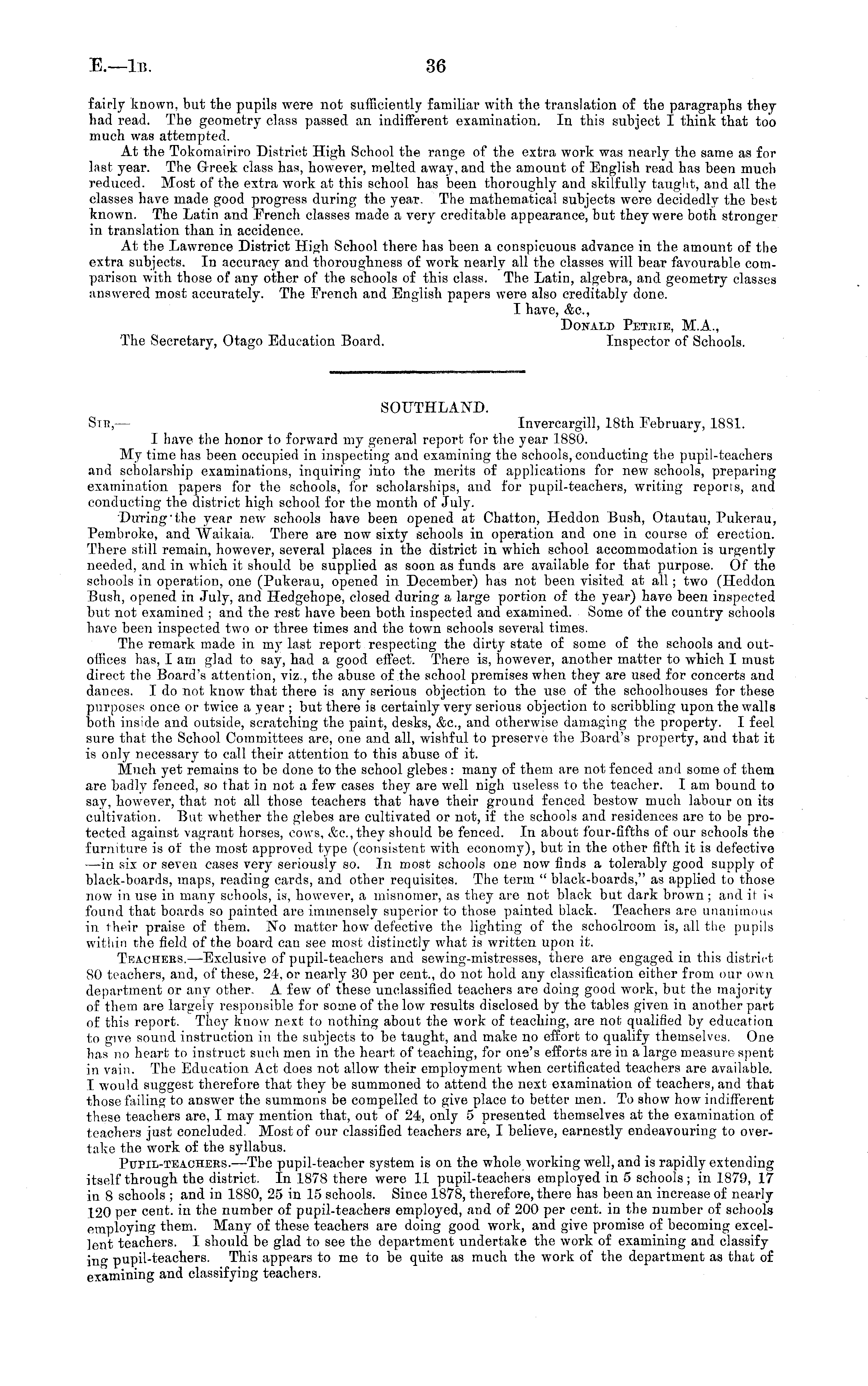 fairly known, but the pupils were not sufficiently familiar with the translation of the paragraphs they had read. The geometry class passed an indifferent examination. In this subject I think that too much was attempted. At the Tokomairiro District High School the range of the extra work was nearly the same as for last year. The Greek class has, however, melted away, and the amount of English read has been much reduced. Most of the extra work at this school has been thoroughly and skilfully taught, and all the classes have made good progress during the year. The mathematical subjects were decidedly the best known. The Latin and French classes made a very creditable appearance, but they were both stronger in translation than in accidence. At the Lawrence District High School there has been a conspicuous advance in the amount of the extra subjects. In accuracy and thoroughness of work nearly all the classes will bear favourable comparison with those of any other of the schools of this class. The Latin, algebra, and geometry classes answered most accurately. The French and English papers were also creditably done. I have, &c, Donald Petkie, M.A., The Secretary, Otago Education Board. Inspector of Schools.