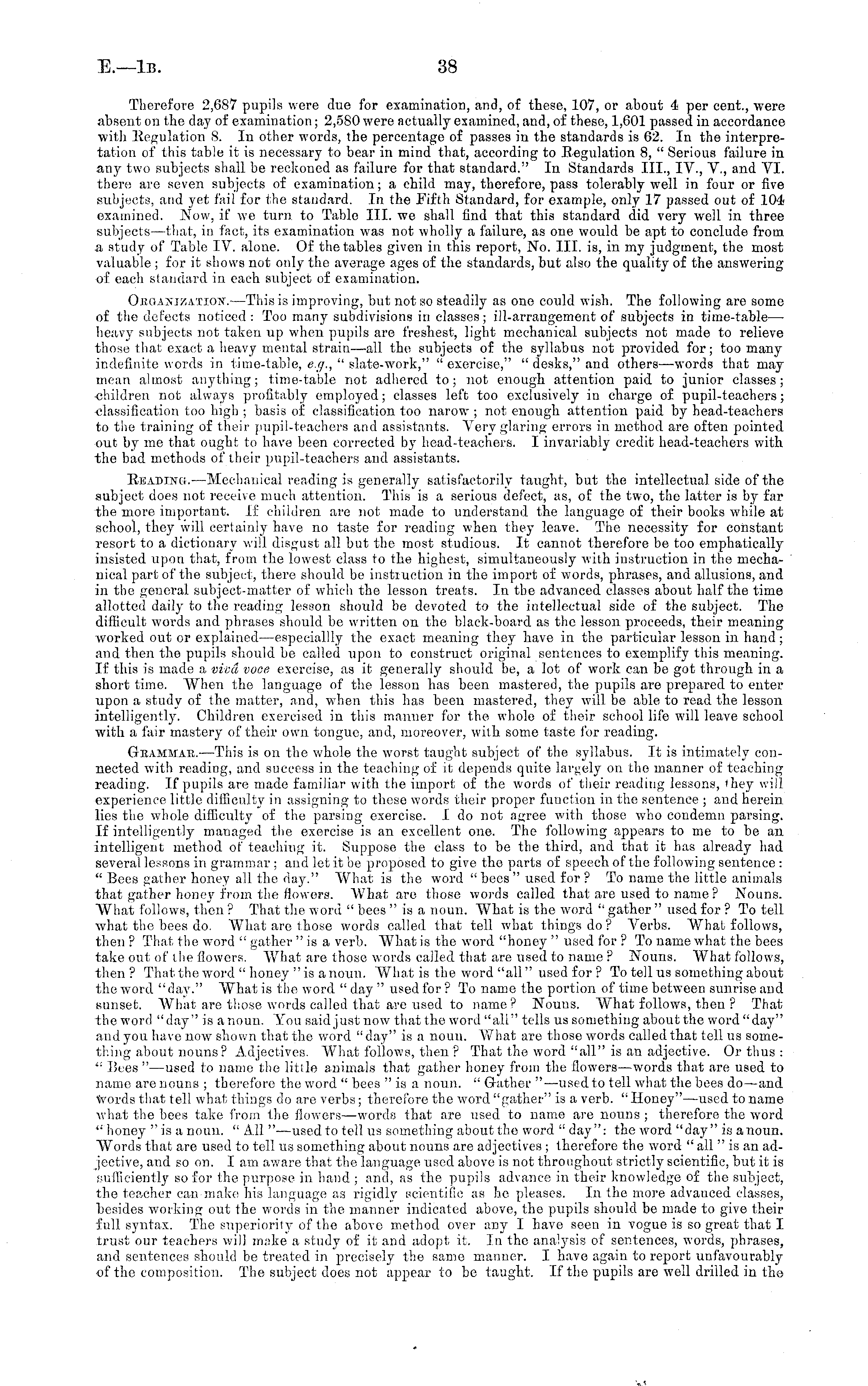 Therefore 2,687 pupils were due for examination, and, of these, 107, or about 4 per cent., were absent on the da} 7 of examination; 2,580 were actually examined, and, of these, I,COI passed in accordance with Regulation 8. In other words, the percentage of passes in the standards is 62. In the interpretation of this table it is necessary to bear in mind that, according to Regulation 8, " Serious failure in any two subjects shall be reckoned as failure for that standard." In Standards 111., IV., V., and VI. there are seven subjects of examination; a child may, therefore, pass tolerably well in four or five subjects, and yet fail for the standard. In the Fifth Standard, for example, only 17 passed out of 104 examined. Now, if we turn to Table 111. we shall find that this standard did very well in three subjects—that, in fact, its examination was not wholly a failure, as one would be apt to conclude from a study of Table IV. alone. Of the tables given in this report, No. 111. is, in my judgment, the most valuable ; for it shows not only the average ages of the standards, but also the quality of the answering of each standard in each subject of examination. OfiaAKTZAXioiv. —This is improving, but not so steadily as one could wish. The following are some of the defects noticed: Too many subdivisions in classes; ill-arrangement of subjects in time-table — heavy snbjects not taken up when pupils are freshest, light mechanical subjects not made to relieve those that exact a heavy mental strain—all the subjects of the syllabus not provided for; too many indefinite words in time-table, e.g., " slate-work," " exercise," " desks," and others —words that may mean almost anything; time-table not adhered to; not enough attention paid to junior classes; children not always profitably employed; classes left too exclusively in charge of pupil-teachers; classification too high ; basis of classification too narow ; not enough attention paid by head-teachers to the training of their pupil-teachers and assistants. Very glaring errors in method are often pointed out by me that ought to have been corrected by head-teachers. I invariably credit head-teachers with the bad methods of their pupil-teachers and assistants. Reading.—Mechanical reading is generally satisfactorily taught, but the intellectual side of the subject does not receive much attention. This is a serious defect, as, of the two, the latter is by far the more important. If children aro not made to understand the language of their books while at school, they will certainly have no taste for reading when they leave. The necessity for constant resort to a dictionary will disgust all but the most studious. It cannot therefore be too emphatically insisted upon that, from the lowest class to the highest, simultaneously with instruction in the mechanical part of the subject, there should be instruction in the import of words, phrases, and allusions, and in the general subject-matter of which the lesson treats. In the advanced classes about half the time allotted daily to the reading lesson should be devoted to the intellectual side of the subject. The difficult words and phrases should be written on the black-board as the lesson proceeds, their meaning worked out or explained —especiallly the exact meaning they have in the particular lesson in hand; and then the pupils should be called upon to construct original sentences to exemplify this meaning. If this is made a viva vooe exercise, as it generally should be, a lot of work can be got through in a short time. When the language of the lesson has been mastered, the pupils are prepared to enter upon a study of the matter, and, when this has been mastered, they will be able to read the lesson intelligently. Children exercised in this manner for the whole of their school life will leave school with a fair mastery of their own tongue, and, moreover, with some taste for reading. Gbammae. —This is on the whole the worst taught subject of the syllabus. It is intimately connected with reading, and success in the teaching of it depends quite largely on the manner of teaching reading. If pupils are made familiar with the import of the words of their reading lessons, they will experience little difficulty in assigning to these words their proper function in the sentence ; and herein lies the whole difficulty of the parsing exercise. I do not agree with those who condemn parsing. If intelligently managed the exercise is an excellent one. The following appears to me to be an intelligent method of teaching it. Suppose the class to be the third, and that it has already had several lessons in grammar ; and let it be proposed to give the parts of speech of the following sentence : " Bees gather honey all the day." What is the word " bees " used for ? To name the little animals that gather honey from the flowers. What are those words called that are used to name ? Nouns. What follows, then ? That the word " bees "is a noun. What is the word " gather " used for ? To tell what the bees do. What are those words called that tell what things do ? Verbs. What follows, then ? That the word " gather "is a verb. What is the word "hone3 r " used for ? To name what the bees take out of the flowers. What are those words called that are used to name ? Nouns. What follows, then ? That the word " honey "is a noun. What is the word "all" used for ? To tell us something about the word "day." What is the, word " day " used for ? To name the portion of time between sunrise and sunset. What are those words called that are used to name ? Nouns. What follows, then ? That the word "day" is a noun. You said just now that the word "all" tells us something about the word "day" and you have now shown that the word "day" is a noun. What are those words called that tell us something about nouns? Adjectives. What follows, then ? That the word "all" is an adjective. Or thus : " Bees" —used to name the little animals that gather honey 