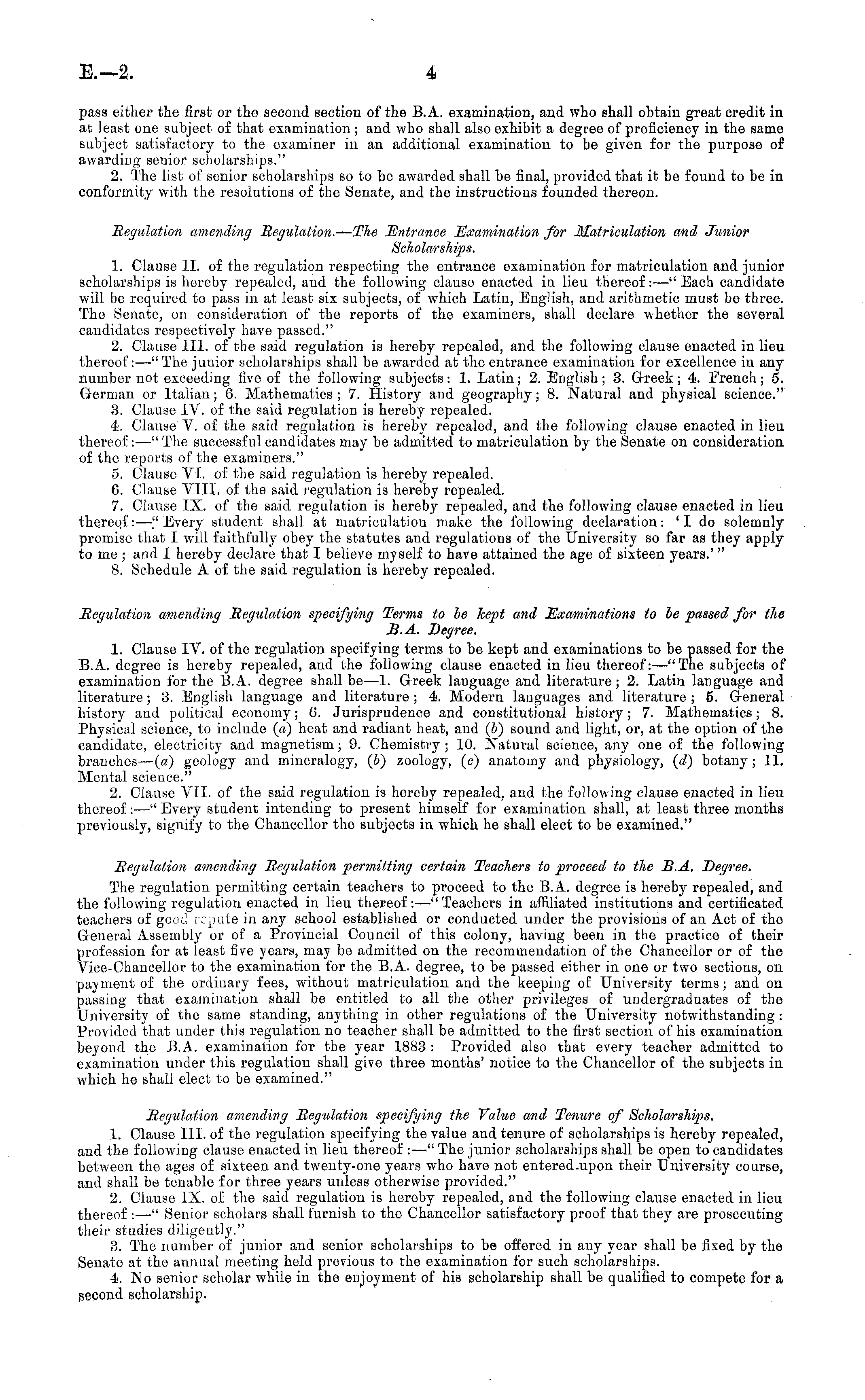 pass either the first or the second section of the B.A. examination, and who shall obtain great credit in at least one subject of that examination; and who shall also exhibit a degree of proficiency in the same subject satisfactory to the examiner in an additional examination to be given for the purpose of awarding senior scholarships." 2. The list of senior scholarships so to be awarded shall be final, provided that it be found to be in conformity with the resolutions of the Senate, and the instructions founded thereon. Regulation amending Regulation. — The Entrance Examination for Matriculation and Junior Scholarships. 1. Clause 11. of the regulation respecting the entrance examination for matriculation and junior scholarships is hereby repealed, and the following clause enacted in lieu thereof: —"Each candidate will be required to pass in at least six subjects, of which Latin, English, and arithmetic must be three. The Senate, on consideration of the reports of the examiners, shall declare whether the several candidates reepectively have passed." 2. Clause 111. of the said regulation is hereby repealed, and the following clause enacted in lieu thereof: —"The junior scholarships Bhall be awarded at the entrance examination for excellence in any number not exceeding five of the following subjects: 1. Latin; 2. English; 3. Greek; 4. French; 5. German or Italian; 6. Mathematics ; 7. History and geography; 8. Natural and physical science." 3. Clause IV. of the said regulation is hereby repealed. 4. Clause V. of the said regulation is hereby repealed, and the following clause enacted in lieu thereof: —" The successful candidates may be admitted to matriculation by the Senate on consideration of the reports of the examiners." 5. Clause VI. of the said regulation is hereby repealed. 6. Clause VIII. of the said regulation is hereby repealed. 7. Clause IX. of the said regulation is hereby repealed, and the following clause enacted in lieu thereof: —"Every student shall at matriculation make the following declaration: 'I do solemnly promise that I will faithfully obey the statutes and regulations of the University so far as they apply to me ; and I hereby declare that I believe myself to have attained the age of sixteen years.'" 8. Schedule A of the said regulation is hereby repealed. Regulation amending Regulation specifying Terms to be kept and Examinations to be passed for the B.A. Degree. 1. Clause IV. of the regulation specifying terms to be kept and examinations to be passed for the B.A. degree is hereby repealed, and the following clause enacted in lieu thereof: —"The subjects of examination for the B.A. degree shall be—l. Greek language and literature; 2. Latin language and literature; 3. English language and literature ;4. Modern languages and literature ; 5. General history and political economy; 6. Jurisprudence and constitutional history; 7. Mathematics; 8. Physical science, to include (a) heat and radiant heat, and (b) sound and light, or, at the option of the candidate, electricity and magnetism; 9. Chemistry ; 10. Natural science, any one of the following branches— (a) geology and mineralogy, (6) zoology, (c) anatomy and physiology, (d) botany ; 11. Mental science." 2. Clause VII. of the said regulation is hereby repealed, and the following clause enacted in lieu thereof: —" Every student intending to present himself for examination shall, at least three months previously, signify to the Chancellor the subjects in which he shall elect to be examined." Regulation amending Regulation permitting certain Teachers to proceed to the B.A. Degree. The regulation permitting certain teachers to proceed to the B.A. degree is hereby repealed, and the following regulation enacted in lieu thereof: —"Teachers in affiliated institutions and certificated teachers of good repute in any school established or conducted under the provisions of an Act of the General Assembly or of a Provincial Council of this colony, having been in the practice of their profession for at least five years, may be admitted on the recommendation of the Chancellor or of the Vice-Chancellor to the examination for the B.A. degree, to be passed either in one or two sections, on payment of the ordinary fees, without matriculation and the keeping of University terms; and on passing that examination shall be entitled to all the other privileges of undergraduates of the University of the same standing, anything in other regulations of the University notwithstanding : Provided that under this regulation no teacher shall be admitted to the first section of his examination beyond the B.A. examination for the year 1883 : Provided also that every teacher admitted to examination under this regulation shall give three months' notice to the Chancellor of the subjects in which he shall elect to be examined." Regulation amending Regulation specifying the Value and Tenure of Scholarships. 1. Clause 111. of the regulation specifying the value and tenure of scholarships is hereby repealed, and the following clause enacted in lieu thereof : —" The junior scholarships shall be open to candidates between the ages of sixteen and twenty-one years who have not entered.upon their University course, and shall be tenable for three years unless otherwise provided." 2. Clause IX. of the said regulation is hereby repealed, aud the following clause enacted in lieu thereof :—" Senior scholars shall furnish to the Chancellor satisfactory proof that they are prosecuting their studies diligently." 3. The number of junior and senior scholarships to be offered in any year shall bo fixed by the Senate at the annual meeting held previous to the examination for such scholarships. 4. No senior scholar while in the enjoyment of his scholarship shall be qualified to compete for a second scholarship.