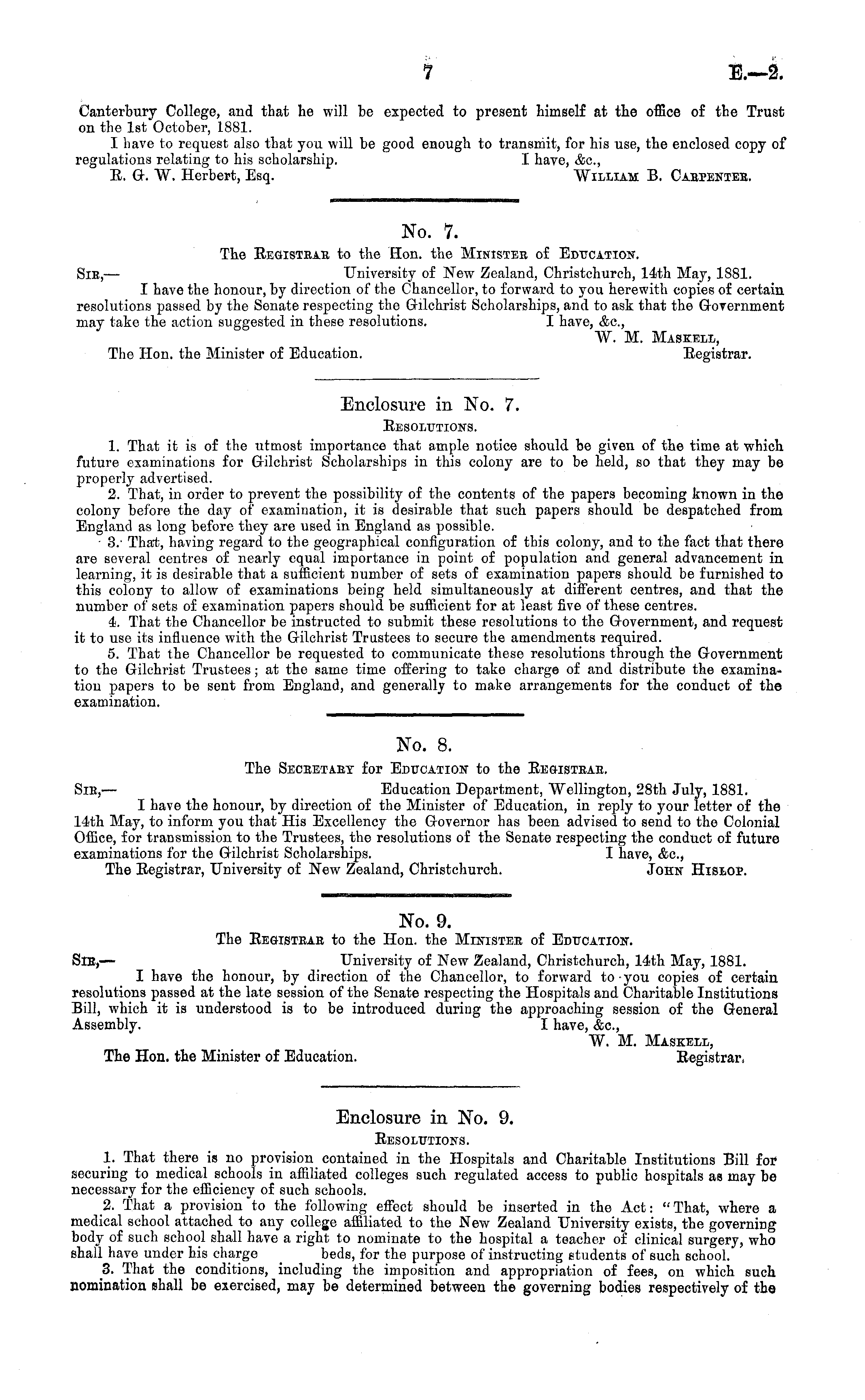 No. 7. The Eegistbar to the Hon. the Minister of Education. Sib, — University of New Zealand, Christchurch, 14th May, 1881. I have the honour, by direction of the Chancellor, to forward to you herewith copies of certain resolutions passed by the Senate respecting the Gilchrist Scholarships, and to ask that the Government may take the action suggested in these resolutions. I have, &c, W. M. Maskell, The Hon. the Minister of Education. Eegistrar.