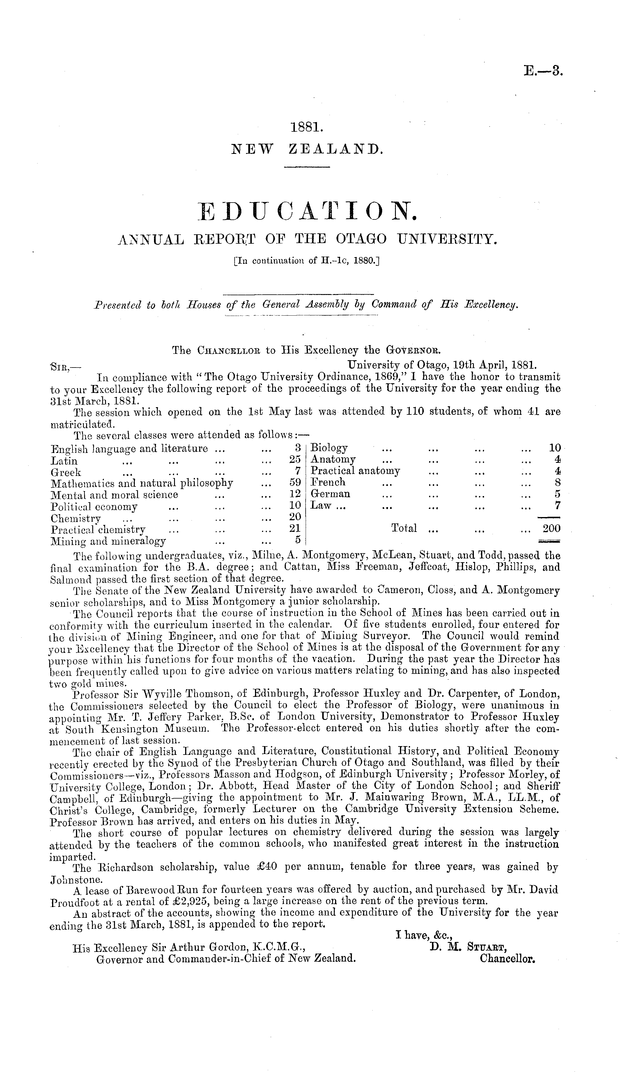 The Chancellor to His Excellency the Goyernob. ■g IE; — University of Otago, 19th April, 1881. In compliance with "The Otago University Ordinance, 18G9," 1 have the honor to transmit to your Excellency the following report of the proceedings of the University for the year ending the 31st March, 1881." The session which opened on the Ist May last was attended by 110 students, of whom 4d are matriculated. The several classes were attended as follows: — English language and literature ... ... 3 Biology ... ... ... ... 10 Latin ... ... •■■ ■■• 25 Anatomy ... ... ... ... 4> Greek ... ... ... ... 7 ! Practical anatomy ... ... ... 4 Mathematics and natural philosophy ... 59 j French ... ... ... ... 8 Mental and moral science ... ... 12 j German ... ... ... ... 5 Political economy ... ... ... 10 Law... ... ... ... ... 7 Chemistry ... ... ... ... 20 -—— Practical chemistry ... ... ... 21 Total ... ... ... 200 Mining and mineralogy ... ... 5 The following undergraduates, viz., Milne, A. Montgomery, McLean, Stuart, and Todd, passed the final examination for the B.A. degree; and Cattail, Miss Freeman, Jefl'coat, Hislop, Phillips, and Salmond passed the first section of that degree. The Senate of the New Zealand University have awarded to Cameron, Closs, and A. Montgomery senior scholarships, and to Miss Montgomery a junior scholarship. The Council reports that the course of instruction in the School of Mines has been earned out in conformity with the curriculum inserted in the calendar. Of five students enrolled, four entered for the division of Mining Engineer, and one for that of Mining Surveyor. The Council would remind your Excellency that the Director of the School of Mines is at the disposal of the Government for any purpose within his functions for four months of the vacation. During the past year the Director has been frequently called upon to give advice on various matters relating to mining, and has also inspected two gold mines. Professor Sir "Wyville Thomson, of Edinburgh, Professor Huxley and Dr. Carpenter, of London, the Commissioners selected by the Council to elect the Professor of Biology, were unanimous in appointing Mr. T. Jeffery Parker. B.Sc. of London University, Demonstrator to Professor Huxley at South Kensington Museum. The Professor-elect entered on his duties shortly after the commencement of last session. The chair of English Language and Literature, Constitutional History, and Political Economy recently erected by the Synod of the Presbyterian Church of Otago and Southland, was filled by their Commissioners —viz., Professors Masson and Hodgson, of Edinburgh University ; Professor Morley, of University College, London; Dr. Abbott, Head Master of the City of London School; and Sheriff Campbell, of Edinburgh —giving the appointment to Mr. J. Mainwaring Brown, M.A., LL.M., of Christ's College, Cambridge, formerly Lecturer on the Cambridge University Extension Scheme. Professor Brown has arrived, and enters on his duties in May. The short course of popular lectures on chemistry delivered during the session was largely attended by the teachers of the common schools, who manifested great interest in the instruction imparted. The Richardson scholarship, value £40 per annum, tenaole for three years, was gained by Jolmstone. A lease of Bare wood Run for fourteen years was offered by auction, and purchased by Mr. David Proudfoot at a rental of £2,925, being a large increase on the rent of the previous term. An abstract of the accounts, showing the income and expenditure of the University for the year ending the 31st March, 1881, is appended to the report. I have, &c, His Excellency Sir Arthur Gordon, K.C.M.G., D. M. Stijaet, Governor and Commander-in-Chief of New Zealand. Chancellor.