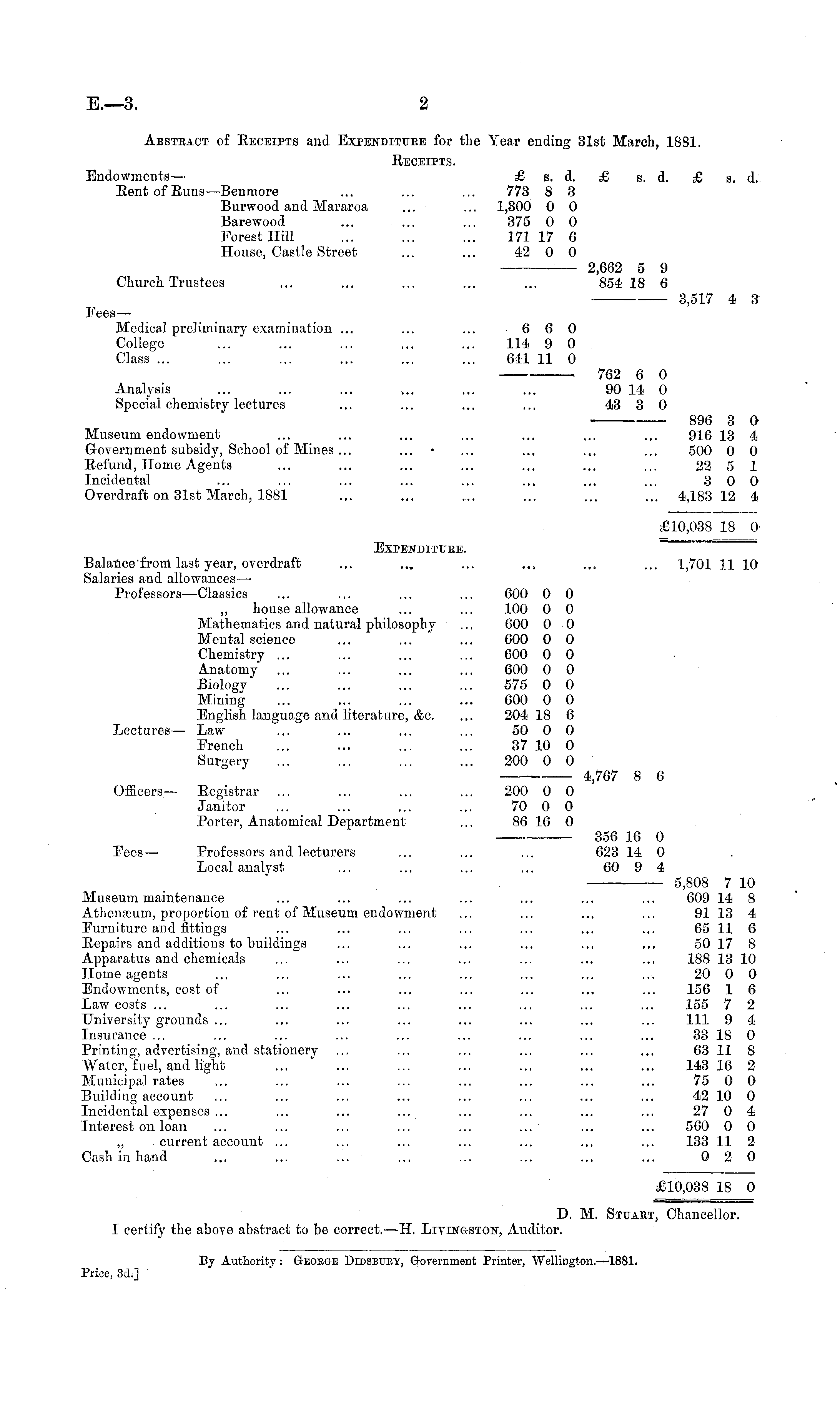 Abstract of Eeceipts and Expenditure for the Year ending 31st March, 1881. Receipts. Endowments— £ s. d. £ b. d. £ s. d. Rent of Runs —Benmore ... ... ... 773 8 3 Burwood and Mararoa ... ... 1,300 0 0 Barewood ... ... ... 375 0 0 Forest Hill ... ... ... 171 17 G House, Castle Street ... ... 42 0 0 2,662 5 9 Church Trustees ... ... ... ... ... 854 18 6 3,517 4 3 Fees— Medical preliminary examination ... ... ... 6 6 0 College ... " ... ... ... ... 114 9 0 Class ... ... ... ... ... ... 641 11 0 762 6 0 Analysis ... ... ... ... ... ... 90 14 0 Special chemistry lectures ... ... ... ... 43 3 0 896 3 0 Museum endowment ... ... ... ... ... ... ... 916 13 4 Grovernment subsidy, School of Mines ... ... • ... ... ... ... 500 0 0 Refund, Home Agents ... ... ... ... ... ... ... 22 5 1 Incidental ... ... ... ... ... ... ... ... 3 0 0 Overdraft on 31st March, 1881 ... ... ... ... ... ... 4,183 12 4 £10,038 18 0 Expenditure. Balancefrom last year, overdraft ... ... ... ... ... ... 1,701 II 10 Salaries and allowances — Professors —Classics ... ... ... ... 600 0 0 ~ house allowance ... ... 100 0 0 Mathematics and natural philosophy ... 600 0 0 Mental science ... ... ' ... 600 0 0 Chemistry ... ... ... ... 600 0 0 Anatomy ... ... ... ... 600 0 0 Biology ... ... ... ... 575 0 0 Mining ... ... ... ... 600 0 0 English language and literature, &c. ... 204 18 6 Lectures — Law ... ... ... ... 50 0 0 French ... ... ... ... 37 10 0 Surgery ... ... ... ... 200 0 0 4,767 8 6 Officers— Registrar ... ... ... ... 200 0 0 Janitor ... ... ... ... 70 0 0 Porter, Anatomical Department ... 86 16 0 356 16 0 Fees— Professors and lecturers ... ... ... 623 14 0 Local analyst ... ... ... ... 60 9 4 5,808 7 10 Museum maintenance ... ... ... ... ... ... ... 609 14 8 Athenasum, proportion of rent of Museum endowment ... ... ... ... 91 13 4 Furniture and fittings ... ... ... ... ... ... ... 65 11 (> Repairs and additions to buildings ... ... ... ... ... ... 50 17 8 Apparatus and chemicals ... ... ... ... ... ... ... 188 13 10 Home agents ... ... ... ... ... ... ... ... 20 0 0 Endowments, cost of ... ... ... ... ... ... ... 156 1 6 Law costs ... ... ... ... ... ... ... ... ... 155 7 2 University grounds ... ... ... ... ... ... ... ... 11l 9 4 Insurance ... ... ... ... ... ... ... ... ... 33 18 0 Printing, advertising, and stationery ... ... ... ... ... ... 63 11 8 Water, fuel, and light ... ... ... ... ... ... ... 143 16 2 Municipal rates ~. ... ... ... ... ... ... ... 75 0 0 Building account ... ... ... ... ... ... ... ... 42 10 0 Incidental expenses ... ... ... ... ... ... ... ... 27 0 4 Interest on loan ... ... ... ... ... ... ... ... 560 0 0 „ current account ... ... ... ... ... ... ... 133 11 2 Cash in hand ... ... ... ... ... ... ... ... 0 2 0 £10,038 18 0 D. M. Stuart, Chancellor. I certify the above abstract to be correct. —H. Liyingoton, Auditor.