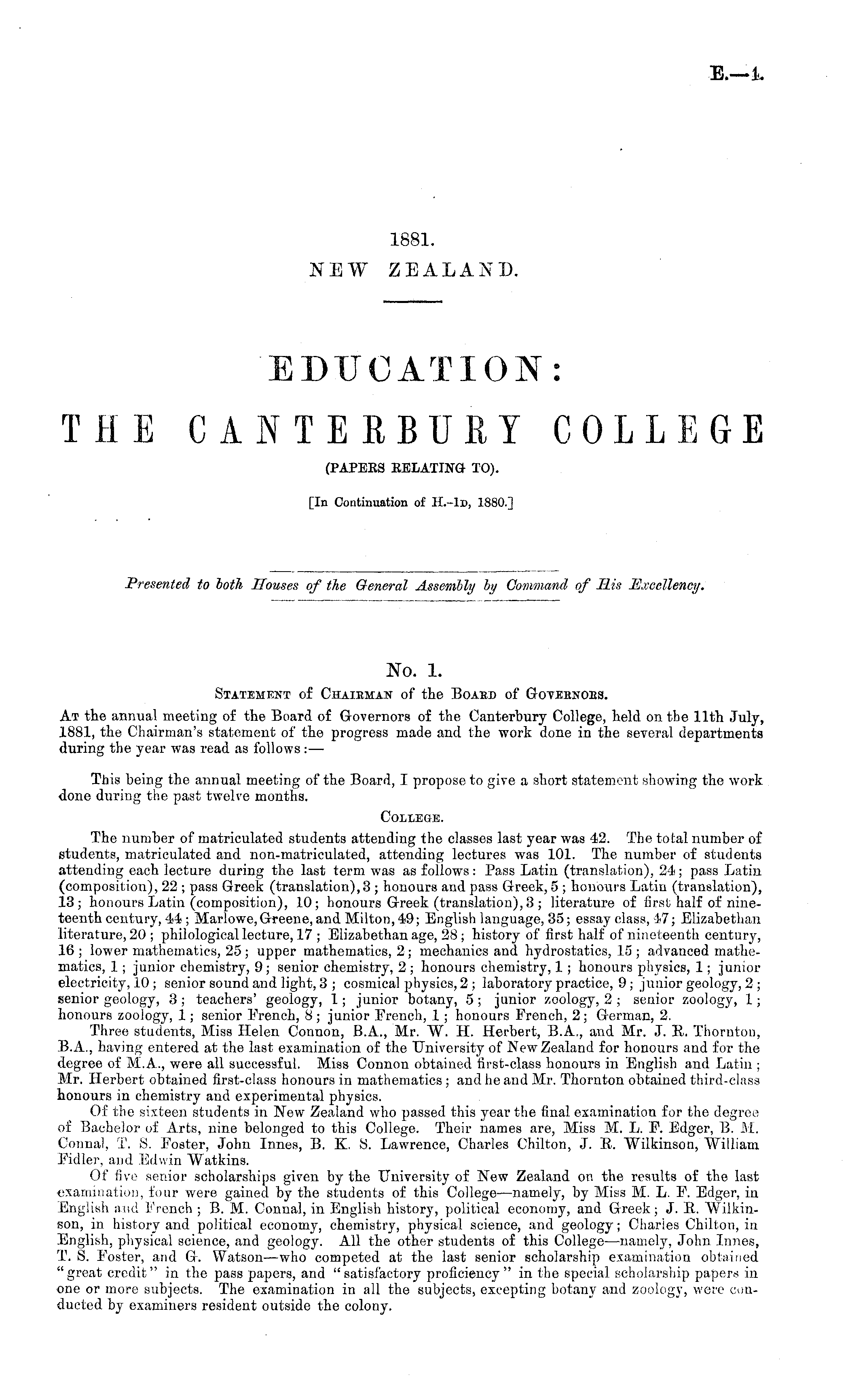 No. 1. Statement of Chairman of the Board of Governors. At the annual meeting of the Board of Governors of the Canterbury College, held on the 11th July, 1881, the Chairman's statement of the progress made and the work done in the several departments during the year was read as follows: — This being the annual meeting of the Board, I propose to give a short statement showing the work done during the past twelve months. College. The number of matriculated students attending the classes last year was 42. The total number of students, matriculated and non-matriculated, attending lectures was 101. The number of students attending each lecture during the last term was as follows: Pass Latin (translation), 24; pass Latin (composition), 22 ; pass Greek (translation), 3 ; honours and pass Greek, 5 ; honours Latin (translation), 13; honours Latin (composition), 10; honours Greek (translation), 3 ; literature of first half of nineteenth century, 44 ; Marlowe, Greene, and Milton, 49; English language, 35; essay class, 17; Elizabethan literature, 20 ; philological lecture, 17 ; Elizabethan age, 28 ; history of first half of nineteenth century, 16 ; lower mathematics, 25 ; upper mathematics, 2 ; mechanics and hydrostatics, 15 ; advanced mathematics, 1; junior chemistry, 9; senior chemistry, 2 ; honours chemistry, 1; honours physics, 1; junior electricity, 10 ; senior sound and light, 3 ; cosmical physics, 2 ; laboratory practice, 9 ; junior geology, 2 ; senior geology, 3; teachers' geology, 1; junior botany, 5 ; junior zoology, 2 ; senior zoology, 1; honours zoology, 1; senior French, 8 ; junior French, 1 ; honours French, 2; German, 2. Three students, Miss Helen Connon, 8.A., Mr. W. H. Herbert, 8.A., and Mr. J. B. Thornton, 8.A., having entered at the last examination of the University of New Zealand for honours and for the degree of M.A., were all successful. Miss Connon obtained first-class honours in English and Latin ; Mr. Herbert obtained first-class honours in mathematics ; and he and Mr. Thornton obtained third-class honours in chemistry and experimental physics. Of the sixteen students in New Zealand who passed this year the final examination for the degree of Bachelor of Arts, nine belonged to this College. Their names are, Miss M. L. F. Edger, B. M. Connal, T. S. Foster, John Innes, B. K. S. Lawrence, Charles Chilton, J. B. Wilkinson, William Fidler, and Edwin Watkins. Of five senior scholarships given by the University of New Zealand on the results of the last examination, four were gained by the students of this College —namely, by Miss M. L. F. Edger, in English and French ; B. M. Connal, in English history, political economy, and Greek; J. B. Wilkinson, in history and political economy, chemistry, physical science, and geology; Charles Chilton, in English, physical science, and geology. All the other students of this College—namely, John Innes, T. S. Foster, and G. Watson—who competed at the last senior scholarship examination obtained "great credit" in the pass papers, and "satisfactory proficiency" in the special scholarship papers in one or more subjects. The examination in all the subjects, excepting botany and zoology, were conducted by examiners resident outside the colony.