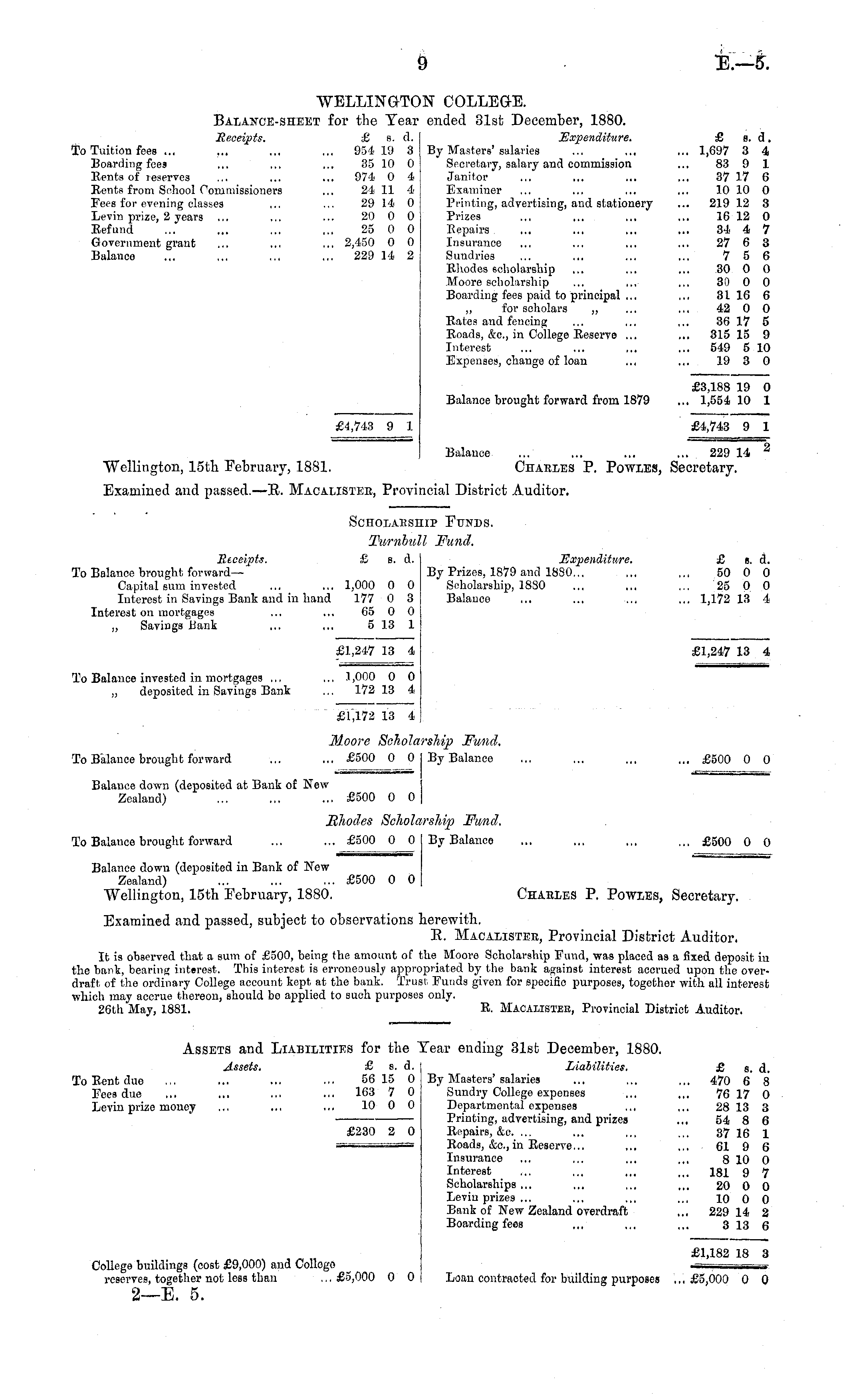 WELLINGTON COLLEGE. Balance-sheet for the Tear ended 31st December, 1880. Receipts. £ s. d. Expenditure. £ s. d. To Tuition fees ... ... ... ... 954 19 3 By Masters'salaries ... ... ... 1,697 3 4 Boarding fees ... ... ... 35 10 0 Secretary, salary and commission ... 83 9 1 Rents of reserves ... ... ... 974 0 4 Janitor ... ... ... ... 37 17 6 Rents from School Commissioners ... 24 11 4 Examiner ... ... ... ... 10 10 0 Fees for evening classes ... ... 29 14 0 Printing, advertising, and stationery ... 219 12 3 Levin prize, 2 years ... ... ... 20 0 0 Prizes ... ... ... ... 16 12 0 Refund ... ... ... ... 25 0 0 Repairs ... ... ... ... 34 4 7 Government grant ... ... ... 2,450 0 0 Insurance ... ... ... ... 27 6 3 Balance ... ... ... ... 229 14 2 Sundries ... ... ... ... 7 5 6 Rhodes scholarship ... ... ... 30 0 O Moore scholarship ... ... ... 30 0 O Boarding fees paid to principal ... .., 3116 6 ~ for scholars „ ... ... 42 0 O Rates and fencing ... ... ... 36 17 5 Roads, &c, in College Reserve ... ... 315 15 9 Interest ... ... ... ... 549 5 10 Expenses, change of loan .., ... 19 3 0 £3,188 19 0 Balance brought forward from 1879 ... 1,554 10 1 £4,743 9 I £4,743 9 1 Balance ... ... ... ... 229 14 2 Wellington, 15th February, 1881. Charles P. Powles, Secretary. Examined and passed.—R. Macalistee, Provincial District Auditor.