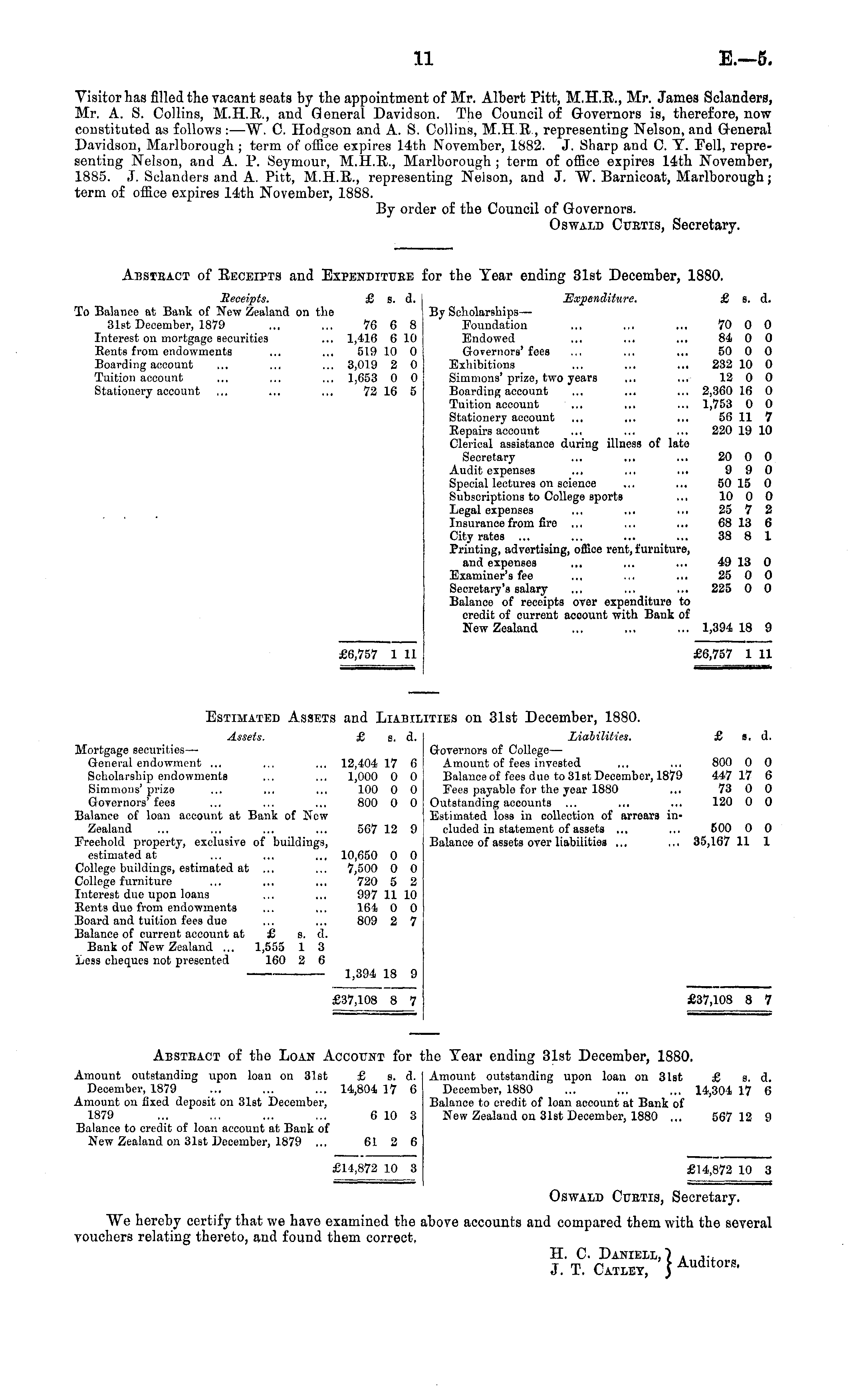 Estimated Assets and Liabilities on 31st December, 1880. Assets. £ s. d. Liabilities. £ s. d. Mortgage securities— Governors of College— General endowment ... ... ... 12,404 17 6 Amount of fees invested ... ... 800 0 0 Scholarship endowments ... ... 1,000 0 0 Balance of fees due to 31st December, 1879 447 17 6 Simmons'prize ... ... ... 100 0 0 Fees payable for the year 1880 ... 73 0 0 Governors'fees ... ... ... 800 0 0 Outstanding accounts ... ... ... 120 0 0 Balance of loan account at Bank of New Estimated loss in collection of arrears inZealand ... ... ... ... 567 12 9 eluded in statement of assets ... ... 500 0 0 Freehold property, exclusive of buildings, Balance of assets over liabilities ... ... 35,167 11 1 estimated at ... ... ... 10,650 0 0 College buildings, estimated at ... ... 7,500 0 0 College furniture ... ... ... 720 5 2 Interest due upon loans ... ... 997 11 10 Rents due from endowments ... ... 164 0 0 Board and tuition fees due ... ... 809 2 7 Balance of current account at £ s. d. Bank of New Zealand ... 1,555 1 3 Less cheques not presented 160 2 6 1,394 18 9 £37,108 8 7 £37,108 8 7