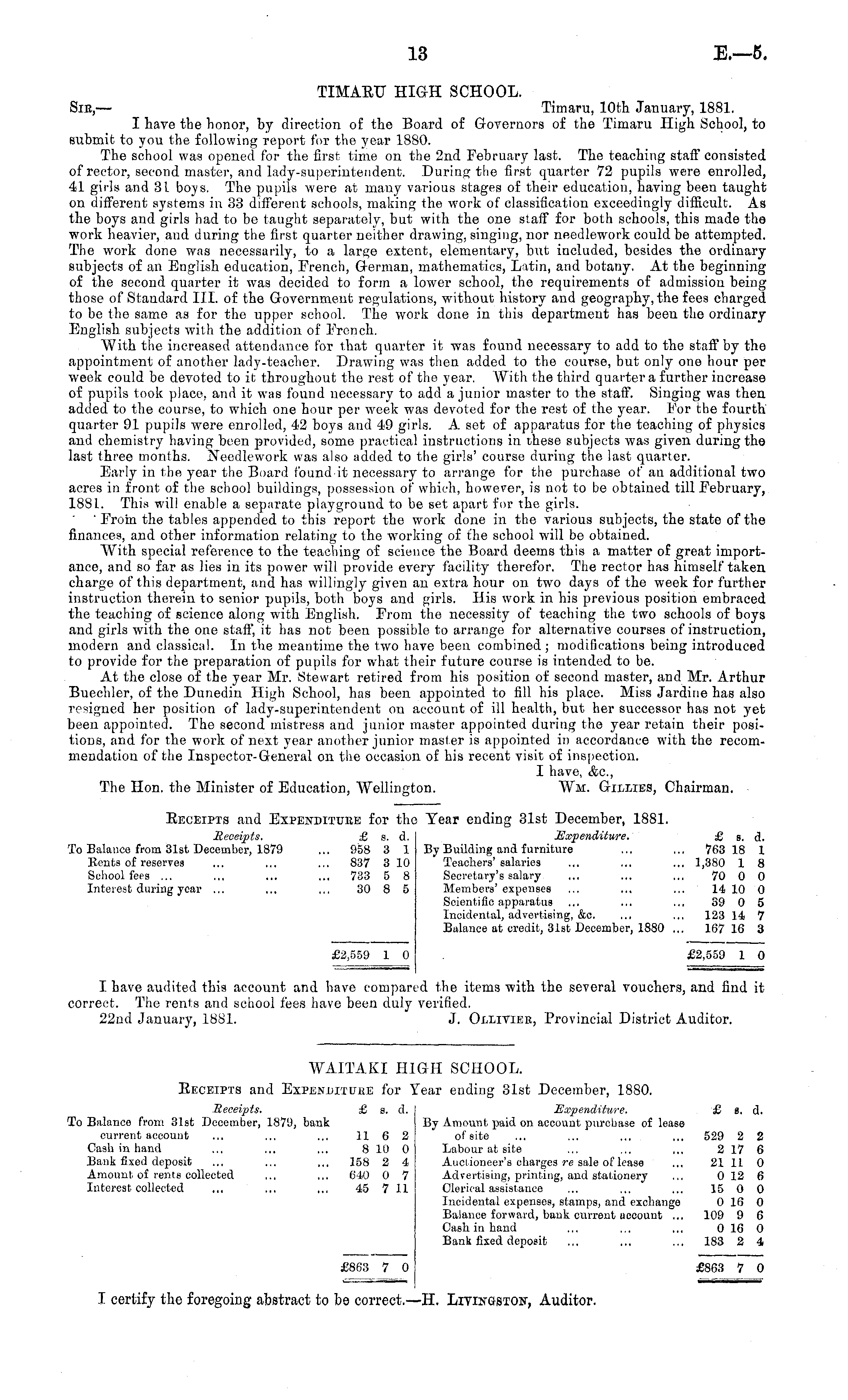 TIMARU HIGH SCHOOL. Sic, — Timaru, 10th January, 1881. I have the honor, by direction of the Board of Governors of the Timaru High School, to submit to you the following report for the year 1880. The school was opened for the first time on the 2nd February last. The teaching staff consisted of rector, second master, and lady-superintendent. During the first quarter 72 pupils were enrolled, 41 girls and 31 boys. The pupils were at many various stages of their education, having been taught on different systems in 33 different schools, making the work of classification exceedingly difficult. As the boys and girls had to be taught separately, but with the one staff for both schools, this made the work heavier, and during the first quarter neither drawing, singing, nor needlework could be attempted. The work done was necessarily, to a large extent, elementary, but included, besides the ordinary subjects of an English education, French, German, mathematics, Latin, and botany. At the beginning of the second quarter it was decided to form a low rer school, the requirements of admission being those of Standard 111. of the Government regulations, without history and geography, the fees charged to be the same as for the upper school. The work done in this department has been the ordinary English subjects with the addition of French. With the increased attendance for that quarter it was found necessary to add to the staff by the appointment of another lady-teacher. Drawing was then added to the course, but only one hour per week could be devoted to it throughout the rest of the year. With the third quarter a further increase of pupils took place, and it was found necessary to add a junior master to the staff. Singing was then added to the course, to which one hour per week was devoted for the rest of the year. For the fourth quarter 91 pupils were enrolled, 42 boys and 49 girls. A set of apparatus for the teaching of physics and chemistry having been provided, some practical instructions in these subjects was given during the last three months. Needlework was also added to the girls' course during the last quarter. Early in the year the Board found it necessary to arrange for the purchase of an additional two acres in front of the school buildings, possession of which, however, is not to be obtained till February, 1881. This will enable a separate playground to be set apart for the girls. ' From the tables appended to this report the work done in the various subjects, the state of the finances, and other information relating to the working of the school will be obtained. With special reference to the teaching of science the Board deems this a matter of great importance, and so far as lies in its power will provide every facility therefor. The rector has himself taken charge of this department, and has willingly given an extra hour on two days of the week for further instruction therein to senior pupils, both boys and girls. His work in his previous position embraced the teaching of science along with English. From the necessity of teaching the two schools of boys and girls with the one staff, it has not been possible to arrange for alternative courses of instruction, modern and classical. In the meantime the two have been combined ; modifications being introduced to provide for the preparation of pupils for what their future course is intended to be. At the close of the year Mr. Stewart retired from his position of second master, and Mr. Arthur Buechler, of the Dunedin High School, has been appointed to fill his place. Miss Jardine has also resigned her position of lady-superintendent on account of ill health, but her successor has not yet been appointed. The second mistress and junior master appointed during the year retain their positions, and for the work of next year another junior master is appointed in accordance with the recommendation of the Inspector-General on the occasion of his recent visit of inspection. I have, &c., The Hon. the Minister of Education, Wellington. Wm. Gillies, Chairman.