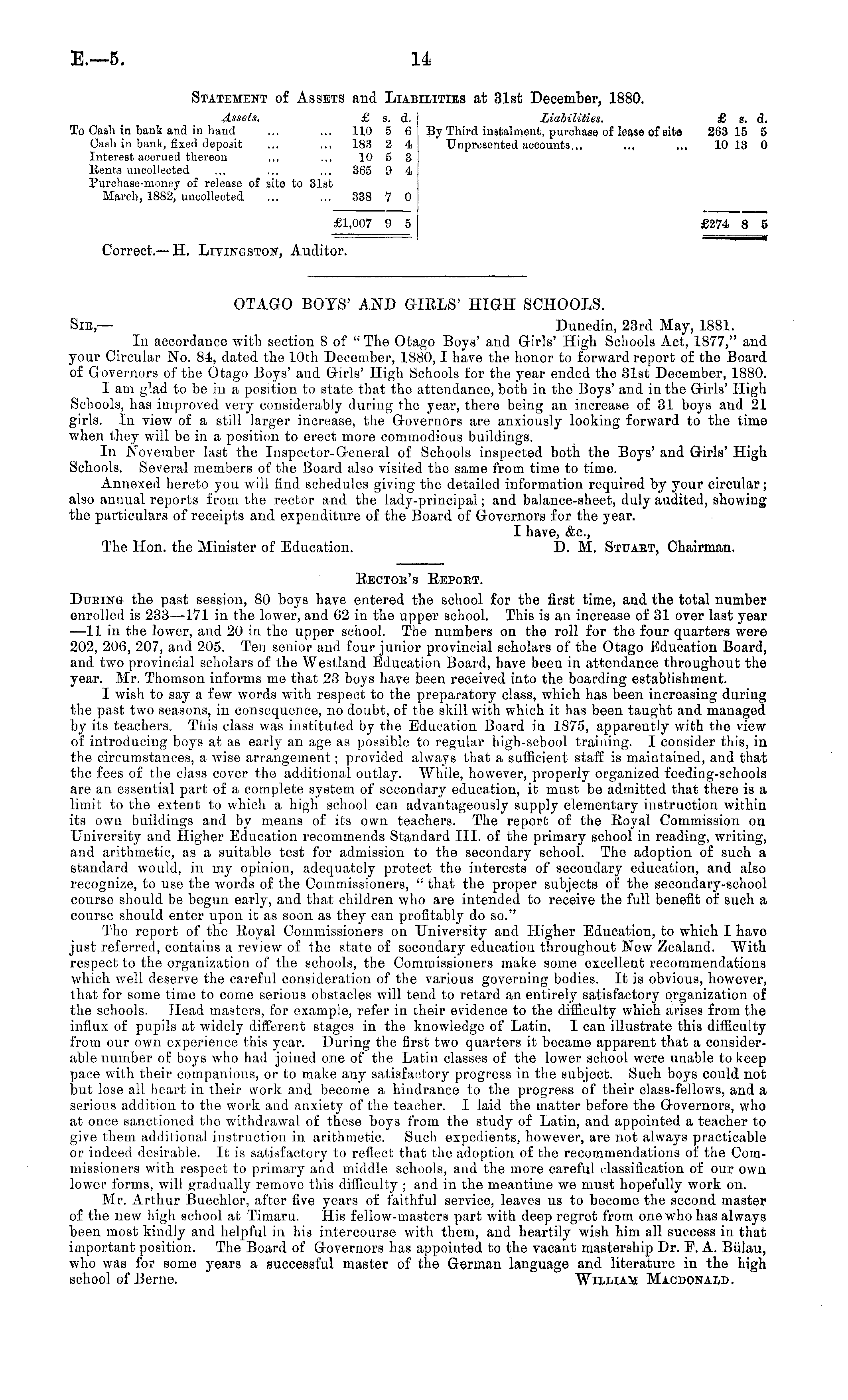 OTAGO BOTS' AND GIRLS' HIGH SCHOOLS. Sic,— Dunedin, 23rd May, 1881. In accordance with section 8 of " The Otago Boys' and Girls' High Schools Act, 1877," and your Circular No. 84, dated the 10th December, 1880,1 have the honor to forward report of the Board of Governors of the Otago Boys' and Girls' High Schools for the year ended the 31st December, 1880. I am glad to be in a position to state that the attendance, both in the Boys' and in the Girls' High Schools, has improved very considerably during the year, there being an increase of 3L boys and 21 girls. In view of a still larger increase, the Governors are anxiously looking forward to the time when they will be in a position to erect more commodious buildings. In November last the Inspector-General of Schools inspected both the Boys' and Girls' High Schools. Several members of the Board also visited the same from time to time. Annexed hereto you will find schedules giving the detailed information required by your circular; also annual reports from the rector and the lady-principal; and balance-sheet, duly audited, showing the particulars of receipts and expenditure of the Board of Governors for the year. I have, &c, The Hon. the Minister of Education. D. M. Stuaet, Chairman.