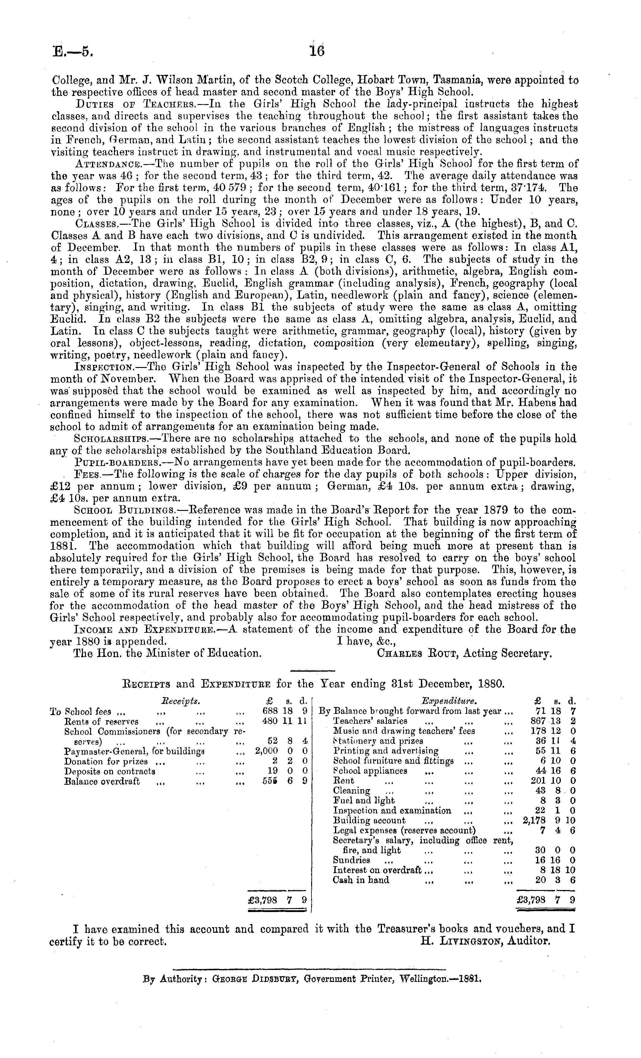 College, and Mr. J. Wilson Martin, of the Scotch College, Hobart Town, Tasmania, were appointed to the respective offices of head master and second master of the Boys' High School. Duties of Teachers. —In the Girls' High School the lady-principal instructs the highest classes, and directs and supervises the teaching throughout the school; the first assistant takes the second division of the school in the various branches of English ; the mistress of languages instructs in French, German, and Latin; the second assistant teaches the lowest division of the school; and the visiting teachers instruct in drawing, and instrumental and vocal music respectively. Attendance.—The number of pupils on the roll of the Girls' High School for the first term of the year was 46 ; for the second term, 43 ; for the third term, 42. The average daily attendance was as follows: For the first term, 40 579 ; for the second term, 40161; for the third term, 37174. The ages of the pupils on the roll during the month of December were as follows : Under 10 years, none ; over 10 years and under 15 years, 23; over 15 years and under 18 years, 19. Classes. —The Girls' High School is divided into three classes, viz., A (the highest), B, and C. Classes A and B have each two divisions, and Cis undivided. This arrangement existed in the month of December. In that month the numbers of pupils in these classes were as follows: In class Al, 4; in class A 2, 13; in class 81, 10; in class 82, 9; in class C, 6. The subjects of study in the month of December were as follows : In class A (both divisions), arithmetic, algebra, English composition, dictation, drawing, Euclid, English grammar (including analysis), French, geography (local and physical), history (English and European), Latin, needlework (plain and fancy), science (elementary), singing, and writing. In class Bl the subjects of study were the same as class A, omitting Euclid. In class B2 the subjects were the same as class A, omitting algebra, analysis, Euclid, and Latin. In class C the subjects taught were arithmetic, grammar, geography (local), history (given by oral lessons), object-lessons, reading, dictation, composition (very elementary), spelling, singing, writing, poetry, needlework (plain and fancy). Inspection—The Girls' High School was inspected by the Inspector-General of Schools in the month of November. When the Board was apprised of the intended visit of the Inspector-General, it was' supposed that the school would be examined as well as inspected by him, and accordingly no arrangements were made by the Board for any examination. When it was found that Mr. Habens had confined himself to the inspection of the school, there was not sufficient time before the close of the school to admit of arrangements for an examination being made. Scholaeships.—There are no scholarships attached to the schools, and none of the pupils hold any of the scholarships established by the Southland Education Board. Pcpil-boaedebs.—No arrangements have yet been made for the accommodation of pupil-boarders. . Fees. —The following is the scale of charges for the day pupils of both schools: Upper division, £12 per annum ; lower division, £9 per annum ; German, £4 10s. per annum extra ; drawing, £4 10s. per annum extra. School Buildings.—Reference was made in the Board's Report for the year 1879 to the commencement of the building intended for the Girls' High School. That building is now approaching completion, and it is anticipated that it will be fit for occupation at the beginning of the first term of 1881. The accommodation which that building will afford being much more at present than is absolutely required for the Girls' High School, the Board has resolved to carry on the boys' school there temporarily, and a division of the premises is being made for that purpose. This, however, is entirely a temporary measure, as the Board proposes to erect a boys' school as soon as funds from the sale of some of its rural reserves have been obtained. The Board also contemplates erecting houses for the accommodation of the head master of the Boys' High School, and the head mistress of the Girls' School respectively, and probably also for accommodating pupil-boarders for each school. Income and Expenditure.—A statement of the income and expenditure of the Board for the year 1880 is appended. I have, &c, The Hon. the Minister of Education. Chaeles Rout, Acting Secretary.