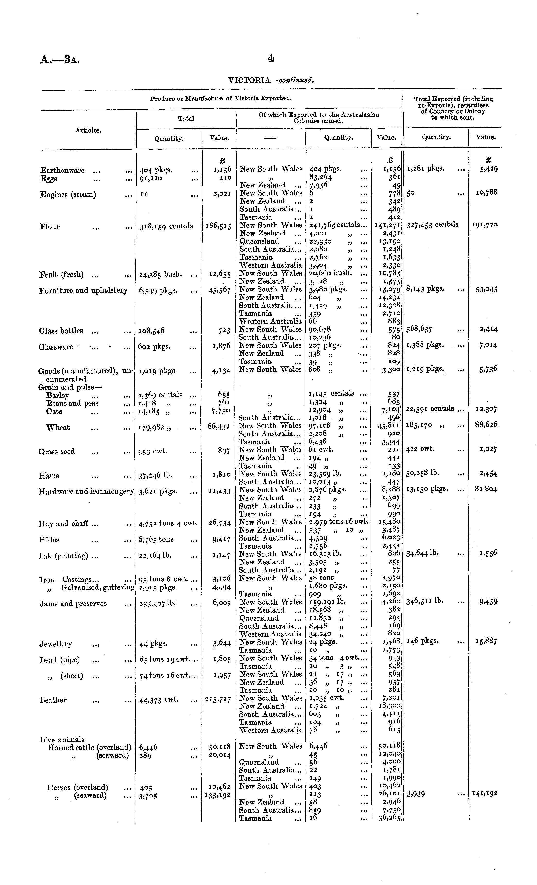 Produce or Manufacture of rictoria Exported. Total Exported (including re-Exports), regardless of Country or ColoDy to wMch sent. Total Of whicli Exported to the Australasian Colonies named. Articles. Quantity. Value. Quantity. Value. Quantity. Value. Earthenware ... ... Eggs 404 pkgs. 91,220 £ 1,156 410 New South Wales 404 pkgs. 83,264 7,956 6 £ 1,156 361 49 778 342 489 412 141,271 2,431 *3,ll)° 1,248 •.633 2,33° 10,785 ',575 I5,o79 14,234 12,328 2,710 883 575 80 824 828 109 3,3oo 1,281 pigs. £ 5,429 Engines (steam) Flour Fruit (fresh) ... 11 ... 318,159 centals 24,385 bush. ... 2,021 186,515 12,655 New Zealand New South Wales New Zealand South Australia... Tasmania New South Wales New Zealand Queensland South Australia... Tasmania Western Australia New South Wales New Zealand New South Wales New Zealand South Australia ... Tasmania Western Australia New South Wales South Australia... New South Wales New Zealand Tasmania New South Wales 2 2 241,765 centals... 4,021 „ 22,350 „ ... 2,080 „ 2,762 „ ... 3,904 „ ... 20,660 bush. ... 3,128 „ 3,980 pkgs. 604 „ i,459 ,. 359 66 50 327,453 centals 8,143 pkgs. 191,720 10,788 Furniture and upholstery 6,549 Pkg3- ••• 45.567 53,245 Glass bottles ... 108,546 368,637 Glassware • 602 pkgs. 723 1,876 90,678 10,236 207 pkgs. 338 „ 39 ., 808 „ 1,388 pkgs. . ... 2,414 7.014 Goods (manufactured), unenumerated Grain and pulse— Barley ... ... Beans and peas Oats 1,019 pkgs. 4.'34 1,219 pkgs. 5.736 Wheat Grass seed .,, Hams Hardware and ironmongery Hay and chaff ... Hides Ink (printing) ,., 1,369 centals ... 1,418 „ 14,185 „ 179,982,, 353 owt. 37,246 lb. 3,621 pkgs. 4,752 tons 4 cwt. 8,765 tons 22,1641b. 655 761 7.750 86,432 897 1,810 ".433 26,734 9.417 i,I47 ,, ,, South Australia... New South Wales South Australia... Tasmania New South Wales New Zealand Tasmania New South Wales South Australia... New South Wales New Zealand South Australia .. Tasmania New South Wales New Zealand South Australia... Tasmania New South Wales New Zealand South Australia... New South Wales 1,145 centals ... 1,324 „ 12,904 „ 1,018 „ 97,108 „ 2,208 „ 6,438 61 cwt. 194 „ 49 ,, 23,5091b. 10,013 .. 2,876 pkgs. 272 „ 235 .. 194 .. ••• 2,979 tons 16 cwt. 537 „ IO „ 4,309 2,756 16,3131b. 3,503 » 2,192 „ 58 tons 1,680 pkgs. 909 „ 159,191 lb. 18,568 „ 11,832 „ 8,448 „ 34,240 „ 24 pkgs. 10 „ 34 tons 4cwt.,.. 20 „ 3 „ ... 21 „ 17 „ ... 36 „ 17 „ ■•• 10 „ 10 „ ... 1,035 cwt. 1,724 „ 603 „ 104 „ 76 „ ... 537 685 7,104 496 45.8" 920 3.344 211 442 i33j 1,180: 447 8,188; 1,307 699 990 15.480 3,487 6,023 2,444 806 255 77 i,97o, 2,150 1,692 4,260 382 294 169 820 1,468 i,773 943 548 563 957 284 7,201 18,302 4.4H 916 615 22,591 centals ... 185,170 „ 422 owt. 50,258 lb. 13.150 Pkg8- ••• 34,6441b. 12,307 88,626 I,O27 2,454 81,804 t.556 Iron —Castings... ... j „ Galvanized, guttering 95 tons 8 cwt.... 2,915 pkgs. 3,106 4.494 346,5111b. Jams and preserves Jewellery ... Lead (pipe) 235.407 lb44 pkgs. 65 tons 19 cwt.... 3>644 1,805 6,005 Tasmania New South Wales New Zealand Queensland South Australia... Western Australia New South Walc3 Tasmania New South Wales Tasmania New South Wales New Zealand Tasmania New South Wales New Zealand South Australia... Tasmania Western Australia 146 pkgs. 15.887 9.459 ,, (sheet) ,,, 74 tons 16 cwt.... J.957 Leather 44.373 <=wt. ... 2i5,7"7 Live animals — Horned cattle (overland) „ (seaward) 6,446 289 50,118 20,014 New South Wales 6,446 45 56 22 50,118 12,040 4,000 1,781 1,990 10,462 26,101 2,946 7,750 36.265 Horses (overland) „ (seaward) 10,462 133,192 Queensland South Australia... Tasmania New South Wales 403 3,705 149 403 113 58 859 26 ,» New Zealand South Australia... Tasmania 3,939 141,192