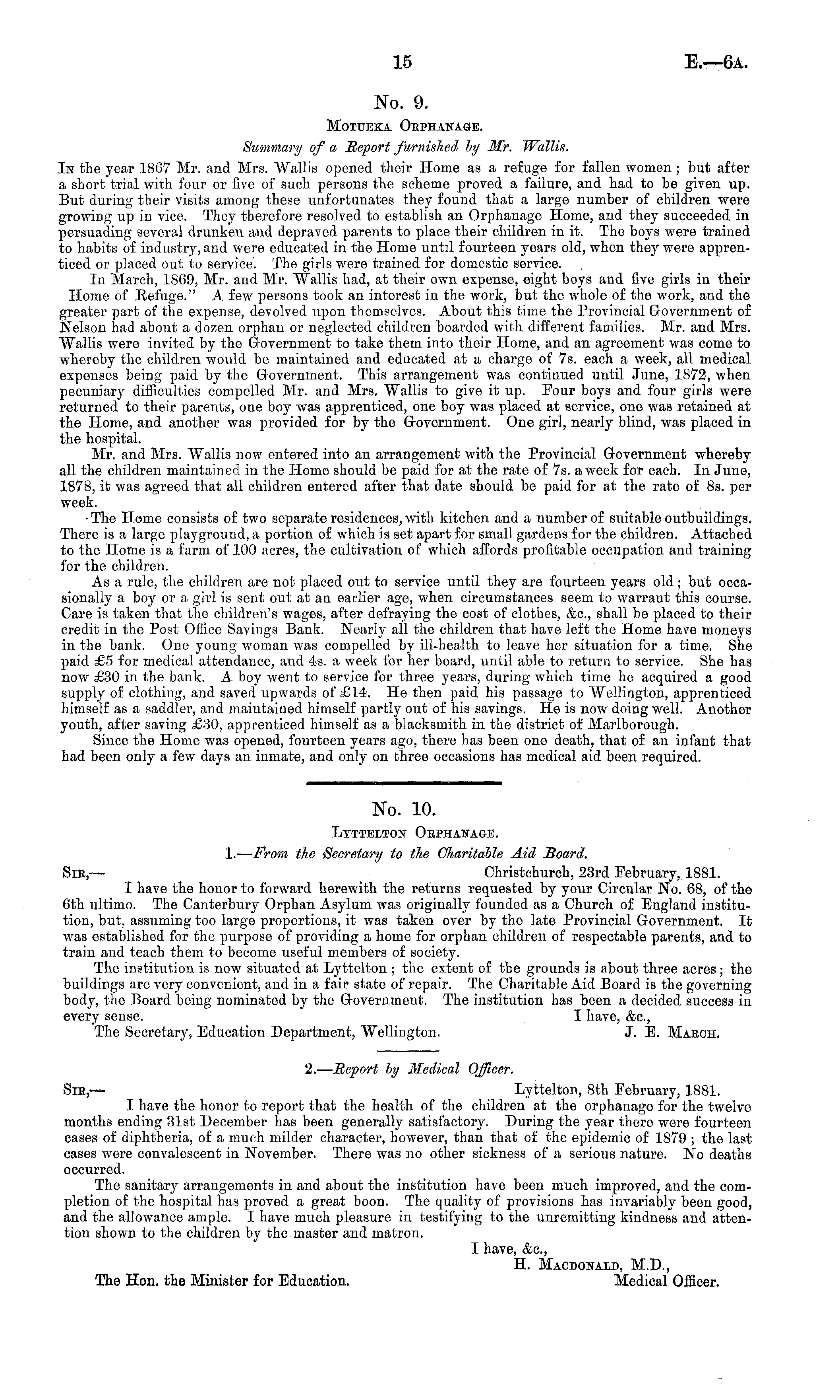No. 9. Motueka Orphanage. Summary of a Report furnished hy Mr. Wallis. In the year 1867 Mr. and Mrs. Wallis opened their Home as a refuge for fallen women; but after a short trial with four or five of such persons the scheme proved a failure, and had to be given up. But during their visits among these unfortunates they found that a large number of children were growing up in vice. They therefore resolved to establish an Orphanage Home, and they succeeded in persuading several drunken and depraved parents to place their children in it. The boys were trained to habits of industry, and were educated in the Home until fourteen years old, when they were apprenticed or placed out to service. The girls were trained for domestic service. In March, 1869, Mr. and Mr. "Wallis had, at their own expense, eight boys and five girls in their Home of Refuge." A few persons took an interest in the work, but the whole of the work, and the greater part of the expense, devolved upon themselves. About this time the Provincial Government of Nelson had about a dozen orphan or neglected children boarded with different families. Mr. and Mrs. Wallis were invited by the Government to take them into their Home, and an agreement was come to whereby the children would be maintained and educated at a charge of 7s. each a week, all medical expenses being paid by the Government. This arrangement was continued until June, 1872, when pecuniary difficulties compelled Mr. and Mrs. Wallis to give it up. Four boys and four girls were returned to their parents, one boy was apprenticed, one boy was placed at service, one was retained at the Home, and another was provided for by the Government. One girl, nearly blind, was placed in the hospital. Mr. and Mrs. Wallis now entered into an arrangement with the Provincial Government whereby all the children maintained in the Home should be paid for at the rate of 7s. a week for each. In June, 1878, it was agreed that all children entered after that date should be paid for at the rate of Bs. per week. -The Home consists of two separate residences, with kitchen and a number of suitable outbuildings. There is a large playground, a portion of which is set apart for small gardens for the children. Attached to the Home is a farm of 100 acres, the cultivation of which affords profitable occupation and training for the children. As a rule, the children are not placed out to service until they are fourteen years old ; but occasionally a boy or a girl is sent out at an earlier age, when circumstances seem to warrant this course. Care is taken that the children's wages, after defraying the cost of clothes, &c, shall be placed to their credit in the Post Office Savings Bank. Nearly all the children that have left the Home have moneys in the bank. One young woman was compelled by ill-health to leave her situation for a time. She paid £5 for medical attendance, and 4s. a week for her board, until able to return to service. She has now £30 in the bank. A boy went to service for three years, during which time he acquired a good supply of clothing, and saved upwards of £14. He then paid his passage to Wellington, apprenticed himself as a saddler, and maintained himself partly out of his savings. He is now doing well. Another youth, after saving £30, apprenticed himself as a blacksmith in the district of Marlborough. Since the Home was opened, fourteen years ago, there has been one death, that of an infant that had been only a few days an inmate, and only on three occasions has medical aid been required.