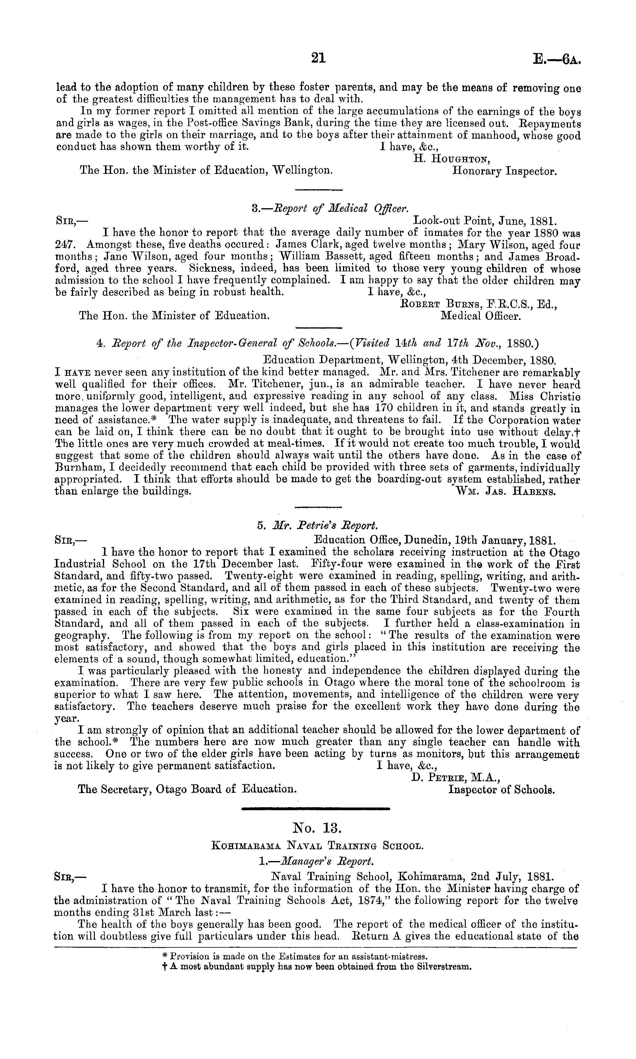 4. Beport of the Inspector-General of Schools. — (Visited Uth and 17th Nov., 1880.) Education Department, Wellington, 4th December, 1880. I hate never seen any institution of the kind better managed. Mr. and Mrs. Titchener are remarkably well qualified for their offices. Mr. Titchener, jun., is an admirable teacher. I have never heard more, uniformly good, intelligent, and expressive reading in any school of any class. Miss Christie manages the lower department very well indeed, but she has 170 children in it, and stands greatly in need of assistance.* The water supply is inadequate, and threatens to fail. If the Corporation water can be laid on, I think there can be no doubt that it ought to be brought into use without delay.f The little ones are very much crowded at meal-times. If it would not create too much trouble, I would suggest that some of the children should always wait until the others have done. As in the case of Burnham, I decidedly recommend that each child be provided with three sets of garments, individually appropriated. I think that efforts should be made to get the boarding-out system established, rather than enlarge the buildings. Wm. Jas. Habeas.