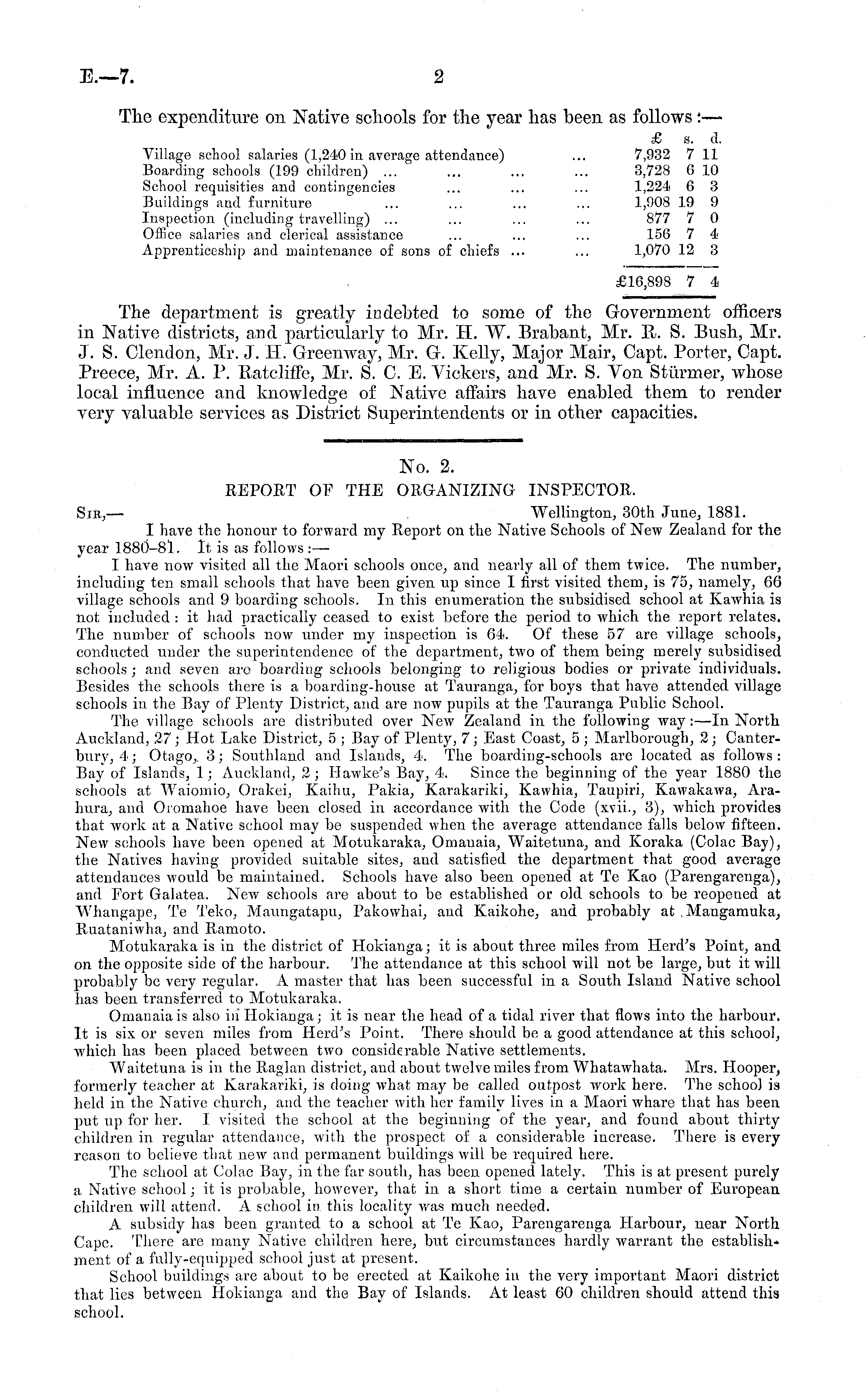 No. 2. REPORT OF THE ORGANIZING INSPECTOR. Sir,— Wellington, 30th June, 1881. I have the honour to forward my Report on the Native Schools of New Zealand for the year 1880-81. It is as follows :— I have now visited all the Maori schools once, and nearly all of them twice. The numher, including ten small schools that have heen given up since I "first visited them, is 75, namely, 66 village schools and 9 boarding schools. In this enumeration the subsidised school at Kawhia is not included : it had practically ceased to exist before the period to which the report relates. The number of schools now under my inspection is 64. Of these 57 are village schools, conducted under the superintendence of the department, two of them being merely subsidised schools ; and seven are boarding schools belonging to religious bodies or private individuals. Besides the schools there is a boarding-house at Tauranga, for boys that have attended village schools in the Bay of Plenty District, and are now pupils at the Tauranga Public School. The village schools are distributed over New Zealand in the following way:—In North Auckland, 27; Hot Lake District, 5 ; Bay of Plenty, 7; East Coast, 5 ; Marlborough, 2; Canterbury, 4; Otago,. 3; Southland and Islands, 4. The boarding-schools are located as follows: Bay of Islands, 1; Auckland, 2; Hawke's Bay, 4. Since the beginning of the year 1880 the schools at Waiomio, Orakei, Kaihu, Pakia, Karakariki, Kawhia, Taupiri, Kawakawa, Arahura, and Oromahoe have been closed in accordance with the Code (xvii., 3), which provides that work at a Native school may be suspended when the average attendance falls below fifteen. New schools have been opened at Motukaraka, Omanaia, Waitetuna, and Koraka (Colac Bay), the Natives having provided suitable sites, and satisfied the department that good average attendances would bo maintained. Schools have also been opened at Te Kao (Parengarenga), and Fort Galatea. New schools are about to be established or old schools to be reopened at Whangape, Te Teko, Maungatapu, Pakowhai, and Kaikohe, and probably at , Mangamuka, Ruataniwha, and Ramoto. Motukaraka is in the district of Hokianga; it is about three miles from Herd's Point, and on the opposite side of the harbour. The attendance at this school will not be large, but it will probably be very regular. A master that has been successful in a South Island Native school has been transferred to Motukaraka. Omanaia is also in Hokianga ; it is near the head of a tidal river that flows into the harbour. It is six or seven miles from Herd's Point. There should be a good attendance at this school, which has been placed between two considerable Native settlements. Waitetuna is in the Raglan district, and about twelve miles from Whatawhata. Mrs. Hooper, formerly teacher at Karakariki, is doing what may be called outpost work here. The school is held in the Native church, and the teacher with her family lives in a Maori whare that has been put up for her. I visited the school at the beginning of the year, and found about thirty children in regular attendance, with the prospect of a considerable increase. There is every reason to believe that new and permanent buildings will be required here. The school at Colac Bay, in the far south, has been opened lately. This is at present purely a Native school; it is probable, however, that in a short time a certain number of European children will attend. A school in this locality was much needed. A subsidy has been granted to a school at Te Kao, Parengarenga Harbour, near North Cape. There are many Native children here, but circumstances hardly warrant the establishment of a fully-equipped school just at present. School buildings are about to be erected at Kaikohe in the very important Maori district that lies between Hokianga and the Bay of Islands. At least 60 children should attend this school.