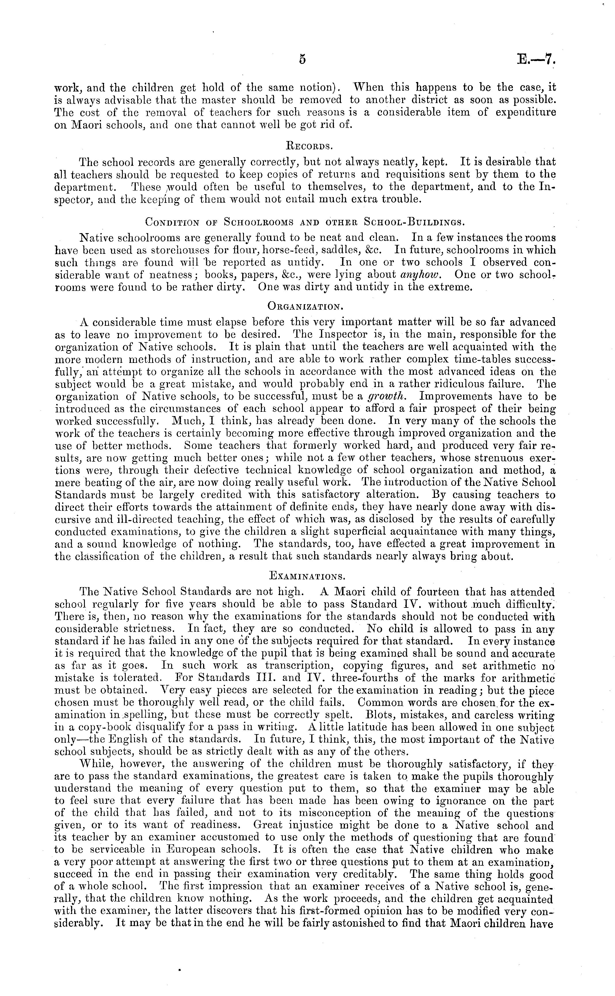work, and the children get hold of the same notion). When this happens to be the case, it is always advisable that the master should be removed to another district as soon as possible. The cost of the removal of teachers for such reasons is a considerable item of expenditure on Maori schools, and one that cannot well be got rid of. Records. The school records are generally correctly, but not always neatly, kept. It is desirable that all teachers should be requested to keep copies of returns and requisitions sent by them to the department. These .would often be useful to themselves, to the department, and to the Inspector, and the keeping of them would not entail much extra trouble. Condition of Schoolrooms and other School-Buildings. Native schoolrooms are generally found to be neat and clean. In a few instances the rooms have been used as storehouses for flour, horse-feed, saddles, &c. In future, schoolrooms in which such things are found will 'be reported as untidy. In one or two schools I observed considerable want of neatness; books, papers, &c, were lying about anyhow. One or two school? rooms were found to be rather dirty. One was dirty and untidy in the extreme. Organization. A considerable time must elapse before this very important matter will be so far advanced as to leave no improvement to be desired. The Inspector is, in the main, responsible for the organization of Native schools. It is plain that until the teachers are well acquainted with the more modern methods of instruction, and are able to work rather complex time-tables successfully, ah attempt to organize all the schools in accordance with the most advanced ideas on the subject would be a great mistake, and would probably end in a rather ridiculous failure. The organization of Native schools, to be successful, must be a growth. Improvements have to be introduced as the circumstances of each school appear to afford a fair prospect of their being worked successfully. Much, I think, has already been done. In very many of the schools the work of the teachers is certainly becoming more effective through improved organization and the use of better methods. Some teachers that formerly worked hard, and produced very fair results, are now getting much better ones; while not a few other teachers, whose strenuous exertions were, through their defective technical knowledge of school organization and method, a mere beating of the air, are now doing really useful work. The introduction of the Native School Standards must be largely credited with this satisfactory alteration. By causing teachers to direct their efforts towards the attainment of definite ends, they have nearly done away with discursive and ill-directed teaching, the effect of which was, as disclosed by the results of carefully conducted examinations, to give the children a slight superficial acquaintance with many things, and a sound knowledge of nothing. The standards, too, have effected a great improvement in the classification of the children, a result that such standards nearly always bring about. Examinations. The Native School Standards are not high. A Maori child of fourteen that has attended school regularly for five years should be able to pass Standard IV. without much difficulty. There is, then, no reason why the examinations for the standards should not be conducted with considerable strictness. In fact, they are so conducted. No child is allowed to pass in any standard if he has failed in any one of the subjects required for that standard. In every instance it is required that the knowledge of the pupil that is being examined shall be sound and accurate as far as it goes. In such work as transcription, copying figures, and set arithmetic no mistake is tolerated. For Standards 111. and IV. three-fourths of the marks for arithmetic must be obtained. Very easy pieces are selected for the examination in reading; but the piece chosen must be thoroughly well road, or the child fails. Common words are chosen for the examination in .spelling, but these must be correctly spelt. Blots, mistakes, and careless writing in a copy-book disqualify for a pass in writing. A little latitude has been allowed in one subject only—the English of the standards. In future, I think, this, the most important of the Native school subjects, should be as strictly dealt with as any of the others. While, however, the answering of the children must be thoroughly satisfactory, if they are to pass the standard examinations, the greatest care is taken to make the pupils thoroughly understand the meaning of every question put to them, so that the examiner may be able to feel sure that every failure that has been made has been owing to ignorance on the part of the child that has failed, and not to its misconception of the meaning of the questions given, or to its want of readiness. Great injustice might be done to a Native school and its teacher by an examiner accustomed to use only the methods of questioning that are found to be serviceable in European schools. It is often the case that Native children who make a very poor attempt at answering the first two or three questions put to them at an examination succeed in the end in passing their examination very creditably. The same thing holds good of a whole school. The first impression that an examiner receives of a Native school is, generally, that the children know nothing. As the work proceeds, and the children get acquainted with the examiner, the latter discovers that his first-formed opinion has to be modified very considerably. It may be that in the end he will be fairly astonished to find that Maori children have