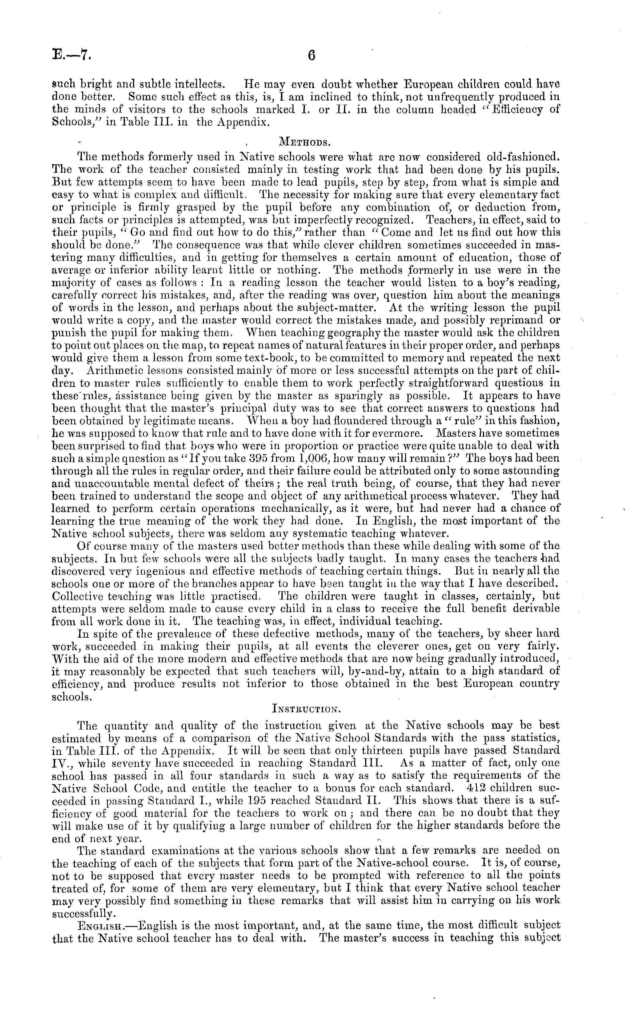 such bright and subtle intellects. He may even doubt whether European children could have done better. Some such effect as this, is, lam inclined to think, not unfrequently produced in the minds of visitors to the schools marked I. or 11. in the column headed "Efficiency of Schools," in Table 111. in the Appendix. Methods. The methods formerly used in Native schools were what are now considered old-fashioned. The work of the teacher consisted mainly in testing work that had been done by his pupils. But few attempts seem to have been made to lead pupils, step by step, from what is simple and easy to what is complex and difficult. The necessity for making sure that every elementary fact or principle is firmly grasped by the pupil before any combination of, or deduction from, such facts or principles is attempted, was but imperfectly recognized. Teachers, in effect, said to their pupils, " Go and find out how to do this," rather than " Come and let us find out how this should be done." The consequence was that while clever children sometimes succeeded in mastering many difficulties, and in getting for themselves a certain amount of education, those of average or inferior ability learnt little or nothing. The methods formerly in use were in the majority of cases as follows : In a reading lesson the teacher would listen to a boy's reading, carefully correct his mistakes, and, after the reading was over, question him about the meanings of words in the lesson, and perhaps about the subject-matter. At tho writing lesson the pupil would write a copy, and the master would correct the mistakes made, and possibly reprimand or punish the pupil for making them, When teaching geography the master would ask the children to point out places on the map, to repeat names of natural features in their proper order, and perhaps would give them a lesson from some text-book, to be committed to memory and repeated the next day. Arithmetic lessons consisted mainly of more or less successful attempts on the part of children to master rules sufficiently to enable them to work perfectly straightforward questions in these'rules, assistance being given by the master as sparingly as possible. It appears to have been thought that the master's principal duty was to see that correct answers to questions had been obtained by legitimate means. When a boy had floundered through a " rule" in this fashion, he was supposed to know that rule and to have done with it for evermore. Masters have sometimes been surprised to find that boys who were in proportion or practice were quite unable to deal with such a simple question as "If you take 395 from 1,006, how many will remain?" The boys had been through all the rules in regular order, and their failure could be attributed only to some astounding and unaccountable mental defect of theirs; the real truth being, of course, that they had never been trained to understand the scope and object of any arithmetical process whatever. They had learned to perform certain operations mechanically, as it were, but had never had a chance of learning the true meaning of the work they had done. In English, the most important of the Native school subjects, there was seldom any systematic teaching whatever. Of course many of the masters used better methods than these while dealing with some of the subjects. In but few schools were all the subjects badly taught. In many cases the teachers had discovered very ingenious and effective methods of teaching certain things. But in nearly all the schools one or more of the branches appear to have been taught in the way that I have described. Collective teaching was little practised. The children were taught in classes, certainly, but attempts were seldom made to cause every child in a class to receive the full benefit derivable from all work done in it. The teaching was, in effect, individual teaching. In spite of the prevalence of these defective methods, many of the teachers, by sheer hard work, succeeded in making their pupils, at all events the cleverer ones, get on very fairly. With the aid of the more modern and effective methods that are now being gradually introduced, it may reasonably be expected that such teachers will, by-and-by, attain to a high standard of efficiency, and produce results not inferior to those obtained in the best European country schools. Instruction. The quantity and quality of the instruction given at the Native schools may be best estimated by means of a comparison of the Native School Standards with the pass statistics, in Table 111. of the Appendix. It will be seen that only thirteen pupils have passed Standard IV., while seventy have succeeded in reaching Standard 111. As a matter of fact, only one school has passed in all four standards in such a way as to satisfy the requirements of the Native School Code, and entitle the teacher to a bonus for each standard. 412 children succeeded in passing Standard 1., while 195 reached Standard 11. This shows that there is a sufficiency of good material for the teachers to work on ; and there can be no doubt that they will make use of it by qualifying a large number of children for the higher standards before the end of next year. The standard examinations at the various schools show that a few remarks are needed on the teaching of each of the subjects that form part of the Native-school course. It is, of course, not to be supposed that every master needs to be prompted with reference to all the points treated of, for some of them are very elementary, but I think that every Native school teacher may very possibly find something in these remarks that will assist him in carrying on his work successfully. English.—English is the most important, and, at the same time, the most difficult subject that the Native school teacher has to deal with. The master's success in teaching this subject