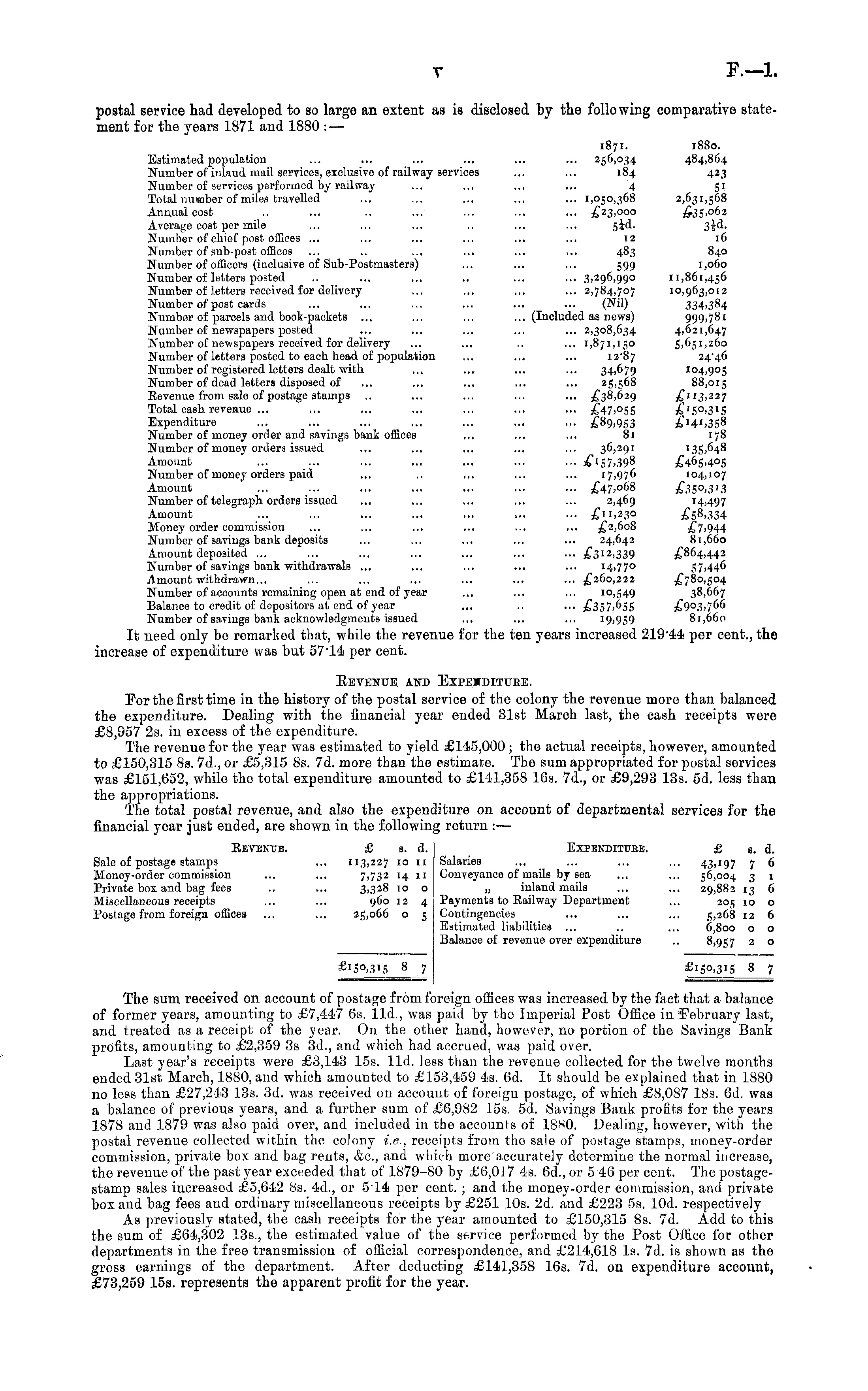 postal service had developed to so large an extent as is disclosed by the following comparative statement for the years 1871 and 1880 : — 1871. 1880. Estimated population ... ... ... ... ... ... 256,034 484,864 Number of inland mail services, exclusive of railway services ... ... 184 423 Number of services performed by railway ... ... ... ... 4 51 Total number of miles travelled ... ... ... ... ... 1,050,368 2,631,568 Annual cost .. ... .. ... ... ... ... £23,000 £35.062 Average cost per mile ... ... ... .. ... ... sid. 3jd. Number of chief post offices ... ... ... ... ... ... 12 16 Number of sub-post offices ... .. ... ... ... ... 483 840 Number of officers (inclusive of Sub-Postmasters) ... ... ... 599 1,060 Number of letters posted .. ... ... .. ... ... 3,296,990 11,861,456 Number of letters received for delivery ... ... ... ... 2,784,707 10,963,012 Number of post cards ... ... ... ... ... ... (Nil) 334,384 Number of parcels and book-packets ... ... ... ... (Included as news) 999,781 Number of newspapers posted ... ... ... ... ... 2,308,634 4,621,647 Number of newspapers received for delivery ... ... .. ... 1,871,150 5,651,260 Number of letters posted to each head of population ... ... ... 12-87 24-46 Number of registered letters dealt with ... ... ... ... 34,679 104,905 Number of dead letters disposed of ... ... ... ... ... 25,568 88,015 Kevenue from sale of postage stamps .. ... ... ... ... £38,629 £113,227 Total cash revenue ... ... ... ... ... ... ... £47,055 £'5°,315 Expenditure ... ... ... ... ... ... ... £89,953 £i4!,358 Number of money order and savings bank offices ... ... ... 81 178 Number of money orders issued ... ... ... ... ... 36,291 135,648 Amount ... ... ... ... ... ... ... £157,398 £465,405 Number of money orders paid ... .. ... ... ... 17,976 104,107 Amount ... ... ... ... ... ... ... £47,068 £35°>3'3 Number of telegraph orders issued ... ... ... ... ... 2,469 H,497 Amount ... ... ... ... ... ... ... £11,230 £58,334 Money order commission ... ... ... ... ... ... £2,608 £7,944 Number of savings bank deposits ... ... ... ... ... 24,642 81,660 Amount deposited ... ... ... ... ... ... ... £312,339 £864,442 Number of savings bank withdrawals ... ... ... ... ... 14,770 57,446 Amount withdrawn... ... ... ... ... ... ... £260,222 £780,504 Number of accounts remaining open at end of year ... ... ... 10,549 38,667 Balance to credit of depositors at end of year ... .. ... £357,655 £903,766 Number of savings bank acknowledgments issued ... ... ... 19,959 81,660 It need only be remarked that, while the revenue for the ten years increased 219'44 per cent., the increase of expenditure was but 57'14 per cent. Beventte and Expenditure. For the first time in the history of the postal service of the colony the revenue more than balanced the expenditure. Dealing with the financial year ended 3.lst March last, the cash receipts were £8,957 2s. in excess of the expenditure. The revenue for the year was estimated to yield £145,000 ; the actual receipts, however, amounted to £150,315 Bs. 7d., or £5,315 Bs. 7d. more than the estimate. The sum appropriated for postal services was £151,652, while the total expenditure amounted to £141,358 16s. 7d., or £9,293 13s. sd. less than the appropriations. The total postal revenue, and also the expenditure on account of departmental services for the financial, year just ended, are shown in the following return : — Kevenue. £ a. d. Expenditube. £ g. d. Sale of postage stamps ... 113,227 10 11 Salaries ... ... ... ... 43,197 7 6 Money-order commission ... ... 7,732 14 n Conveyance of mails by sea ... ... 56,004 3 1 Private box and bag fees .. ... 3,328 10 o „ inland mails ... ... 29,882 13 6 Miscellaneous receipts ... ... 960 12 4 Payments to Railway Department ... 205 10 o Postage from foreign offices ... ... 25,066 o 5 Contingencies ... ... ... 5,268 12 6 Estimated liabilities ... .. ... 6,800 o o Balance of revenue over expenditure .. 8,957 2 o £150,315^8 7 £150.315 8 7 The sum received on account of postage from foreign offices was increased by the fact that a balance of former years, amounting to £7,447 6s. lid., was paid by the Imperial Post Office in February last, and treated as a receipt of the year. On the other hand, however, no portion of the Savings Bank profits, amounting to £2,359 3s 3d., and which had accrued, was paid over. Last year's receipts were £3,143 15s. lid. less than the revenue collected for the twelve months ended 31st March, 1880, and which amounted to £153,459 4s. 6d. It should be explained that in 1880 no less than £27,243 13s. 3d. was received on account of foreign postage, of which £8,087 18s. 6d. was a balance of previous years, and a further sum of £6,982 15s. sd. Savings Bank profits for the years 1878 and 1879 was also paid over, and included in the accounts of 18s0. Dealing, however, with the postal revenue collected within the colony i.e., receipts from the sale of postage stamps, money-order commission, private box and bag rents, &c, and which more accurately determine the normal increase, the revenue of the past year exceeded that of 1879-80 by £6,017 4s. 6d., or 546 per cent. The postagestamp sales increased £5,642 Bs. 4d., or 5'14 per cent. ; and the money-order commission, and private box and bag fees and ordinary miscellaneous receipts by £251 10s. 2d. and £223 ss. lOd. respectively As previously stated, the cash receipts for the year amounted to £150,315 Bs. 7d. Add to this the sum of £64,302 135., the estimated value of the service performed by the Post Office for other departments in the free transmission of official correspondence, and £214,618 Is. 7d. is shown as the gross earnings of the department. After deducting £141,358 16s. 7d. on expenditure account, £73,259 15s. represents the apparent profit for the year.