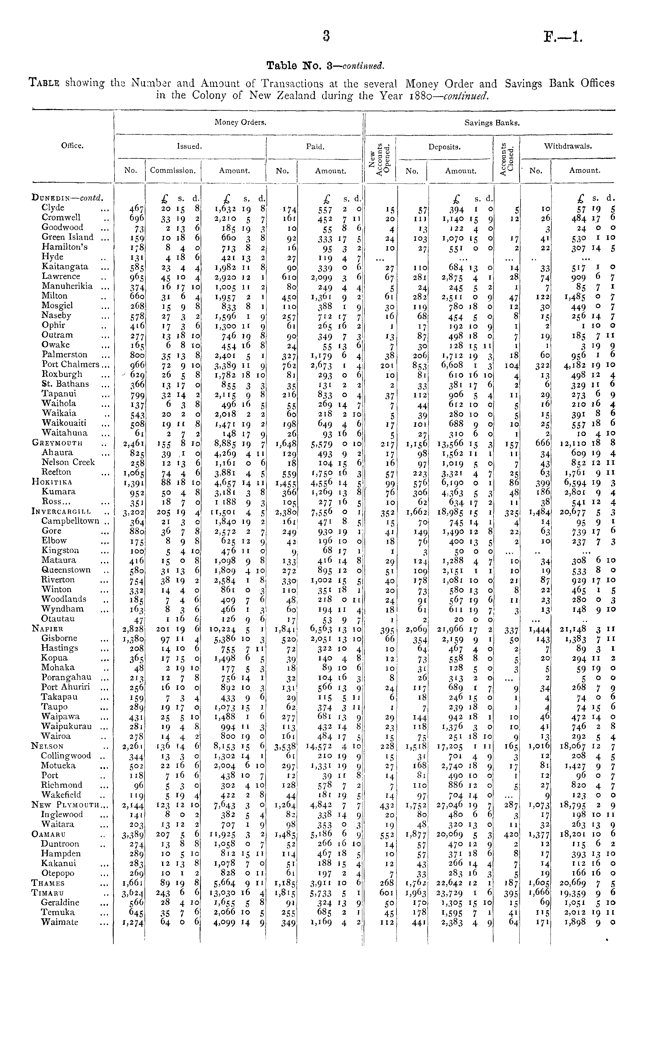 Table No. 3— continued. Table showing the Number and Amount of Transactions at the several Money Order and Savings Bank Offices in the Colony of New Zealand during the Year 1880 — continued.