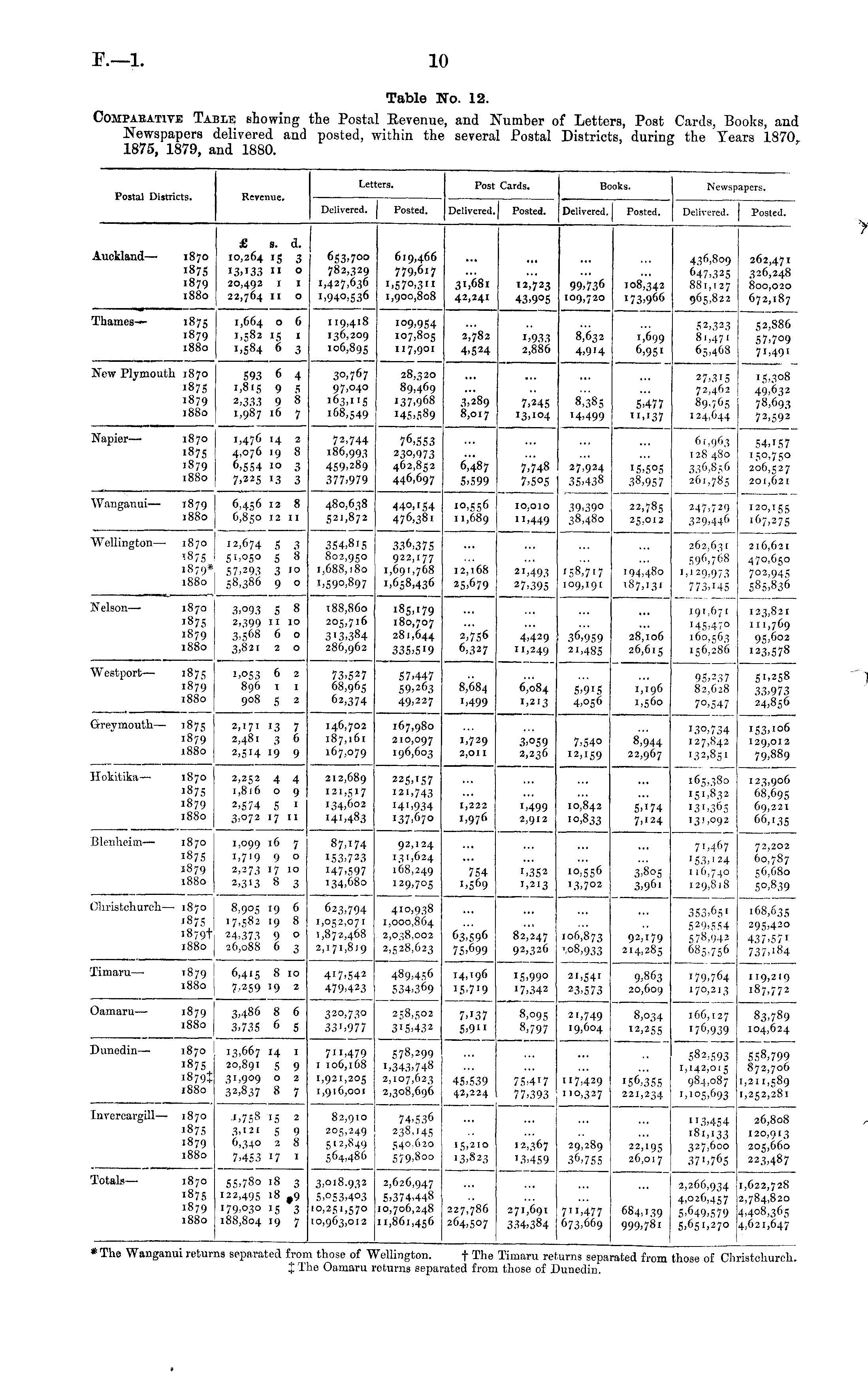 Table No. 12. Comparative Table showing the Postal Revenue, and Number of Letters, Post Cards, Books, and Newspapers delivered and posted, within the several Postal Districts, during the Years 1870, 1875, 1879, and 1880.