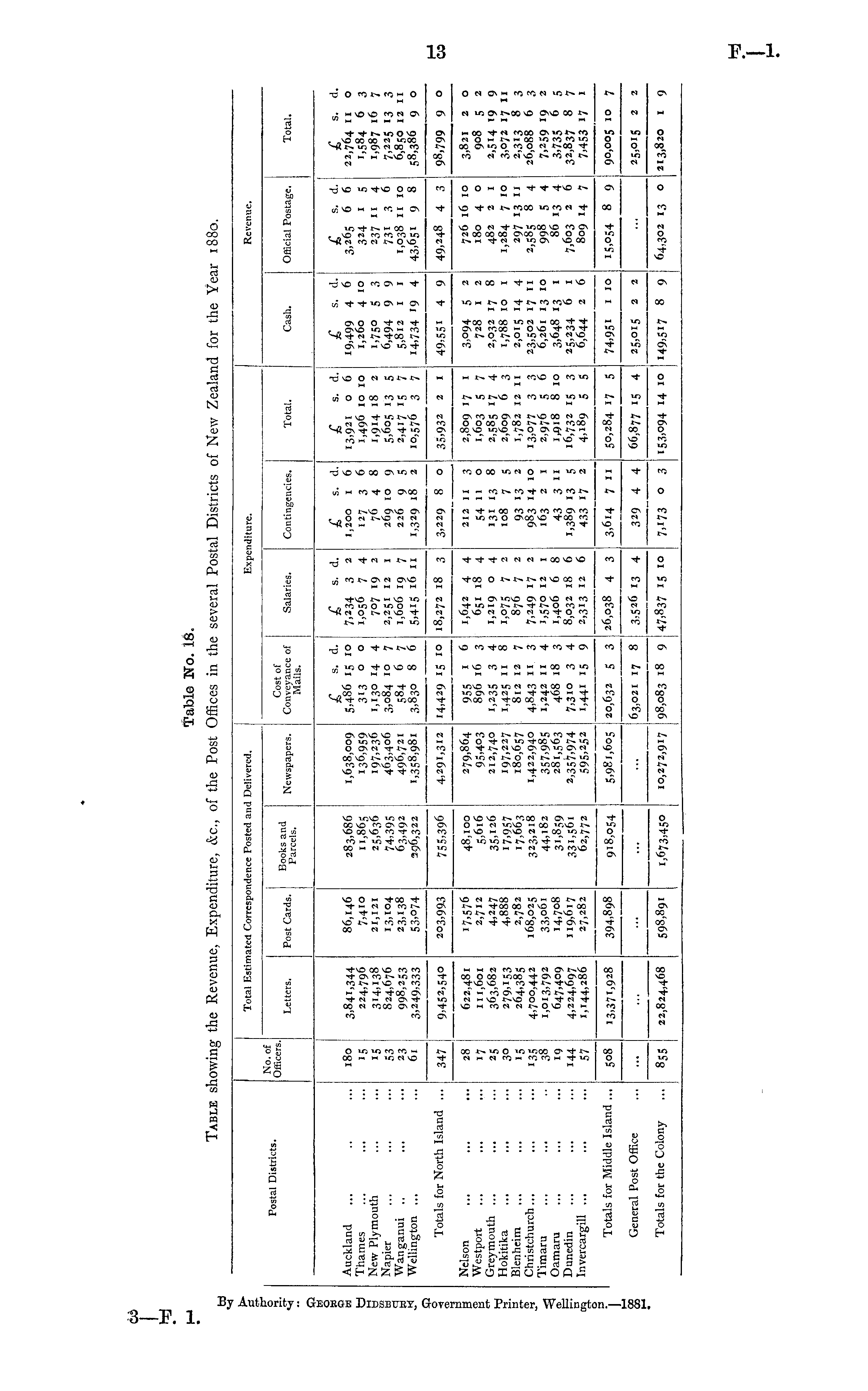 Table No. 18. Table showing the Revenue, Expenditure, &c., of the Post Offices in the several Postal Districts of New Zealand for the Year 1880.