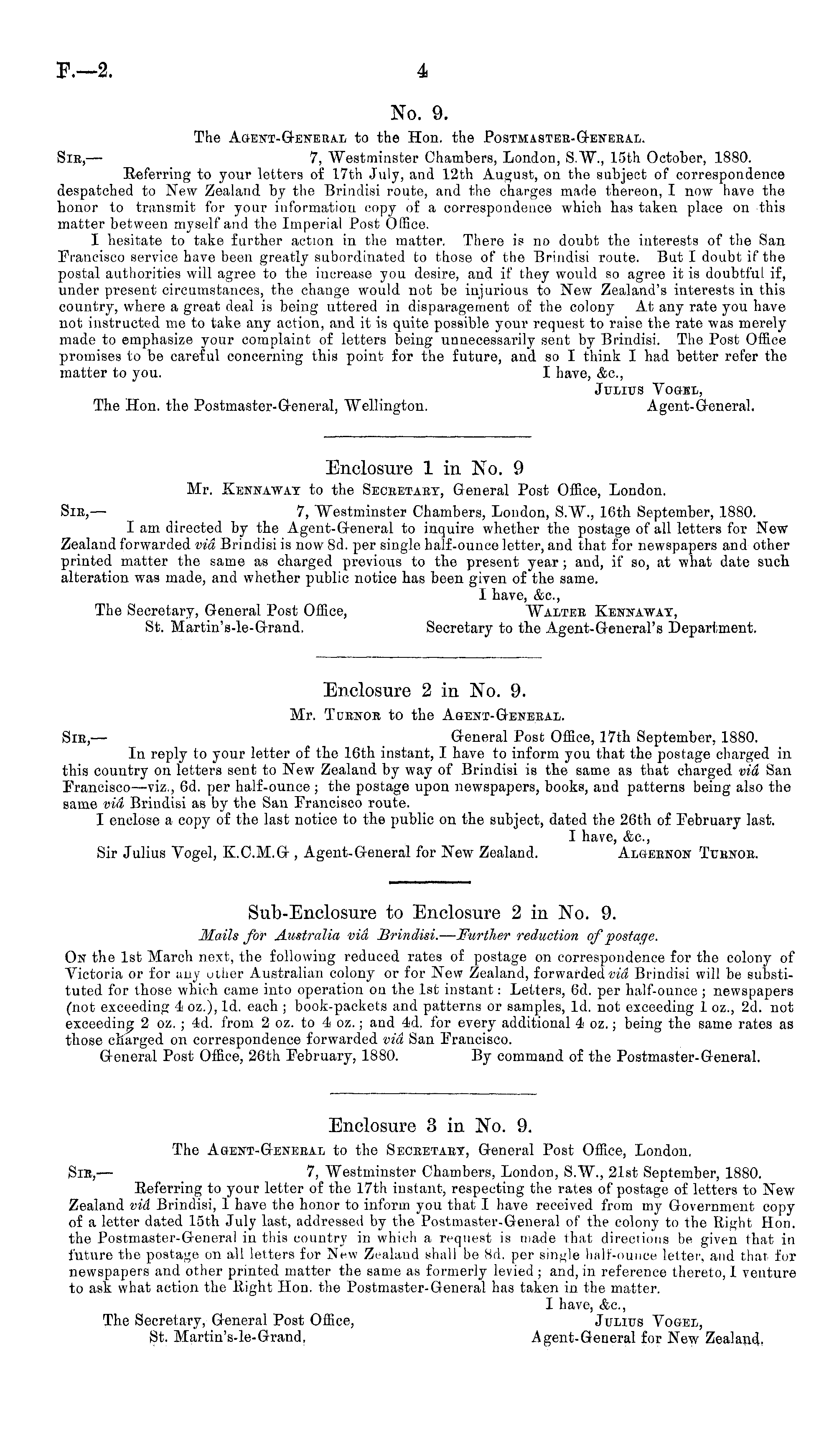 Enclosure 1 in No. 9 Mr. Kennaway to the Seceetaey, General Post Office, London. Sie, — 7, Westminster Chambers, London, S.W., 16th September, 1880. I am directed by the Agent-General to inquire whether the postage of all letters for New Zealand forwarded vid Brindisi is now Bd. per single half-ounce letter, and that for newspapers and other printed matter the same as charged previous to the present year; and, if so, at what date such alteration was made, and whether public notice has been given of the same. I have, &c, The Secretary, General Post Office, Waltee Kennaway, St. Martin's-le-Grand. Secretary to the Agent-General's Department.