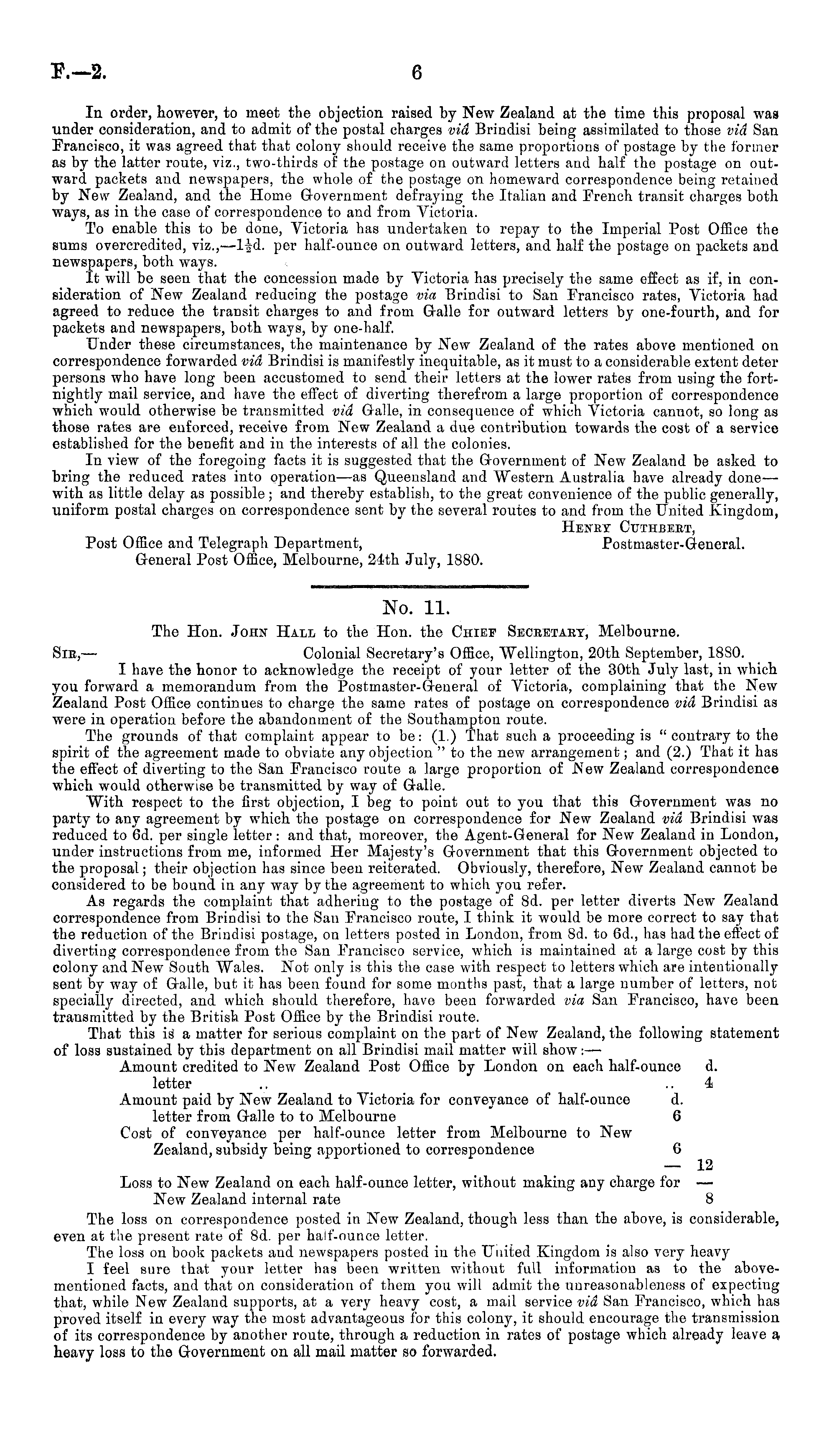 No. 11. The Hon. John Hall to the Hon. the Chief Seceetaey, Melbourne. Sie, — Colonial Secretary's Office, Wellington, 20th September, 1880. I have the honor to acknowledge the receipt of your letter of the 30th July last, in which you forward a memorandum from the Postmaster-General of Victoria, complaining that the New Zealand Post Office continues to charge the same rates of postage on correspondence vid Brindisi as were in operation before the abandonment of the Southampton route. The grounds of that complaint appear to be: (1.) That such a proceeding is " contrary to the spirit of the agreement made to obviate any objection "to the new arrangement; and (2.) That it has the effect of diverting to the San Erancisco route a large proportion of New Zealand correspondence which would otherwise be transmitted by way of Galle. With respect to the first objection, I beg to point out to you that this Government was no party to any agreement by which the postage on correspondence for New Zealand vid Brindisi was reduced to 6d. per single letter : and that, moreover, the Agent-General for New Zealand in London, under instructions from me, informed Her Majesty's Government that this Government objected to the proposal; their objection has since been reiterated. Obviously, therefore, New Zealand cannot be considered to be bound in any way by the agreement to which you refer. As regards the complaint that adhering to the postage of Bd. per letter diverts New Zealand correspondence from Brindisi to the San Francisco route, I think it would be more correct to say that the reduction of the Brindisi postage, on letters posted in London, from Bd. to 6d., has had the effect of diverting correspondence from the San Francisco service, which is maintained at a large cost by this colony and New South Wales. Not only is this the case with respect to letters which are intentionally sent by way of Galle, but it has been found for some months past, that a large number of letters, not specially directed, and which should therefore, have been forwarded via San Francisco, have been transmitted by the British Post Office by the Brindisi route. That this is a matter for serious complaint on the part of New Zealand, the following statement of loss sustained by this department on all Brindisi mail matter will show: — Amount credited to New Zealand Post Office by London on each half-ounce d. letter .. ..4 Amount paid by New Zealand to Victoria for conveyance of half-ounce d. letter from Galle to to Melbourne 6 Cost of conveyance per half-ounce letter from Melbourne to New Zealand, subsidy being apportioned to correspondence 6 — 12 Loss to New Zealand on each half-ounce letter, without making any charge for — New Zealand internal rate 8 The loss on correspondence posted in New Zealand, though less than the above, is considerable, even at the present rate of Bd. per half-ounce letter. The loss on book packets aud newspapers posted in the United Kingdom is also very heavy I feel sure that your letter has been written without full information as to the abovementioned facts, and that on consideration of them you will admit the unreasonableness of expecting that, while New Zealand supports, at a very heavy cost, a mail service vid San Francisco, which has proved itself in every way the most advantageous for this colony, it should encourage the transmission of its correspondence by another route, through a reduction in rates of postage which already leave a heavy loss to the Government on all mail matter so forwarded.