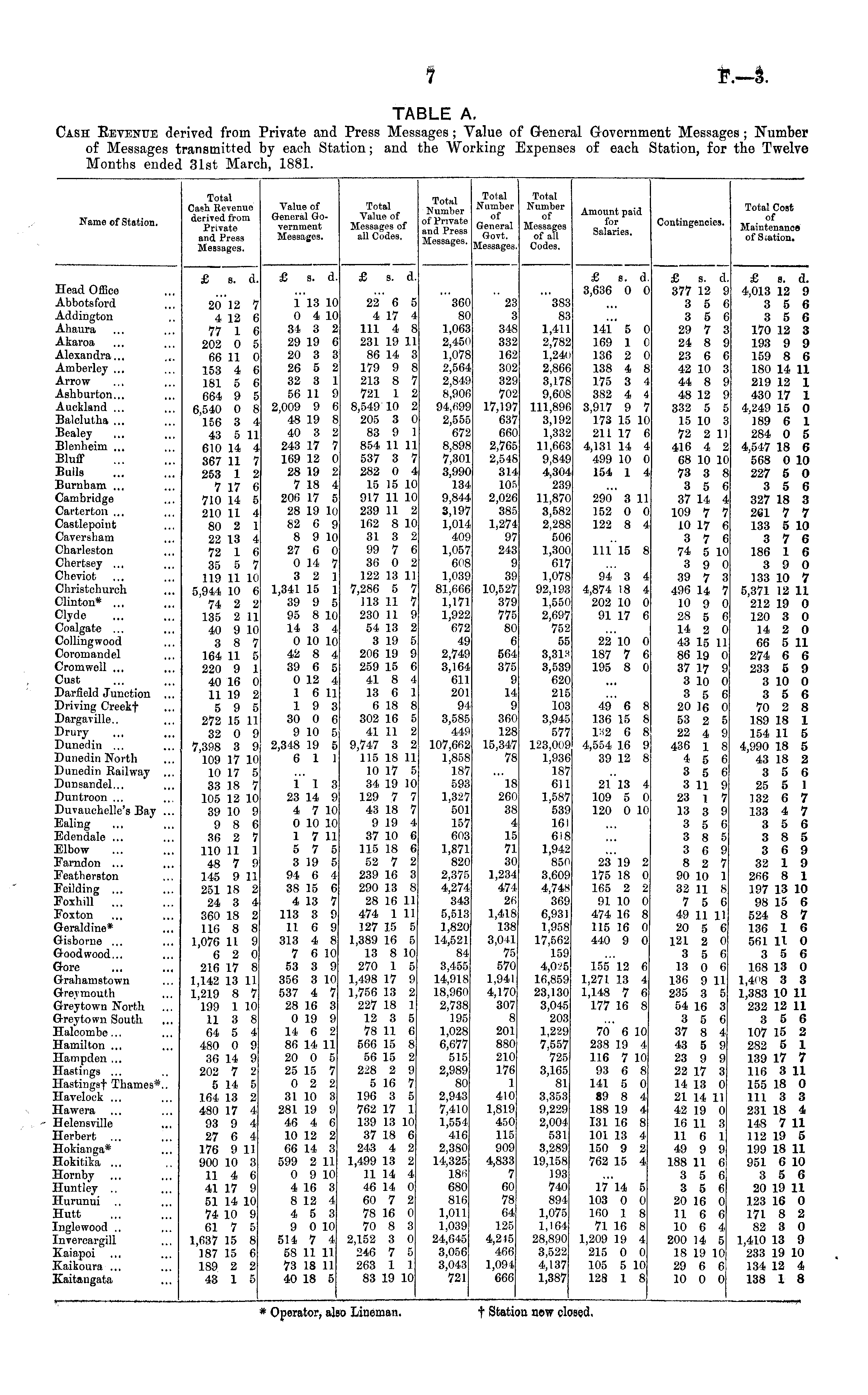 Name of Station. Total Cash Revenue derived from Private and Press Messages. Value of General Government Messages. Total Value of Messages of all Codes. Total Number of Private and Press Messages. Total Number of General Govt. Messages Total Number of Messages of all Codes. Amount paid for Salaries. Contingencies. Total Cost of Maintenance of S cation. Head Office Abbotsford Addington Ahaura Akaroa Alexandra... ,,. Amberley ... Arrow Ashburton... Auckland ... Balclutha ... Bealey Blenheim ... Bluff Bulls Burnham ... Cambridge Carterton ... Castlepoint Caversham Charleston Chertsey ... Cheviot Christchurch. ... Clinton* ... Clyde Coalgate ... Collingwood Coromandel Cromwell ... Cust Darfield Junction ... Driving Creekf Dargaville.. Drury Dunedin ... Dunedin North Dunedin Railway ... Dunsandel... Duntroon ... Duvauchelle's Bay ... Ealing Edendale ... Elbow Parndon ... Eeatherston Feilding ... Foxhill ... Foxton Geraldine* CHsborne ... G-oodwood... £ s. d. 20 12 7 4 12 6 77 1 6 202 0 5 66 11 0 153 4 6 181 5 6 664 9 5 6,540 0 8 156 3 4 43 5 11 610 14 4 367 11 7 253 1 2 7 17 6 710 14 5 210 11 4 80 2 1 22 13 4 72 1 6 35 5 7 119 11 10 5,944 10 6 74 2 2 135 2 11 40 9 10 3 8 7 164 11 5 220 9 1 40 16 0 11 19 2 5 9 5 272 15 11 32 0 9 7,398 3 9 109 17 10 10 17 5 33 18 7 105 12 10 39 10 9 9 8 6 36 2 7 110 11 1 48 7 9 145 9 11 251 18 2 24 3 4 360 18 2 116 8 8 1,076 11 9 6 2 0 216 17 8 1,142 13 11 1,219 8 7 199 1 10 11 3 8 64 5 4 480 0 9 36 14 9 202 7 2 5 14 5 164 13 2 480 17 4 93 9 4 27 6 4 176 9 11 900 10 3 11 4 6 41 17 9 51 14 10 74 10 9 61 7 5 1,637 15 8 187 15 6 189 2 2 43 1 5 £ a. d. 1 13 10 0 4 10 34 3 2 29 19 6 20 3 3 26 5 2 32 3 1 56 11 9 2,009 9 6 48 19 8 40 3 2 243 17 7 169 12 0 28 19 2 7 18 4 206 17 5 28 19 10 82 6 9 8 9 10 27 6 0 0 14 7 1,341 15 1 39 9 5 95 8 10 14 3 4 0 10 10 42 8 4 39 6 5 0 12 4 1 6 11 19 3 30 0 6 9 10 5 2,348 19 5 6 1 1 £ s. d. 22 6 5 4 17 4 111 4 8 231 19 11 86 14 3 179 9 8 213 8 7 721 1 2 8,549 10 2 205 3 0 83 9 1 854 11 11 537 3 7 282 0 4 15 15 10 917 11 10 239 11 2 162 8 10 31 3 2 99 7 6 36 0 2 122 13 II 7,286 5 7 J13 11 7 230 11 9 54 13 2 3 19 5 206 19 9 259 15 6 41 8 4 13 6 1 6 18 8 302 16 5 41 11 2 9,747 3 2 115 18 11 10 17 5 34 19 10 129 7 7 43 18 7 9 19 4 37 10 6 115 18 6 52 7 2 239 16 3 290 13 8 28 16 11 474 1 11 127 15 5 1,389 16 5 13 8 10 270 1 5 1.498 17 9 1,756 13 2 227 18 1 12 3 5 78 11 6 566 15 8 56 15 2 228 2 9 5 16 7 196 3 5 762 17 1 139 13 10 37 18 6 243 4 2 1.499 13 2 11 14 4 46 14 0 60 7 2 78 16 0 70 8 3 2,152 3 0 246 7 5 263 1 1 83 19 10 360 80 1,063 2,45n 1,078 2,564 2,849 8,906 94,(599 2,555 672 8,898 7,301 3,990 134 9,844 3,197 1,014 409 1,057 608 1,039 81,666 1,171 1,922 672 49 2,749 3,164 611 201 94 3,585 449 107,6fi2 1,858 187 593 1,327 501 157 603 1,871 820 2,375 4,274 343 5,513 1,820 14,521 84 3,455 14,918 18,960 2,738 195 1,028 6,677 515 2,989 80 2,943 7,410 1,554 416 2,380 14,325 18K 680 816 1,011 1,039 24,645 3,056 3,043 721 23 348 332 162 302 329 702 17,197 637 660 2,765 2,548 314 105 2,026 385 1,274 97 243 g 39 10,527 379 775 80 6 564 375 g 14 Q 360 128 15,347 78 18 260 38 15 71 30 1,234 474 26 1,418 138 3,041 75 570 1,941 4,170 307 8 201 880 210 176 1 410 1,819 450 115 909 4,833 7 60 78 64 125 4,2*5 466 1,091 666 383 83 1,411 2,782 1,240 2,866 3,178 9,608 111,896 3,192 1,332 11,663 9,849 4,304 239 11,870 3,582 2,288 506 1,300 617 1,078 92,193 1,550 2,697 752 55 3,31s 3,539 620 215 103 3,945 577 123,009 1,936 187 611 1,587 539 161 618 1,942 850 3,609 4,748 369 6,931 1,958 17,562 159 4,0-'5 16,859 23,130 3,045 203 1,229 7,557 725 3,165 81 3,353 9,229 2,004 531 3,289 19,158 193 740 894 1,075 1,164 28,890 3,522 4,137 1,387 £ b. d. 3,636 0 0 141 5 0 169 1 0 136 2 0 138 4 8 175 3 4 382 4 4 3,917 9 7 173 15 10 211 17 6 4,131 14 4 499 10 0 154 1 4 290 3 11 152 0 0 122 8 4 111 15 8 94 3 4 4,874 18 4 202 10 0 91 17 6 22 10 0 187 7 6 195 8 0 49 6 8 136 15 8 182 6 8 4,554 16 9 39 12 8 £ s. d. 377 12 9 3 5 6 3 5 6 29 7 3 24 8 9 23 6 6 42 10 3 44 8 9 48 12 9 332 5 5 15 10 3 72 2 11 416 4 2 68 10 10 73 3 8 3 5 6 37 14 4 109 7 7 10 17 6 3 7 6 74 5 10 3 9 0 39 7 3 496 14 7 10 9 0 28 5 6 14 2 0 43 15 11 86 19 0 37 17 9 3 10 0 3 5 6 20 16 0 53 2 5 22 4 9 436 1 8 4 5 6 3 5 6 3 11 9 23 l 7 13 3 9 3 5 6 3 8 5 3 6 9 8 2 7 90 10 1 32 11 8 7 5 6 49 11 11 20 5 6 121 2 0 3 5 6 13 0 6 136 9 11 235 3 5 54 16 3 3 5 6 37 8 4 43 5 9 23 9 9 22 17 3 14 13 0 21 14 11 42 19 0 16 11 3 11 6 1 49 9 9 188 11 6 3 5 6 3 5 6 20 16 0 11 6 6 10 6 4 200 14 5 18 19 10 29 6 6 10 0 0 £ s. d. 4,013 12 9 3 5 6 3 5 6 170 12 3 193 9 9 159 8 6 180 14 11 219 12 1 430 17 1 4,249 15 0 189 6 1 284 0 5 4,547 18 6 568 0 10 227 5 0 3 5 6 327 18 3 261 7 7 133 5 10 3 7 6 186 1 6 3 9 0 133 10 7 5,371 12 11 212 19 0 120 3 0 14 2 0 66 5 11 274 6 6 233 5 9 3 10 0 3 5 6 70 2 8 189 18 1 154 11 5 4,990 18 5 43 18 2 3 5 6 25 5 1 132 6 7 133 4 7 3 5 6 3 8 5 3 6 9 32 1 9 2fi6 8 1 197 13 10 98 15 6 524 8 7 136 1 6 561 11 0 3 5 6 168 13 0 1,4('8 3 3 1,383 10 11 232 12 11 3 5 6 107 15 2 282 5 1 139 17 7 116 3 11 155 18 0 111 3 3 231 18 4 148 7 11 112 19 5 199 18 11 951 6 10 3 5 6 20 19 11 123 16 0 171 8 2 82 3 0 1,410 13 9 233 19 10 134 12 4. 138 1 8 113 23 14 9 4 7 10 0 10 10 1 7 11 5 7 5 3 19 5 94 6 4 38 15 6 4 13 7 113 3 9 11 6 9 313 4 8 7 6 10 53 3 9 356 3 10 537 4 7 28 16 3 0 19 9 14 6 2 86 14 11 20 0 5 25 15 7 0 2 2 31 10 3 281 19 9 46 4 6 10 12 2 66 14 3 599 2 11 0 9 10 4 16 3 8 12 4 4 5 3 9 0 10 514 7 4 58 11 11 73 18 11 40 18 5 21 13 4 109 5 0 120 0 10 23 19 2 175 18 0 165 2 2 91 10 0 474 16 8 115 16 0 440 9 0 Gore Grahamstown Grevmouth Grey town North Greytown South Halcombe... Hamilton ... Hampden ... Hastings ... Hastings! Thames*.. Havelock ,.. 155 12 6 1,271 13 4 1,148 7 6 177 16 8 70 6 10 238 19 4 116 7 10 93 6 8 141 5 0 89 8 4 188 19 4 131 16 8 101 13 4 150 9 2 762 15 4 Hawera Helensville Herbert ... Hokianga* Hokitika ... Hornby Huntley .. Hurunui Hutt Inglewood .. Invercargill Kaiapoi Kaikoura ... Kaitangata 17 14 5 103 0 0 lfiO 1 8 71 16 8 1,209 19 4 215 0 0 105 5 10 128 1 8 * Operato