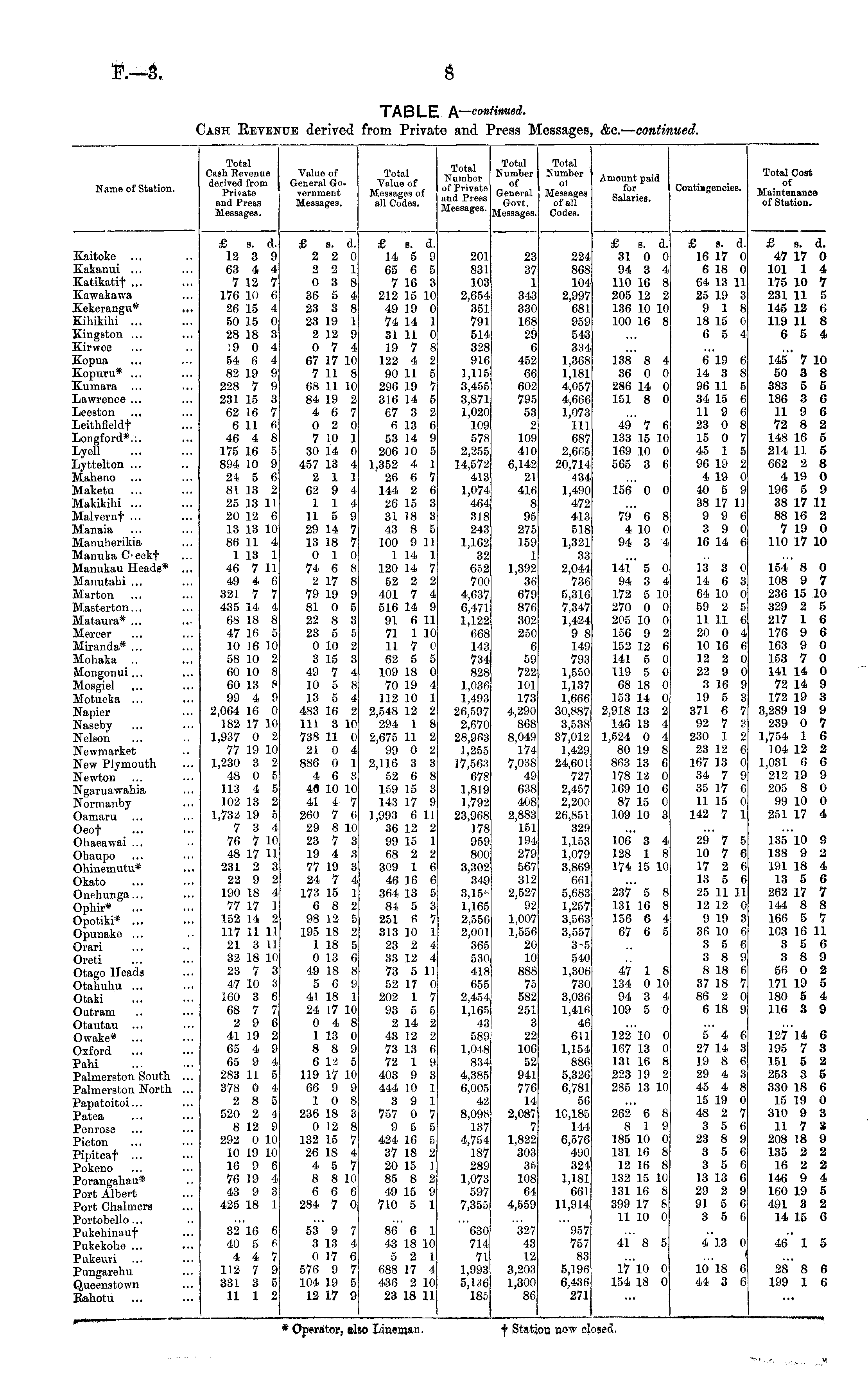 Name of Station. Total Cash Revenue derived from Private and Press Messages. Value of General Government Messages. Total Value of Messages of all Codes. Total Number of Private and Press Messages. Total Number of General Govt, Messages. Total IS umber of Messages of all Codes. Amount paid for Salaries. Contingencies. Total Cost of Maintenance of Station. Kaitoke Kakanui ... Katikatif ... Kawakawa Kekerangu* ... Kihikihi ... KingBton ... Kirwee Kopua Kopuru* ... Kumara ... £ s. d. 12 3 9 63 4 4 7 12 7 176 10 6 26 15 4 50 15 0 28 18 3 19 0 4 54 6 4 82 19 9 228 7 9 231 15 3 62 16 7 6 11 (i 46 4 8 175 16 5 894 10 9 21 5 6 81 13 2 25 13 11 20 12 6 13 13 10 86 11 4 1 13 1 46 7 11 49 4 6 321 7 7 435 14 4 68 18 8 47 16 5 10 !6 10 58 10 2 60 10 8 60 13 P 99 4 9 2,064 16 0 182 17 10 1,937 0 2 77 19 10 1,230 3 2 48 0 5 113 4 5 102 13 2 1,782 19 5 7 3 4 76 7 10 48 17 11 231 2 3 22 9 2 190 18 4 77 17 1 152 14 2 117 11 11 21 3 11 32 18 10 23 7 3 47 10 is 160 3 6 68 7 7 2 9 6 41 19 2 65 4 9 65 9 4 283 11 5 378 0 4 2 8 5 520 2 A 8 12 9 292 0 10 10 19 10 16 9 6 76 19 4 43 9 3 425 18 1 £ b. d. 2 2 0 2 2 1 0 3 8 36 5 4 23 3 8 23 19 1 2 12 9 0 7 4 67 17 10 7 11 8 68 11 10 84 19 2 4 6 7 0 2 0 7 10 1 30 14 0 457 13 4 2 1 1 62 9 4 114 11 5 9 29 14 7 13 18 7 0 10 74 6 8 2 17 8 79 19 9 81 0 5 22 8 3 23 5 5 0 10 2 3 15 3 49 7 4 10 5 8 13 5 4 483 16 2 111 3 10 738 11 0 21 0 4 880 0 1 4 6 3 46 10 10 41 4 7 260 7 6 29 8 10 23 7 3 19 4 3 77 19 3 24 7 4 173 15 1 6 8 2 98 12 5 195 18 2 1 18 5 0 13 6 49 18 8 5 6 9 41 18 1 24 17 10 0 4 8 1 13 0 8 8 9 6 12 5 119 17 10 66 9 9 10 8 236 18 3 0 12 8 132 15 7 26 18 4 4 5 7 8 8 10 6 6 6 284 7 0 £ B . a. 14 5 9 65 6 5 7 16 3 212 15 10 49 19 0 74 14 1 31 11 0 19 7 8 122 4 2 90 11 5 296 19 7 3)6 14 5 67 3 2 6 13 6 53 14 9 206 10 5 1,352 4 1 26 6 7 144 2 6 26 15 3 31 18 3 43 8 5 100 9 11 1 14 1 120 14 7 52 2 2 401 7 4 516 14 9 91 6 11 71 1 10 11 7 o 62 5 5 109 18 0 70 19 4 112 10 1 2,548 12 2 294 1 8 2,675 11 2 99 0 2 2,116 3 3 52 6 8 159 15 3 143 17 9 1,993 6 11 36 12 2 99 15 1 68 2 2 309 1 6 46 16 6 364 13 5 84 5 3 251 6 7 313 10 1 23 2 4 33 12 4 73 5 11 52 17 0 202 1 7 93 5 5 2 14 2 43 12 2 73 13 6 72 1 9 403 9 3 444 10 1 3 9 1 757 0 7 9 5 5 424 16 5 37 18 2 20 15 1 85 8 2 49 15 9 710 5 1 201 831 103 2,654 351 791 514 328 916 1,115 3,455 3,871 1,020 109 578 2,255 14,572 413 1,074 464 318 243 1,162 32 652 700 4,637 6,471 1,122 668 143 734 828 l,03fi 1,493 26,597 2,670 28,963 1,255 17,563 678 1,819 1,792 23,968 178 959 800 3,302 349 3,15* 1,165 2,556 2,001 365 530 418 655 2,454 1,165 43 589 1,018 834 4,385 6,005 42 8,098 137 4,754 187 289 1,073 597 7,355 23 37 1 343 330 168 29 6 452 66 602 795 53 2 109 410 6,142 21 416 8 95 275 159 1 1,392 36 679 876 302 250 6 59 722 101 173 4,290 868 8,049 174 7,038 49 638 408 2,883 151 194 279 567 312 2,527 92 1,007 1,556 20 10 888 75 582 251 3 22 106 52 941 776 14 2,087 1,822 303 35 108 64 4,559 224 868 104 2,997 681 959 543 334 1,368 1,181 4,057 4,666 1,073 111 687 2,665 20,714 434 1,490 472 413 518 1,321 33 2,044 736 5,316 7,347 1,424 9 8 149 793 1,550 1,137 1,666 30,887 3,538 37,012 1,429 24,60! 727 2,457 2,20(1 26,851 329 1,153 1,079 3,869 661 5,683 1,257 3,563 3,557 3-5 540 1,306 730 3,036 1,416 46 611 1,154 886 5,326 6,781 56 1C,185 144 6,576 490 324 1,181 661 11,914 £ s. d. 31 0 0 94 3 4 110 16 8 205 12 2 136 10 10 100 16 8 £ s. d. 16 17 0 6 18 0 64 13 11 25 19 3 9 18 18 15 0 6 5 4 £ s. d. 47 17 0 101 1 4 175 10 1 231 11 5 145 12 6 119 11 8 6 5 4 Lawrence ... Leeston Leithfieldt Longford*.., Lyell Lyttelton ... Maheno Maketu Makikihi ... Malvernf ... Manaia Manuherikia Manuka Ceekf Manukau Heads* ... Manutahi ... Marton Masterton... Mataura* ... 138 8 4 36 0 0 286 14 0 151 8 0 49 7 6 133 15 10 169 10 0 565 3 6 6 19 6 14 3 8 96 11 5 34 15 6 11 9 6 23 0 8 15 0 7 45 1 5 96 19 2 4 19 0 40 5 9 38 17 11 9 9 6 3 9 0 16 14 6 145 7 10 50 3 8 383 5 5 186 3 6 11 9 6 72 8 2 148 16 5 214 11 5 662 2 8 4 19 0 196 5 9 38 17 11 88 16 2 7 19 0 110 17 10 156 0 0 79 6 8 4 10 0 94 3 4 Mercer Miranda* ... Mohaka Mongonui... Mosgiel Motueka ... Napier Naseby Nelson Newmarket New Plymouth Newton Ngaruawahia Normanby 141 5 0 94 3 4 172 5 10 270 0 0 205 10 0 156 9 2 152 12 6 141 5 0 119 5 0 68 18 0 153 14 0 2,918 13 2 146 13 4 1,524 0 4 80 19 8 8R3 13 6 178 12 0 169 10 6 87 15 0 109 10 3 13 3 0 14 6 3 64 10 0 59 2 5 11 11 6 20 0 4 10 16 6 12 2 0 22 9 0 3 16 9 19 5 3 371 6 7 92 7 8 230 1 2 23 12 6 167 13 0 34 7 9 35 17 6 11 15 0 142 7 1 154 8 0 108 9 7 236 15 10 329 2 5 217 1 6 176 9 6 163 9 0 153 7 0 141 14 0 72 14 9 172 19 3 3,289 19 9 239 0 1 1,754 1 6 104 12 2 1,031 6 6 212 19 9 205 8 0 99 10 0 251 17 4 Oamaru Oeof Ohaeawai ... Ohaupo Ohinemutu* Okato Onehunga... Ophir* ... Opotiki* ... Opunake ... Orari Oreti Otago Head3 Otahuhu ... Otaki Outrarn Otautau ... Owake* Oxford Pahi Palmerston South ... Palmerston North ... Papatoitoi... Patea 106 3 4 128 1 8 17* 15 10 237 5 8 131 16 8 156 6 4 67 6 5 47 1 8 134 0 10 94 3 4 109 5 0 29 7 5 10 7 6 17 2 6 13 5 6 25 11 11 12 12 0 9 19 3 36 10 6 3 5 6 3 8 9 8 18 6 37 18 7 86 2 0 6 18 9 135 10 9 138 9 2 191 18 4 13 5 6 262 17 7 144 8 8 166 5 7 103 16 11 3 5 6 3 8 9 S6 0 2 171 19 5 180 5 4 116 3 9 122 10 0 167 13 0 131 16 8 223 19 2 285 13 10 5 4 6 27 14 3 19 8 6 29 4 3 45 4 8 15 19 0 48 2 7 3 5 6 23 8 9 3 5 6 3 5 6 13 13 6 29 2 9 91 5 6 3 5 6 127 14 6 195 7 3 151 5 2 253 3 5 330 18 6 15 19 0 310 9 3 11 7 S 208 18 9 135 2 2 16 2 2 146 9 4 160 19 5 491 3 2 14 15 6 Penrose Pioton Pipiteaf ... Pokeno Porangahau* Port Albert Port Chalmers Portobello... Pukehinau"|* Pukekohe ... Pukeuri Pungarehu Queenstown Kahotu 262 6 8 8 19 185 10 0 131 16 8 12 16 8 132 15 10 131 16 8 399 17 8 11 10 0 32 16 6 40 5 P 4 4 7 112 7 9 331 3 5 11 1 2 53 9 7 3 13 4 0 17 6 576 9 7 104 19 5 12 IT 9 86 6 1 43 18 10 5 2 1 688 17 4 436 2 10 23 18 11 630 714 71 1,993 5,136 185 327 43 12 3,203 1,300 86 957 757 83 5,196 6,436 271 41 8 5 17 10 0 154 IS 0 4 13 0 10 18 6 44 3 6 46* 1 5 2s" 8 6 199 1 6 * Operator, also Lineman. f Station bow closed.