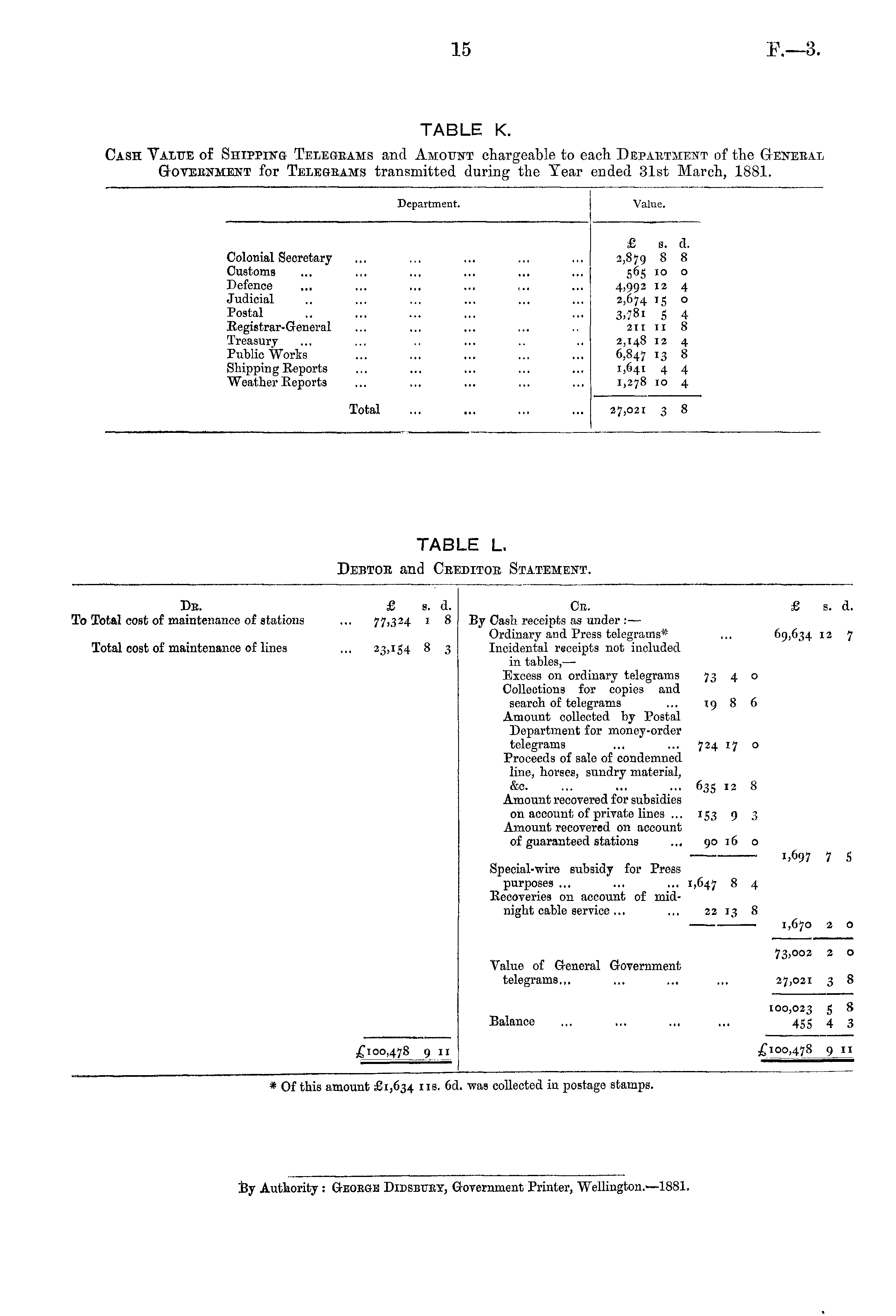 De. ?o Total cost of maintenance of stations £ s. d. 77.324 1 8 On. £ s. d. Total cost of maintenance of lines 23> J54 8 3 By Cash receipts as under :— Ordinary and Press telegrams* ... 69,634 12 7 Incidental receipts not included in tables, — Excess on ordinary telegrams 73 4 o Collections for copies and search of telegrams ... 19 8 6 Amount collected by Postal Department for money-order telegrams ... ... 724 17 o Proceeds of sale of condemned line, horses, sundry material, &c. ... ... ... 635 12 8 Amount recovered for subsidies on account of private lines ... 153 93 Amount recovered on account of guaranteed stations ... 90 16 o 1,697 7 S Special-wire subsidy for Press purposes ... ... ... 1,647 8 4 Recoveries on account of midnight cable service ... ... 22 13 8 1)670 2 o 73,002 2 o Value of G-eneral Government telegrams.,. ... ... ... 27,021 3 8 100,023 5 8 Balance ... ... ... ... 455 4 3 £100,478 9 11 £100,478 9 11 * Of this amount £1,634 us. 6d. was collected in postage stamps.