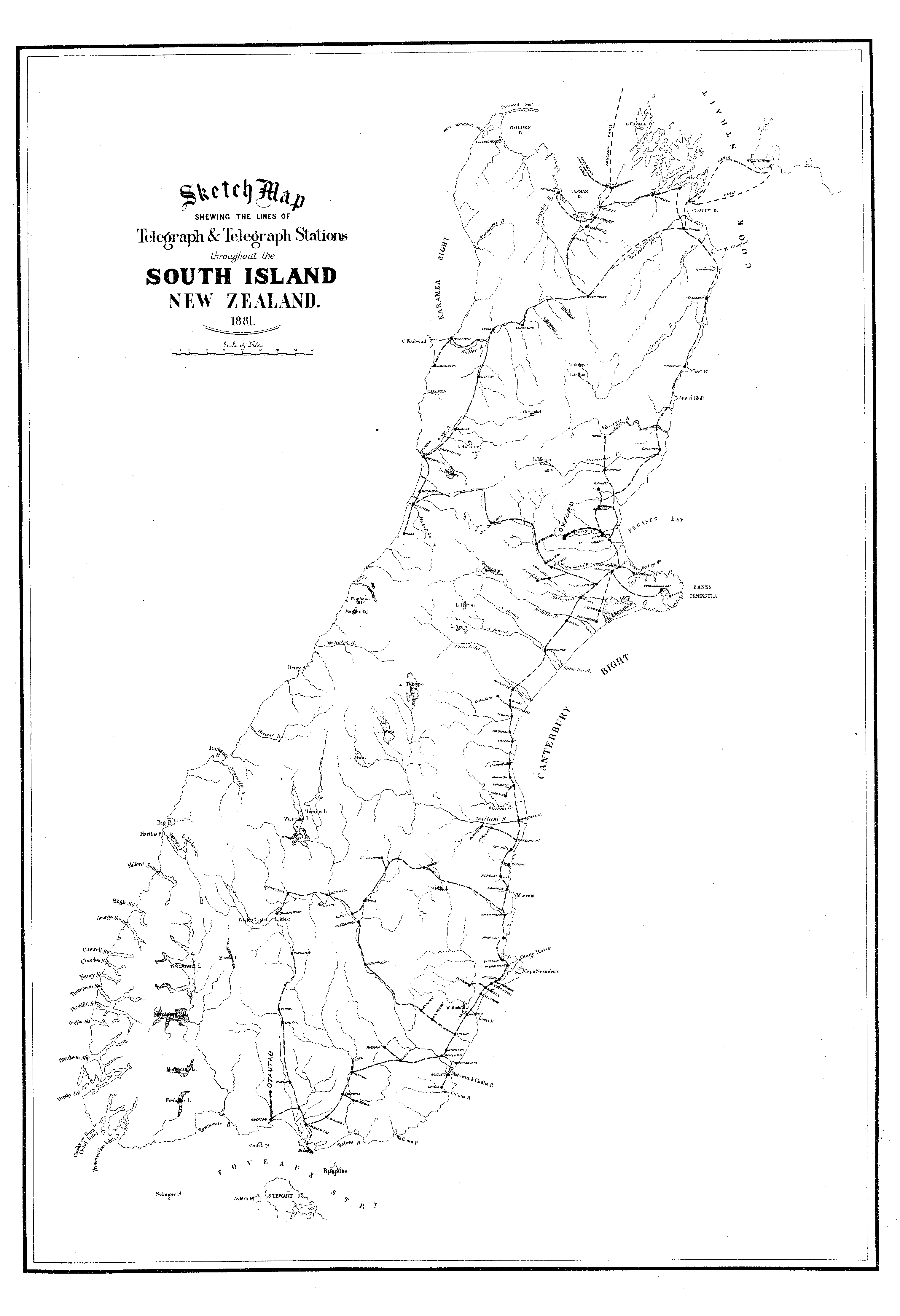 SHEWING THE LINES OF Telegraph & Telegraph Stations throughout the SOUTH ISLAND NEW ZEALAND. 1881.