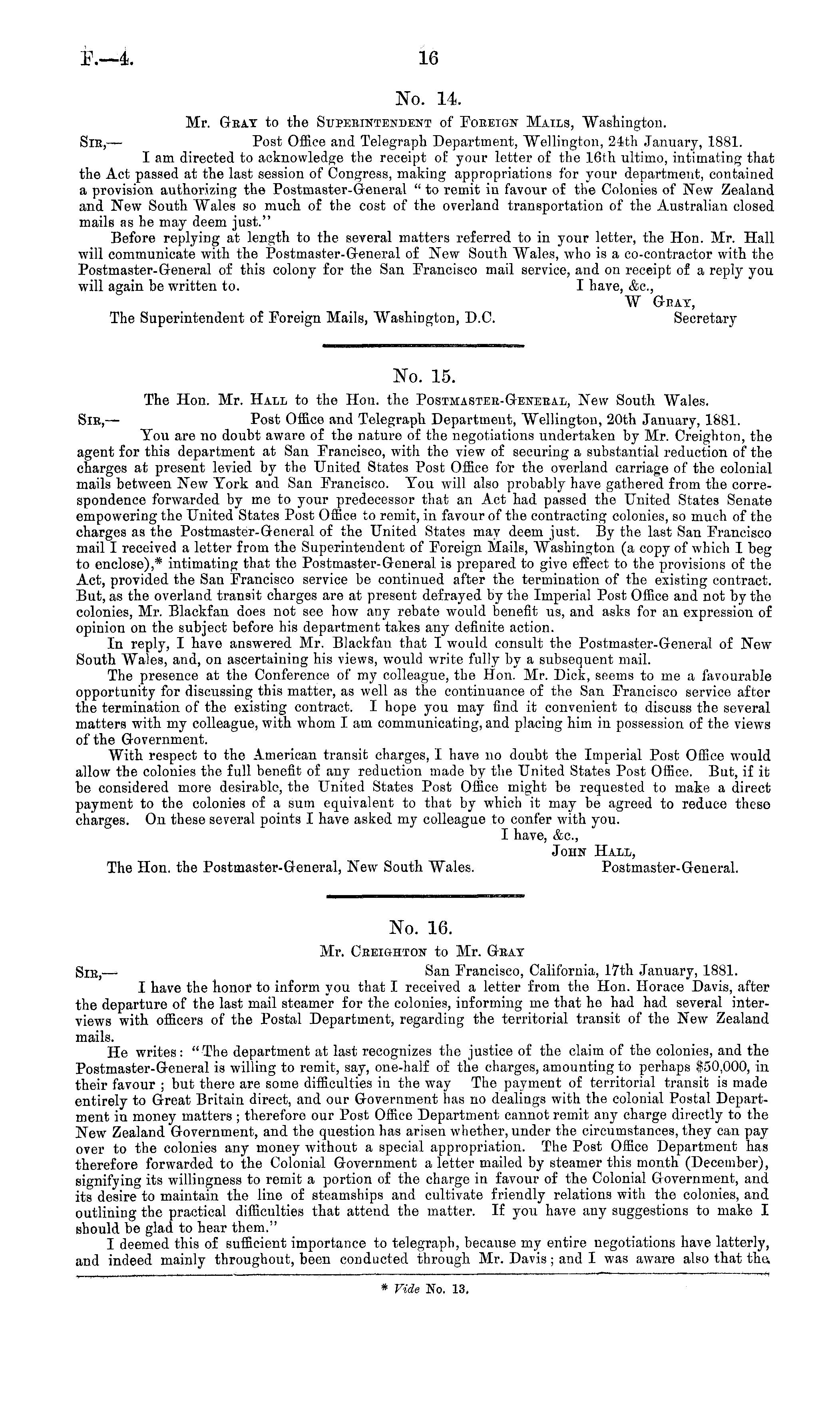 No. 16. Mr. Creighton to Mr. Geay Sib, — San Francisco, California, 17th January, 1881. I have the honor to inform you that I received a letter from the Hon. Horace Davis, after the departure of the last mail steamer for the colonies, informing me that he had had several interviews with officers of the Postal Department, regarding the territorial transit of the New Zealand mails. He writes: "The department at last recognizes the justice of the claim of the colonies, and the Postmaster-General is willing to remit, say, one-half of the charges, amounting to perhaps $50,000, in their favour ; but there are some difficulties in the way The payment of territorial transit is made entirely to Great Britain direct, and our Government has no dealings with the colonial Postal Department in money matters ; therefore our Post Office Department cannot remit any charge directly to the New Zealand Government, and the question has arisen whether, under the circumstances, they can pay over to the colonies any money without a special appropriation. The Post Office Department has therefore forwarded to the Colonial Government a letter mailed by steamer this month (December), signifying its willingness to remit a portion of the charge in favour of the Colonial Government, and its desire to maintain the line of steamships and cultivate friendly relations with the colonies, and outlining the practical difficulties that attend the matter. If you have any suggestions to make I should be glad to hear them." I deemed this of sufficient importance to telegraph, because my entire negotiations have latterly, and indeed mainly throughout, been conducted through Mr. Davis ; and I was aware also that tha