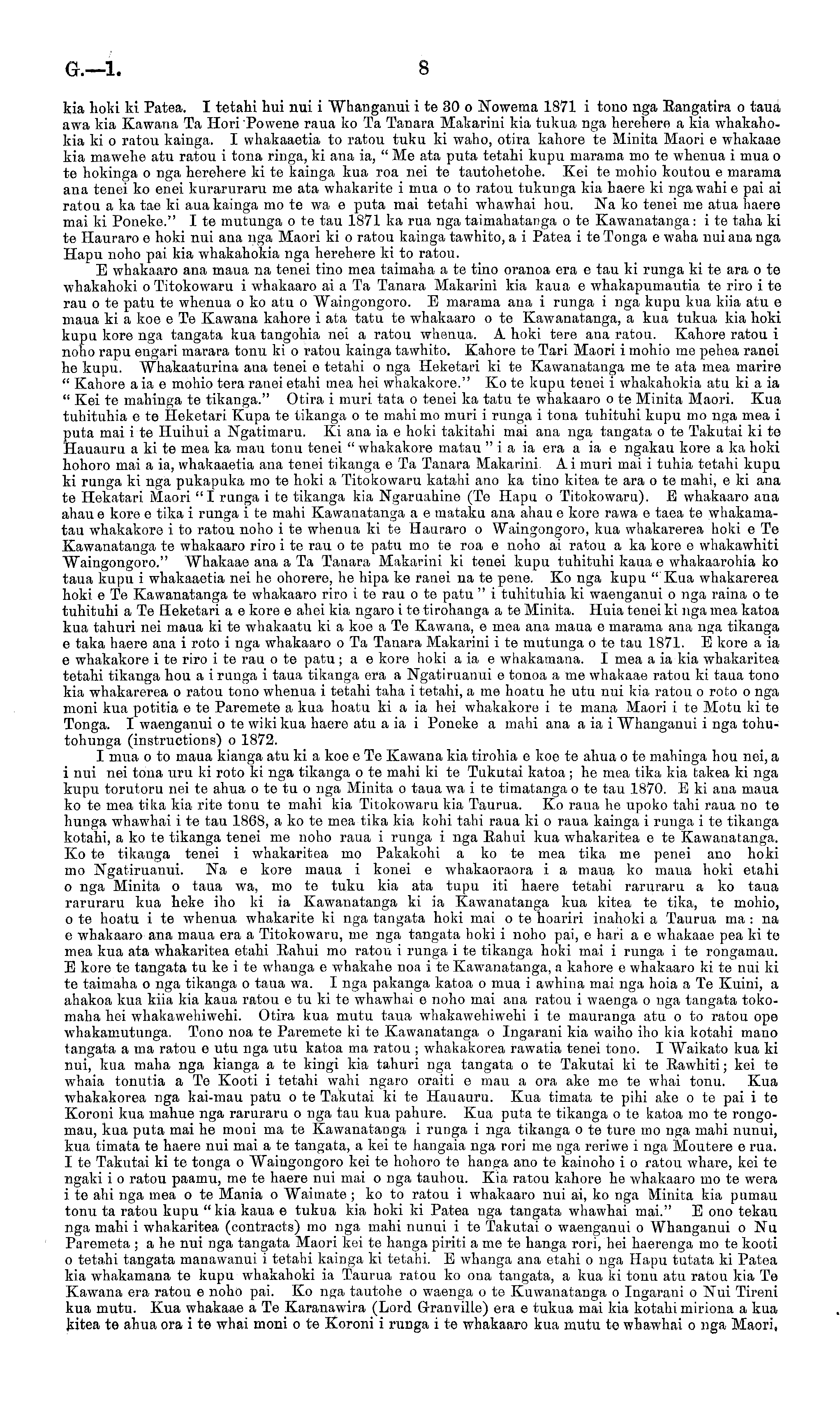 kia hoki ki Patea. I tetahi hui nui i Whanganui ite3o o Nowema 1871 i tono nga Eangatira o taua aw ra kia Kawana Ta Hori Powene raua ko Ta Tanara Makarini kia tukua nga herehere a kia whakahokia ki o ratou kainga. I whakaaetia to ratou tuku ki waho, otira kahore te Minita Maori e whakaae kia mawehe atu ratou i tona ringa, ki ana ia, " Me ata puta tetahi kupu marama mo te whenua i mua o te hokinga o nga herehere ki te kainga kua roa nei te tautohetohe. Kei te mohio koutou e marama ana tenei ko enei kuraruraru me ata whakarite i mua o to ratou tukunga kia haere ki nga wahi e pai ai ratou aka tae ki aua kainga mo te wa e puta mai tetahi whawhai hou. Na ko tenei me atua haere mai ki Poneke." Ite mutunga ote tau 1871 ka rua nga taimahatanga ote Kawanatanga: ite taha ki te Hauraro e hoki nui ana nga Maori ki o ratou kainga tawhito, a i Patea i te Tonga e waha nui ana nga Hapu noho pai kia whakahokia nga herehere ki to ratou. E whakaaro ana maua na tenei tino mea taimaha a te tino oranoa era e tau ki runga ki te ara o te whakahoki o Titokowaru i whakaaro ai a Ta Tanara Makarini kia kaua e whakapumautia te riro i te rau ote patu te whenua oko atu o Waingongoro. E marama ana i runga i nga kupu kua kiia atu e maua ki a koe e Te Kawana kahore i ata tatu te w rhakaaro o te Kawanatanga, a kua tukua kia hoki kupu kore nga tangata kua tangohia nei a ratou whenua. A hoki tere ana ratou. Kahore ratou i noho rapu engari marara tonu ki o ratou kainga tawhito. Kahore te Tari Maori i mohio me pehea ranei he kupu. Whakaaturina ana tenei e tetahi o nga Heketari ki te Kawanatanga me te ata mea marire " Kahore aia e mohio tera ranei etahi mea hei whakakore." Ko te kupu tenei i whakahokia atu ki aia " Kei te mahinga te tikanga." Otira i muri tata o tenei ka tatu te whakaaro ote Minita Maori. Kua tuhituhia e te Heketari Kupa te tikanga o te mahi mo muri i runga i tona tuhituhi kupu mo nga mea i puta mai ite Huihui a Ngatimaru. Ki ana ia e hoki takitahi mai ana nga tangata ote Takutai ki te Hauauru a ki te mea ka mau tonu tenei " whakakore matau "ia ia era a ia e ngakau kore a ka hoki hohoro mai a ia, whakaaetia ana tenei tikanga eTa Tanara Makarini. Ai muri mai i tuhia tetahi kupu ki runga ki nga pukapuka mo te hoki a Titokowaru katahi ano ka tino kitea te ara o te mahi, e ki ana te Hekatari Maori "I runga ite tikanga kia Ngaruahine (Te Hapu o Titokowaru). E whakaaro ana ahau e kore e tika i runga i te mahi Kawanatanga a e mataku ana ahau e kore rawa e taea te whakamatau whakakore i to ratou noho i te whenua ki te Hauraro o Waingongoro, kua whakarerea hoki e Te Kawanatanga te whakaaro riro i te rau o te patu mo te roa e noho ai ratou a ka kore e whakawhiti Waingongoro." Whakaae ana aTa Tanara Makarini ki tenei kupu tuhituhi kaua e whakaarohia ko taua kupu i whakaaetia nei he ohorere, he hipa ke ranei na te pene. Ko nga kupu "Kua whakarerea hoki e Te Kawanatanga te whakaaro riro i te rau o te patu " i tuhituhia ki waenganui o nga raina o te tuhituhi aTe Heketari a e kore e ahei kia ngaro ite tirohanga ate Minita. Huia tenei ki nga mea katoa kua tahuri nei maua ki te whakaatu ki a koe a Te Kawana, e mea ana maua e marama ana nga tikanga e taka haere ana i roto i nga whakaaro oTa Tanara Makarini ite mutunga ote tau 1871. E kore aia e whakakore ite riro ite rau ote patu ; a e kore hoki aia e whakamana. I mea aia kia whakaritea tetahi tikanga hou a i runga i taua tikanga era a Ngatiruanui e tonoa a me whakaae ratou ki taua tono kia whakarerea o ratou tono whenua i tetahi taha i tetahi, a me hoatu he utu nui kia ratou o roto o nga moni kua potitia e te Paremete a kua hoatu ki a ia hei whakakore i te mana Maori i te Motu ki te Tonga. I waenganui ote wild kua haere atu aia i Poneke a mahi ana aia i Whanganui i nga tohutohunga (instructions) o 1872. I mua o to maua kianga atu ki a koe e Te Kawana kia tirohia e koe te ahua o te mahinga hou nei, a i nui nei tona uru ki roto ki nga tikanga o te mahi ki te Tukutai katoa ; he mea tika kia takea ki nga kupu torutoru nei te ahua otetu o nga Minita o taua w ra ite timatanga ote tau 1870. Eki ana maua ko te mea tika kia rite tonu te mahi kia Titokowaru kia Taurua. Ko raua he upoko tahi raua no te hunga whawhai i te tau 1868, a ko te mea tika kia kohi tahi raua ki o raua kainga i runga i te tikanga kotahi, a ko te tikanga tenei me noho raua i runga i nga Eahui kua whakaritea e te Kawanatanga. Ko te tikanga tenei i whakaritea mo Pakakohi a ko te mea tika me penei ano hoki mo Ngatiruanui. Na e kore maua i konei e whakaoraora i a maua ko maua hoki etahi o nga Minita o taua w ra, mo te tuku kia ata tupu iti haere tetahi raruraru a ko taua raruraru kua heke iho ki ia Kawanatanga ki ia Kawanatanga kua kitea te tika, te mohio, 0 te hoatu i te whenua whakarite ki nga tangata hoki mai o te hoariri inahoki a Taurua ma : na e whakaaro ana maua era a Titokowaru, me nga tangata hoki i noho pai, e hari a e whakaae pea ki te mea kua ata wEakaritea etahi Eahui mo ratou i runga i te tikanga hoki mai i runga i te rongamau. E kore te tangata tu ke i te whanga e whakahe noa i te Kaw 7anatanga, a kahore e whakaaro ki te nui ki te taimaha o nga tikanga o taua wa. I nga pakanga katoa o mua i awhina mai nga hoia aTe Kuini, a ahakoa kua kiia kia kaua ratou e tu ki te whawhai e noho mai ana ratou i waenga o nga tangata tokomaha hei whakawehiwehi. Otira kua mutu taua whakawehiwehi i te mauranga atu o to ratou ope whakamutunga. Tono noa te Paremete ki te Kawanatanga o Ingarani kia waiho iho kia kotahi mano tangata ama ratou e utu nga utu katoa ma ratou ; whakakorea rawatia tenei tono. I Waikato kua ki nui, kua maha nga kianga a te kingi kia tahuri nga tangata o te Takutai ki te Eawhiti; kei te whaia tonutia aTe Kooti i tetahi wahi ngaro oraiti e mau a ora ake me te whai tonu. Kua whakakorea nga kai-mau patu ote Takutai ki te Hauauru. Kua timata te pihi ake o te pai ite Koroni kua mahue nga raruraru o nga tau kua pahure. Kua puta te tikanga ote katoa mo te rongomau, kua puta mai he moni ma te Kawanatanga i rung