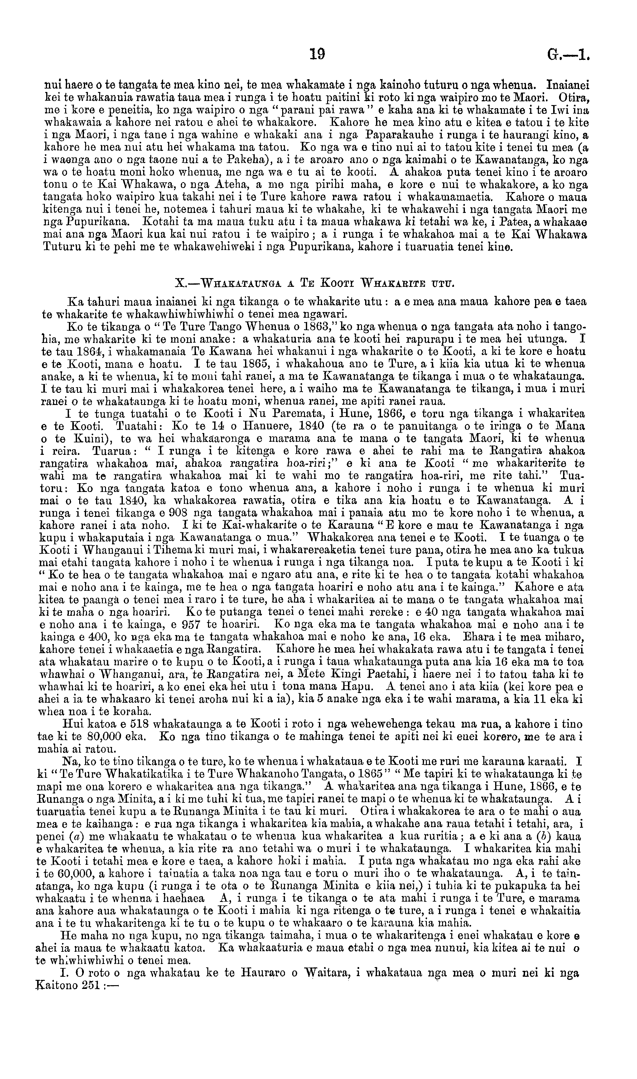nui haere ote tangata te mea kino nei, te mea whakamate i nga kainoho tuturu o nga whenua. Inaianei kei te whakanuia rawatia taua mea i runga ite hoatu paitini ki roto ki nga waipiro mo te Maori. Otira, me i kore e peneitia, ko nga waipiro o nga " parani pai rawa " e kaha ana ki te whakamate i te Iwi ina whakawaia a kahore nei ratou e ahei te whakakore. Kahore he mea kino atu e kitea e tatou ite kite i nga Maori, i nga tane i nga wahine e whakaki ana i nga Paparakauhe i runga i te haurangi kino, a kahore he mea nui atu hei whakama ma tatou. Ko nga wa e tino nui ai to tatou kite i tenei tu mea (a i waenga ano o nga taone nui a te Pakeha), a i te aroaro ano o nga kaimahi o te Kawanatanga, ko nga wa ote hoatu moni hoko whenua, me nga wa etu ai te kooti. A ahakoa puta tenei kino ite aroaro tonu o te Kai Whakawa, o nga Ateha, a me nga pirihi maha, e kore e nui te whakakore, a ko nga tangata hoko waipiro kua takahi nei ite Ture kahore rawa ratou i whakamamaetia. Kahore o maua kitenga nui i tenei he, notemea i tahuri maua ki te whakahe, ki te whakawehi i nga tangata Maori me nga Pupurikana. Kotahi ta ma maua tuku atu ita maua whakawa ki tetahi wa ke, i Patea, a whakaae mai ana nga Maori kua kai nui ratou i te waipiro; a i runga ite whakahoa mai a te Kai Whakawa Tuturu ki te pehi me te whakawehiwehi i nga Pupurikana, kahore i tuaruatia tenei kiue. X.—Whakataunga a Te Kooti Whakaeite utu. Ka tahuri maua inaianei ki nga tikanga o te whakarite utu : a e mea ana maua kahore pea e taea te whakarite te whakawhiwhiwhiwhi o tenei mea ngawari. Ko te tikanga o " Te Ture Tango Whenua o 1863," ko nga whenua o nga tangata ata noho i tangohia, me whakarite ki te moni anake : a whakaturia ana te kooti hei rapurapu ite mea hei utunga. I te tau 1864, i whakamanaia Te Kawana hei whakanui i nga whakarite o te Kooti, a ki te kore e hoatu ete Kooti, mana e hoatu. Ite tau 1865, i whakahoua ano te Ture, a i kiia kia utua ki te whenua anake, a ki te whenua, ki te moni tahi ranei, a ma te Kawanatanga te tikanga i mua o te whakataunga. I te tau ki muri mai i whakakorea tenei here, a i waiho ma te Kawanatanga te tikanga, i mua i muri ranei o te whakataunga ki te hoatu moni, whenua ranei, me apiti ranei raua. I te tunga tuatahi o te Kooti i Nu Paremata, i Hune, 1866, e toru nga tikanga i whakaritea ete Kooti. Tuatahi: Ko te 14 o Hanuere, 1840 (te ra o te panuitanga ote iringa ote Mana o te Kuini), te wa hei whakaaronga e marama ana te mana o te tangata Maori, ki te whenua i reira. Tuarua: " I runga ite kitenga e kore rawa e ahei te rahi ma te Rangatira ahakoa rangatira whakahoa mai, ahakoa rangatira hoa-riri;" e ki ana te Kooti "me whakariterite te wahi ma te rangatira whakahoa mai ki te wahi mo te rangatira hoa-riri, me rite tahi." Tuatoru: Ko nga tangata katoa e tono whenua ana, a kahore i noho i runga i te whenua ki muri mai o te tau 1840, ka whakakorea rawatia, otira e tika ana kia hoatu ete Kawanatanga. A i runga i tenei tikanga e 908 nga tangata whakahoa mai i panaia atu mo te kore noho i te whenua, a kahore ranei i ata noho. Iki te Kai-whakarite ote Karauna " E kore e mau te Kawanatanga i nga kupu i whakaputaia i nga Kawanatanga o mua." Whakakorea ana tenei ete Kooti. Ite tuanga ote Kooti i Whanganui i Tihema ki muri mai, i whakarereaketia tenei ture pana, otira he mea ano ka tukua mai etahi tangata kahore i noho ite whenua i runga i nga tikanga noa. I puta tekupu ate Kooti iki " Ko te hea o te tangata whakahoa mai e ngaro atu ana, e rite ki te hea o te tangata kotahi whakahoa mai e noho ana ite kainga, me te hea o nga tangata hoariri e noho atu ana ite kainga." Kahore e ata kitea te paanga o tenei mea i raro i te ture, he aha i whakaritea ai te mana o te tangata whakahoa mai ki te maha o nga hoariri. Ko te putanga tenei o tenei mahi rereke :e 40 nga tangata whakahoa mai e noho ana ite kainga, e 957 te hoariri. Ko nga eka ma te tangata whakahoa mai e noho ana ite kainga o 400, ko nga eka ma te tangata whakahoa mai e noho ke ana, 16 eka. Ehara ite mea miharo, kahore tenei i whakaaetia e nga Rangatira. Kahore he mea hei whakakata rawa atu ite tangata i tenei ata whakatau marire o te kupu o te Kooti, a i runga i taua whakataunga puta ana kia 16 eka ma to toa whawhai o Whanganui, ara, te Rangatira nei, a Mete Kingi Paetahi, i haere nei i to tatou taha ki te whawhai ki te hoariri, ako enei eka hei utu i tona mana Hapu. A tenei ano i ata kiia (kei kore pea e ahei a ia te whakaaro ki tenei aroha nui ki a ia), kia 5 anake nga eka i te wahi marama, a kia 11 eka ki whea noa i te koraha. Hui katoa e 518 whakataunga a te Kooti i roto i nga wehewehenga tekau ma rua, a kahore i tino tae ki te 80,000 eka. Ko nga tino tikanga o te mahinga tenei te apiti nei ki enei korero, me te ara i mahia ai ratou. Na, ko te tino tikanga ote ture, ko te whenua i whakataua ete Kooti me ruri me karauna karaati. I ki " Te Ture Whakatikatika i te Ture Whakanoho Tangata, o 1865 " " Me tapiri ki te whakataunga ki te mapi me ona korero e whakaritea ana nga tikanga." A whakaritea ana nga tikanga i Hune, 1866, ete Runanga o nga Minita, aiki me tuhi ki tua, me tapiri ranei te mapi ote whenua ki te whakataunga. A i tuaruatia tenei kupu ate Runanga Minita ite tau ki muri. Otira i whakakorea te ara ote mahi o aua mea e te kaihanga : e rua nga tikanga i whakaritea kia mahia, a whakahe ana raua tetahi i tetahi, ara, i penei (a) me whakaatu te whakatau ote whenua kua whakaritea a kua ruritia; ae ki ana a (b) kaua e whakaritea te whenua, a kia rite ra ano tetahi wa o muri ite whakataunga. I whakaritea kia mahi te Kooti i tetahi mea e kore e taea, a kahore hoki i mahia. I puta nga whakatau mo nga eka rahi ake ite 60,000, a kahore i tainatia a taka noa nga tau e toru o muri iho o te whakataunga. A, i te tainatanga, ko nga kupu (i runga i te ota o te Runanga Minita e kiia nei,) i tuhia ki te pukapuka ta hei whakaatu ite whenua i haehaea A, i runga ite tikanga ote ata mahi i runga ite Ture, e marama ana kahore aua whakataunga o te Kooti i mahia ki nga ritenga o te 