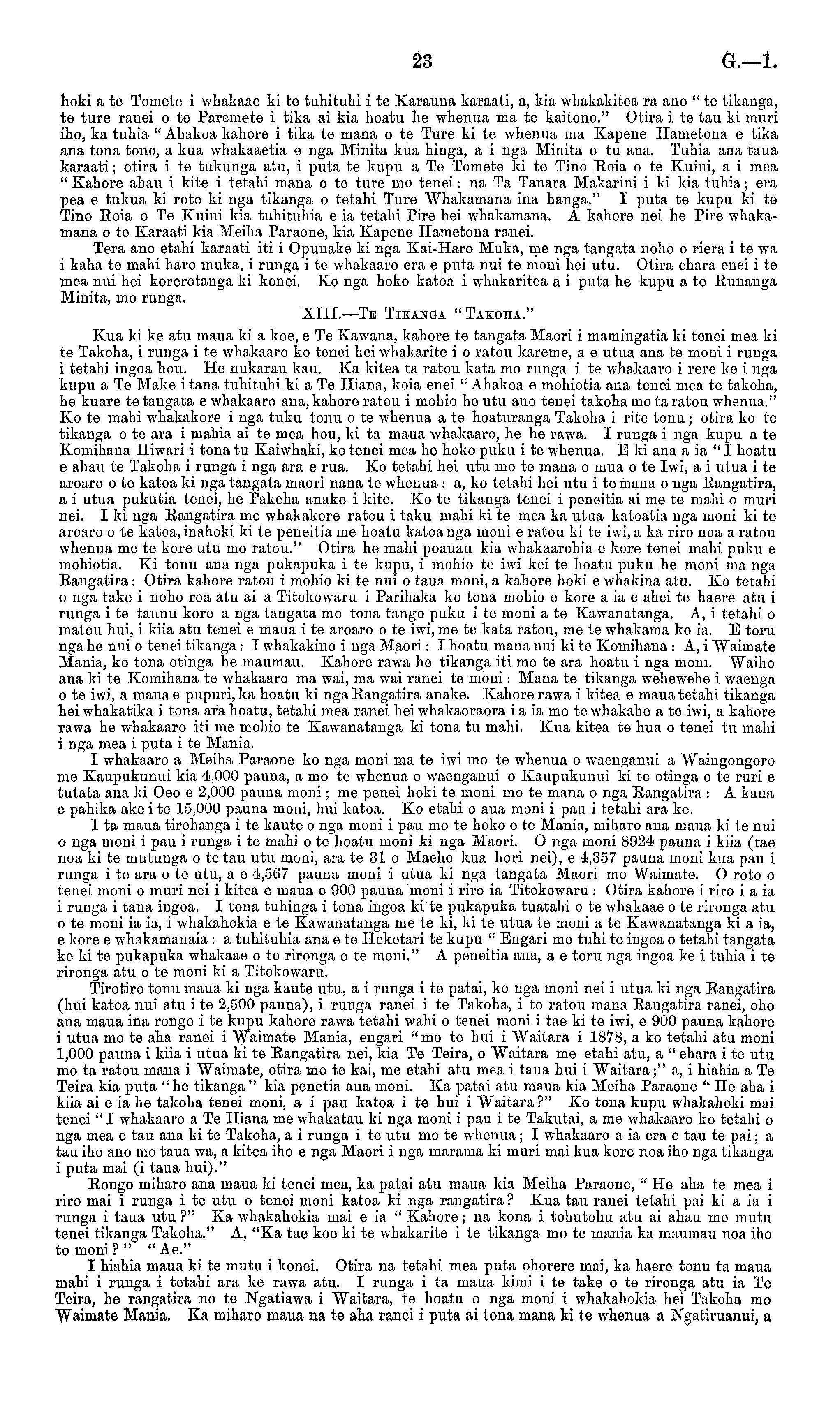 hoki a te Tomete i whakaae ki te tuhituhi i te Karauna karaati, a, kia whakakitea ra ano "te tikanga, te ture ranei ote Paremete i tika ai kia hoatu he whenua ma te kaitono." Otira ite tau ki muri iho, ka tuhia " Ahakoa kahore i tika te mana o te Ture ki te whenua ma Kapene Hametona e tika ana tona tono, a kua whakaaetia c nga Minita kua hinga, a i nga Minita e tu ana. Tuhia ana taua karaati; otira i te tukunga atu, i puta te kupu aTe Tomete ki te Tino Roia o te Kuini, a i mea " Kahore ahau i kite i tetahi mana o te ture mo tenei: na Ta Tanara Makarini i ki kia tuhia; era pea e tukua ki roto ki nga tikanga o tetahi Ture Whakamana ina hanga." I puta te kupu ki te Tino Roia o Te Kuini kia tuhituhia eia tetahi Pire hei whakamana. A kahore nei he Pire whakamana o te Karaati kia Meiha Paraone, kia Kapene Hametona ranei. Tera ano etahi karaati iti i Opunake ki nga Kai-Haro Muka, me nga tangata noho o riera i te wa i kaha te mahi haro muka, i runga ite whakaaro era e puta nui te moni hei utu. Otira ehara enei ite mea nui hei korerotanga ki konei. Ko nga hoko katoa i whakaritea a i puta he kupu ate Runanga Minita, mo runga. XIIL—Te Tikanga "Takoha." Kua ki ke atu maua ki a koe, e Te Kawana, kahore te tangata Maori i mamingatia ki tenei mea ki te Takoha, i runga i te whakaaro ko tenei hei whakarite i o ratou kareme, a e utua ana te moni i runga i tetahi ingoa hou. He nukarau kau. Ka kitea ta ratou kata mo runga ite whakaaro i rere ke i nga kupu a Te Make i tana tuhituhi ki a Te Hiana, koia enei " Ahakoa e mohiotia ana tenei mea te takoha, he kuare te tangata e whakaaro ana, kahore ratou i mohio he utu ano tenei takoha mo ta ratou whenua." Ko te mahi whakakore i nga tuku tonu ote whenua ate hoaturanga Takoha i rite tonu; otira ko te tikanga ote ara i mahia ai te mea hou, ki ta maua whakaaro, he he rawa. I runga i nga kupu ate Komihana Hiwari i tona tu Kaiwhaki, ko tenei mea he hoko puku ite whenua. Eki ana aia " I hoatu e ahau te Takoha i runga i nga ara e rua. Ko tetahi hei utu mo te mana o mua ote Iwi, a i utua ite aroaro o te katoa ki nga tangata maori nana te whenua : a, ko tetahi hei utu i te mana o nga Rangatira, a i utua pukutia tenei, he Pakeha anake i kite. Ko te tikanga tenei i peneitia ai me te mahi o muri nei. Iki nga Rangatira me whakakore ratou i taku mahi ki te mea ka utua katoatia nga moni ki te aroaro o te katoa, inahoki ki te peneitia me hoatu ka.toa nga moni e ratou ki te iwi, a ka riro noa a ratou whenua me te kore utu mo ratou." Otira he mahi poauau kia whakaarohia e kore tenei mahi puku e mohiotia. Ki tonu ana nga pukapuka ite kupu, i mohio te iwi kei te hoatu puku he moni ma nga Rangatira: Otira kahore ratou i mohio ki te nui o taua moni, a kahore hoki o whakina atu. Ko tetahi o nga take i noho roa atu ai a Titokowaru i Parihaka ko tona mohio e kore a ia e ahei te haere atu i runga ite taunu kore a nga tangata mo tona tango puku ite moni ate Kawanatanga. A, i tetahi o matou hui, i kiia atu tenei e maua ite aroaro ote iwi, me te kata ratou, me te whakama ko ia. E toru nga he nui o tenei tikanga: I whakakino i nga Maori: I hoatu mana nui ki te Komihana :A, i Waimate Mania, ko tona otinga he maumau. Kahore rawa he tikanga iti mo te ara hoatu i nga mom. Waiho ana ki te Komihana te whakaaro ma wai, ma wai ranei te moni: Mana te tikanga wehewehe i waenga ote iwi, a manae pupuri, ka hoatu ki nga Rangatira anake. Kahore rawa i kitea e maua tetahi tikanga hei whakatika i tona ara hoatu, tetahi mea ranei hei whakaoraora i a ia mo te whakahe a te iwi, a kahore rawa he whakaaro iti me mohio te Kawanatanga ki tona tu mahi. Kua kitea te hua o tenei tu mahi i nga mea i puta i te Mania. I whakaaro a Meiha Paraone ko nga moni ma te iwi mo te whenua o waenganui a Waingongoro me Kaupukunui kia 4,000 pauna, a mo te whenua o waenganui o Kaupukunui ki te otinga o te ruri e tutata ana ki Oeo e 2,000 pauna moni; me penei hoki te moni mo te mana o nga Rangatira : A kaua e pahika ake ite 15,000 pauna moni, hui katoa. Ko etahi o aua moni i pau i tetahi ara ke. I ta maua tirohanga i te kaute o nga moni i pau mo te hoko o te Mania, miharo ana maua ki te nui o nga moni i pau i runga ite mahi ote hoatu moni ki nga Maori. O nga moni 8924 pauna i kiia (tae noa ki te mutunga o te tau utu moni, ara te 31 o Maehe kua hori nei), e 4,357 pauna moni kua pau i runga ite ara ote utu, a e 4,567 pauna moni i utua ki nga tangata Maori mo Waimate. O roto o tenei moni o muri nei i kitea e maua e 900 pauna moni i riro ia Titokowaru : Otira kahore i riro i a ia i runga i tana ingoa. I tona tuhinga i tona ingoa ki te pukapuka tuatahi ote whakaae ote rironga atu o te moni ia ia, i whakahokia e te Kawanatanga me te ki, ki te utua te moni a te Kawanatanga ki a ia, e kore e whakamanaia : a tuhituhia ana e te Heketari te kupu " Engari me tuhi te ingoa o tetahi tangata ke ki te pukapuka whakaae ote rironga ote moni." A peneitia ana, a e toru nga ingoa ke i tuhia ite rironga atu o te moni ki a Titokowaru, Tirotiro tonu maua ki nga kaute utu, a i runga i te patai, ko nga moni nei i utua ki nga Rangatira (hui katoa nui atu i te 2,500 pauna), i runga ranei i te Takoha, i to ratou mana Rangatira ranei, oho ana maua ina rongo i te kupu kahore rawa tetahi wahi o tenei moni i tae ki te iwi, e 900 pauna kahore i utua mo te aha ranei i Waimate Mania, engari "mo te hui i Waitara i 1878, a ko tetahi atu moni 1,000 pauna i kiia i utua ki te Rangatira nei, kia Te Teira, o Waitara me etahi atu, a " ehara i te utu mo ta ratou mana i Waimate, otira mo te kai, me etahi atu mea i taua hui i Waitara;" a, i hiahia aTe Teira kia puta "he tikanga " kia penetia aua moni. Ka patai atu maua kia Meiha Paraone "He aha i kiia ai eia he takoha tenei moni, a i pau katoa ite hui i Waitara?" Ko tona kupu whakahoki mai tenei "I whakaaro a Te Hiana me whakatau ki nga moni i pau i te Takutai, a me whakaaro ko tetahi o nga mea e tau ana ki te Takoha, a i runga i te utu mo te whenua; I whakaaro aia era e tau te pai; a tau iho ano mo taua wa, a kitea iho e nga Maor